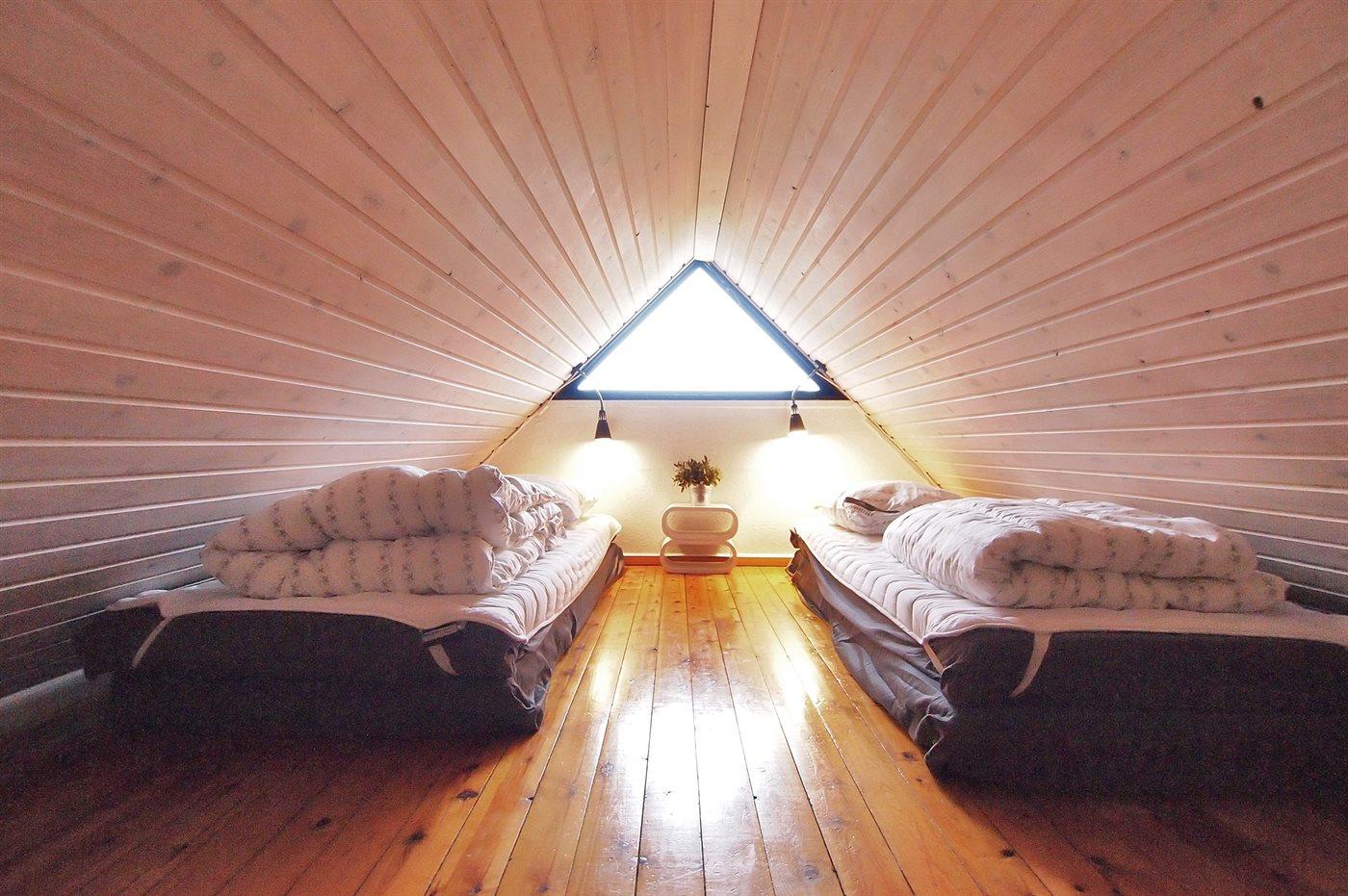 Bemærk, at to af sovepladserne befinder sig på husets hems.