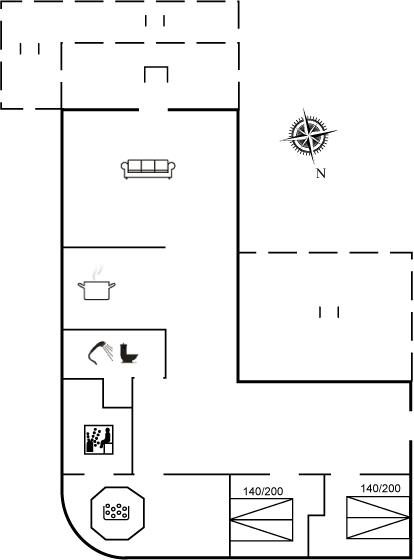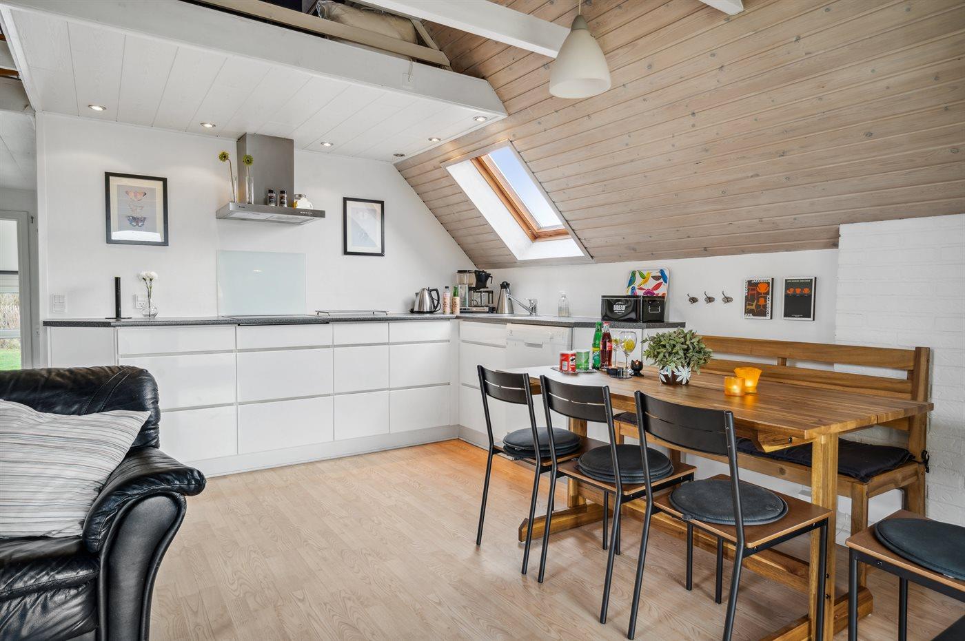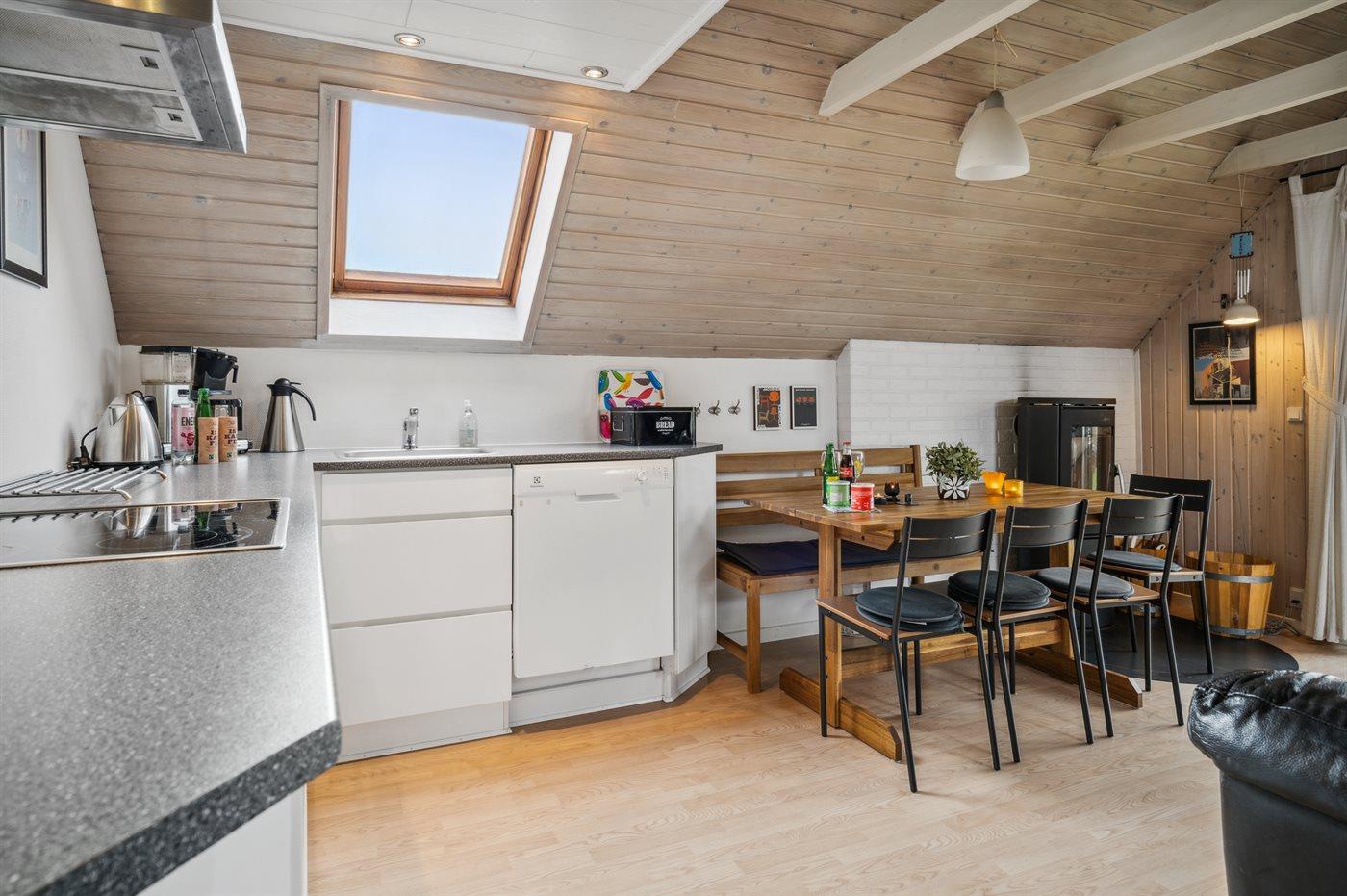 Køkkenet er udstyret med 1 køleskab. Der er 4 elkogeplader, varmluftovn, mikrobølgeovn samt opvaskemaskine.