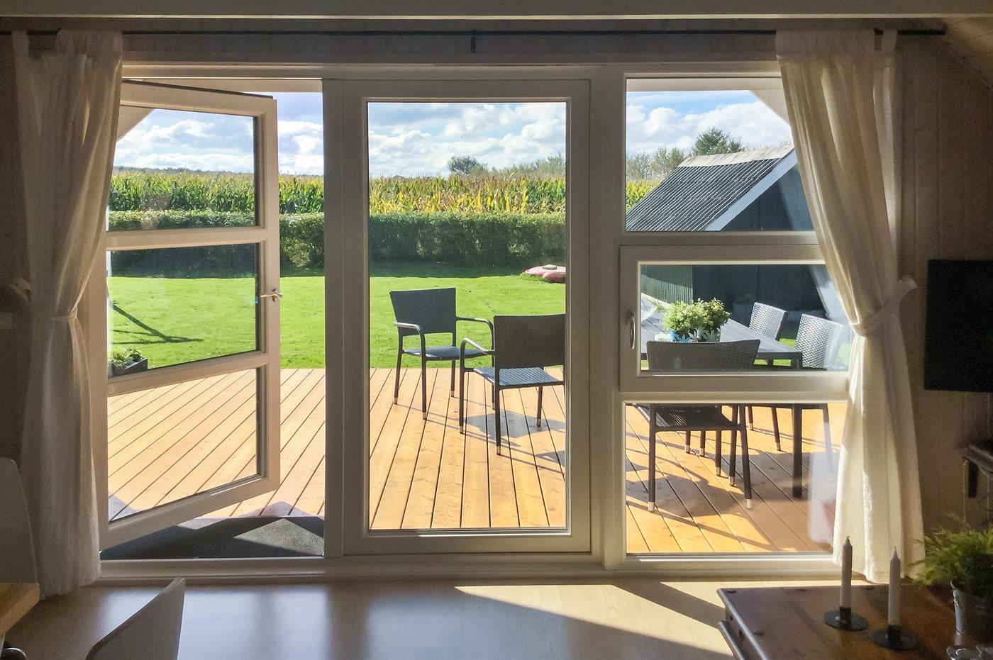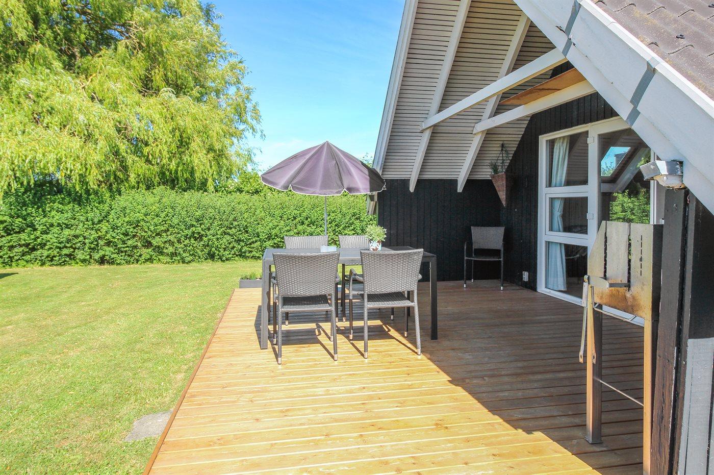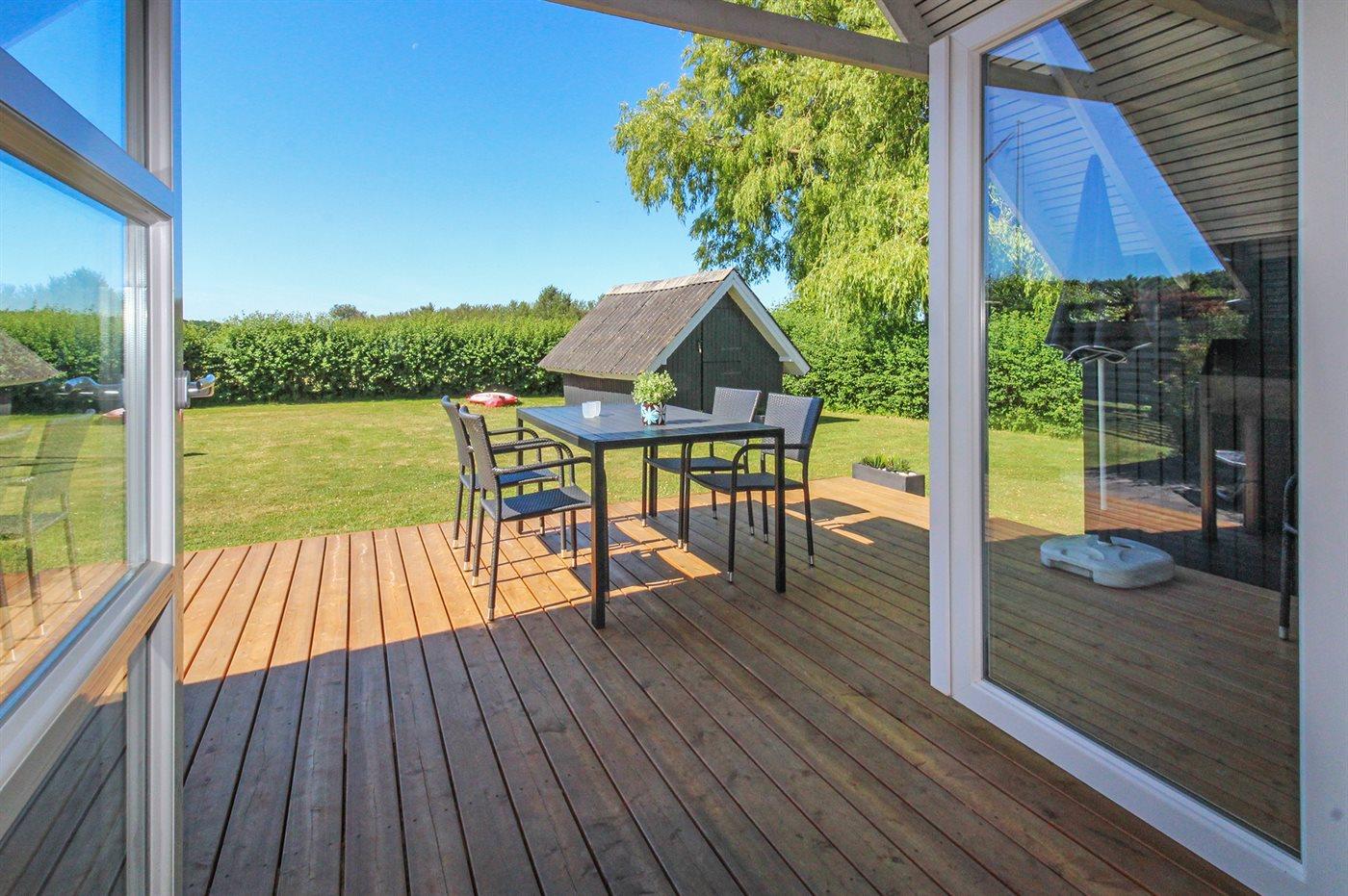 Bag huset findes der en skøn, delvist overdækket og sydvendt terrasse, hvorfra der er udsigt til åbne marker og skov.