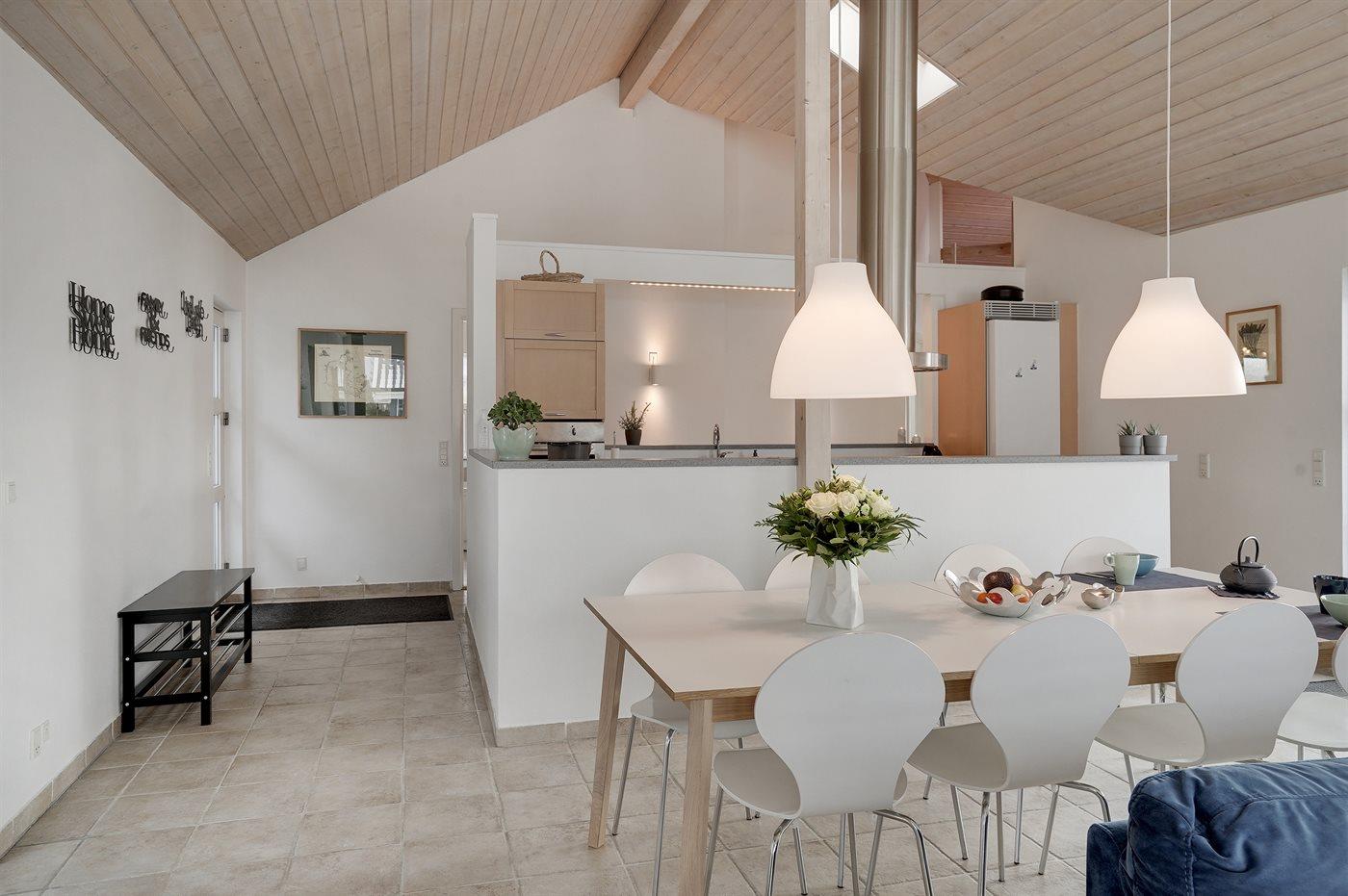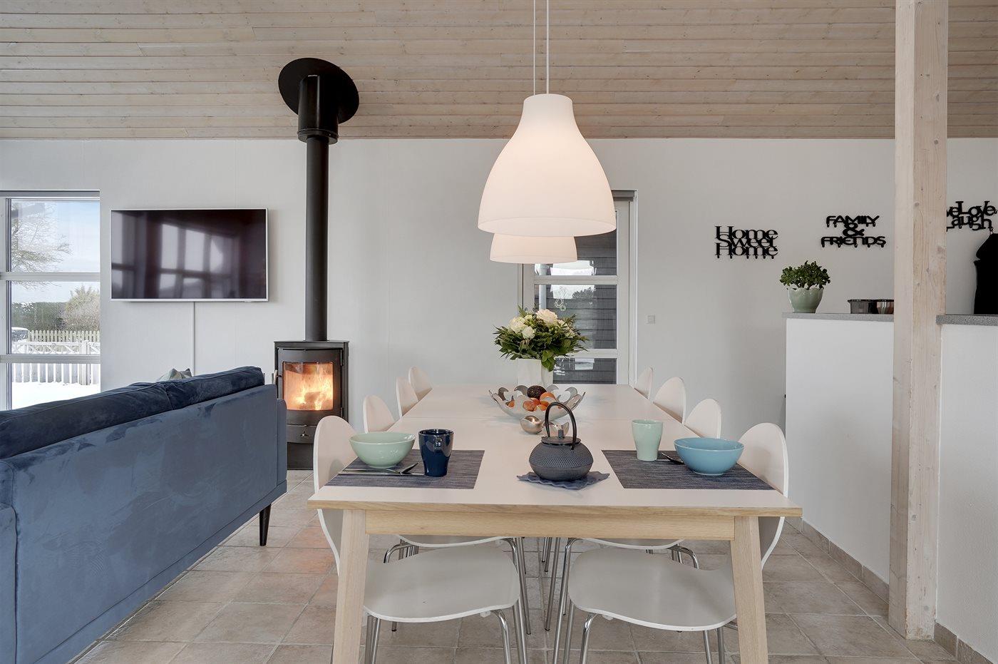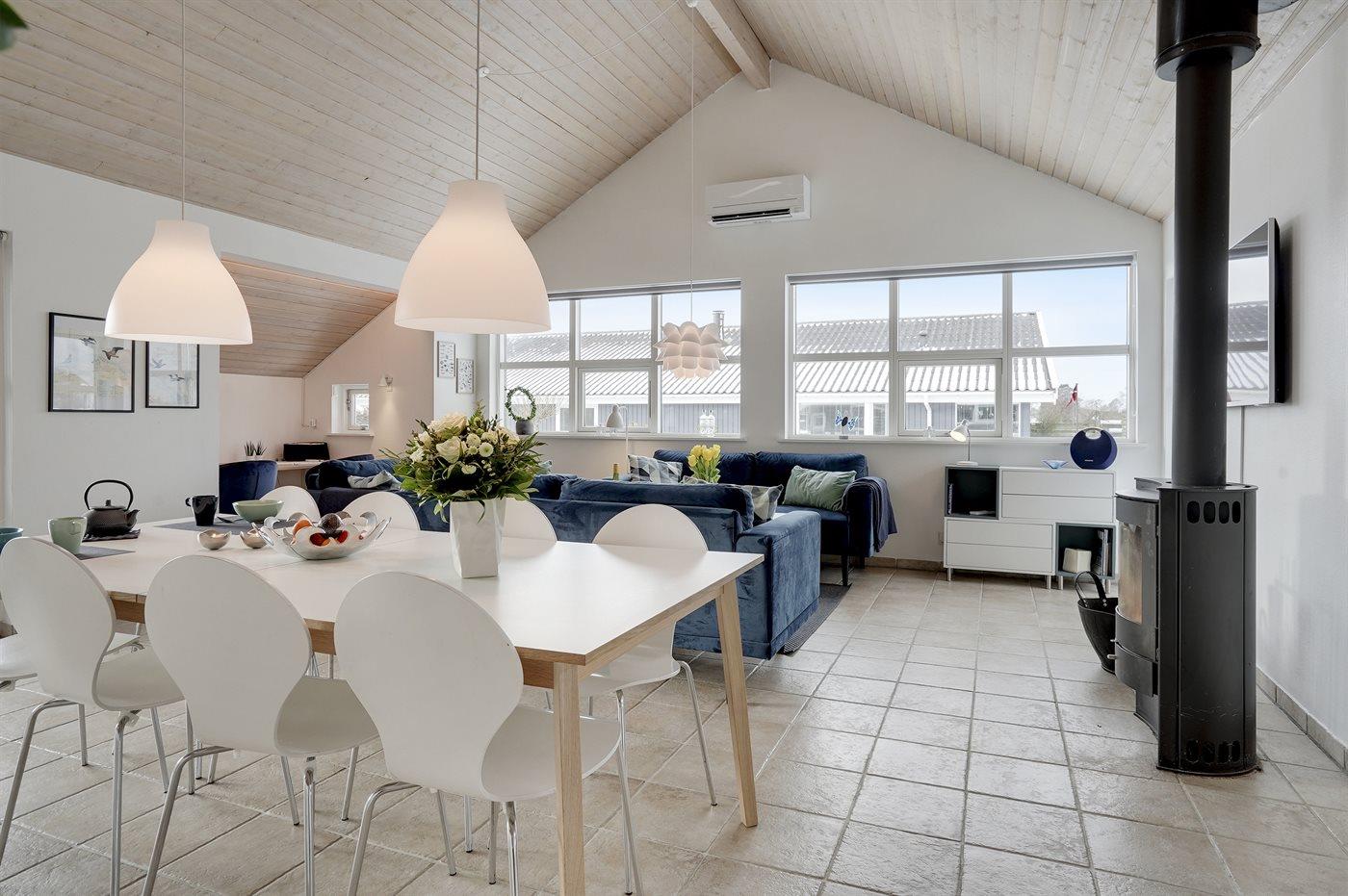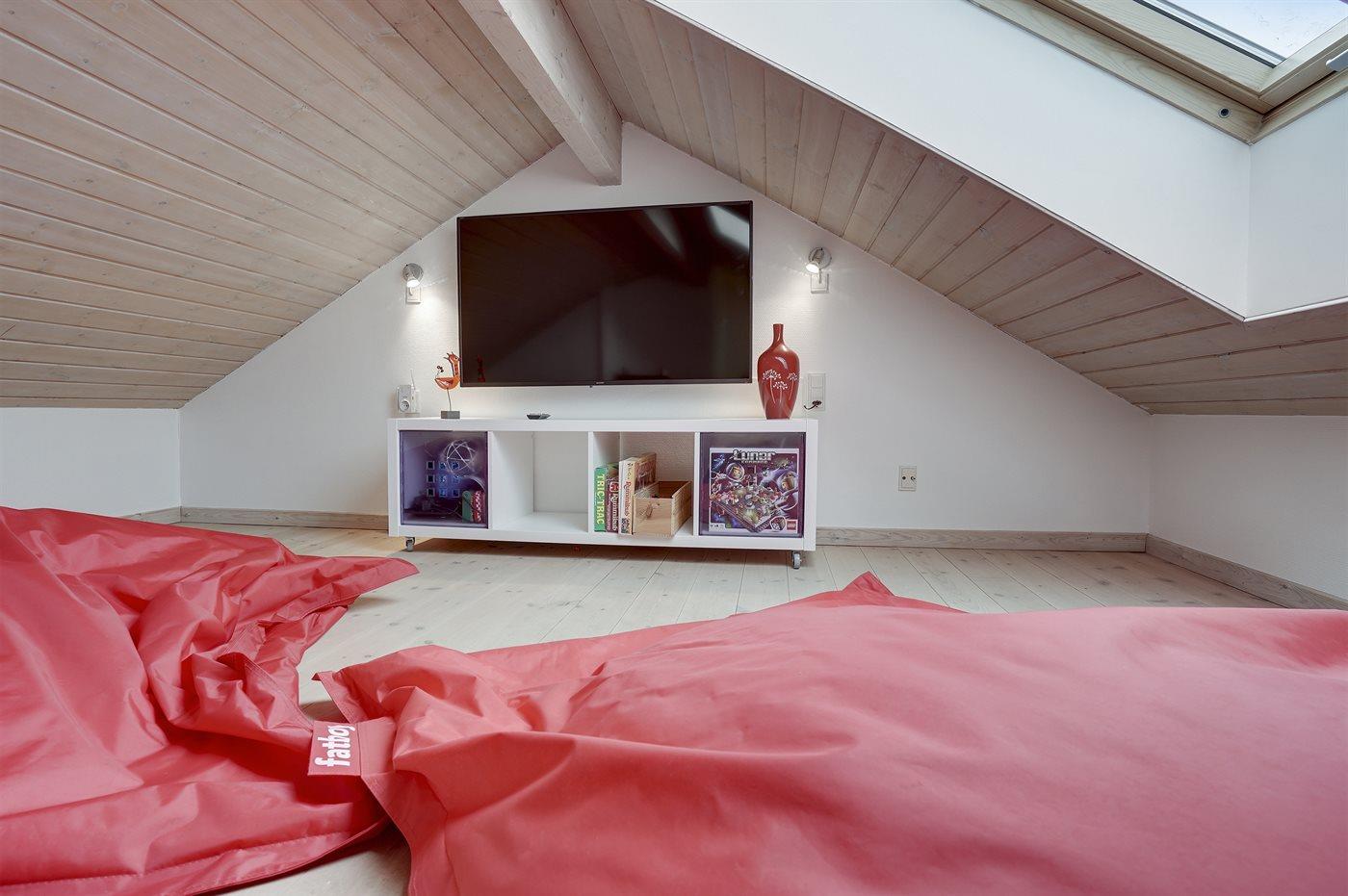 Huset er lyst og rummeligt - og blandt de få i området, som tilbyder 4 soveværelser - alle med dobbeltsenge og skabsplads. Det ene værelse er beliggende i annekset med eget toilet og bryggers - blot et enkelt skridt fra hovedhuset. Husets store badeværelse indeholder bruser samt et 2 personers spabad. På husets hems findes en fin hyggeafdeling med stor fladskærm, FATBOY sækkestole og mulighed for at opkoble egen Nintendo, etc. Husets stue, hvorfra der er udgang til den syd-/vestvendte terrasse, ligger i forbindelse med spiseafdelingen og det åbne køkken. Møblerne er moderne og behagelige. I stuen er yderligere indrettet en lille alkove, hvorfra det er muligt at arbejde - eller ungerne kan sidde og tegne. I stuen findes endnu et stort smart TV med danske, nordiske og tyske tv-kanaler, Harman Kardon bluetooth højttaler og pejs. Huset har lynhurtigt fibernet, og er desuden udstyret med varmepumpe/aircondition, således at det kan bruges året rundt. Der er terrasser/hyggekroge mod vest, øst og syd/vest. Huset er moderniseret i efteråret 2020.