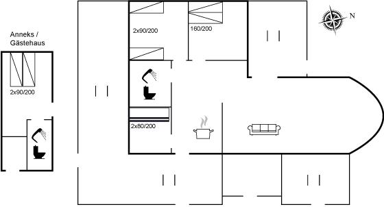 Der er i alt 4 soveværelser. Sovepladserne fordeler sig på: 2 sovepladser i dobbeltseng. 4 sovepladser i enkeltsenge. 2 sovepladser i køjeseng. 2 af disse sovepladser befinder sig i et anneks. Derudover er der 1 stk. barneseng.