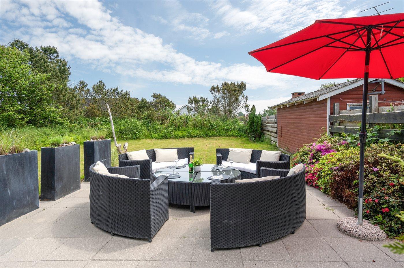 Ferieboligen er beliggende på en 850 m² stor havegrund. Der er 70 m til havet. Nærmeste forretning er beliggende i en afstand af 3000 m. Til ferieboligen hører 100 m² terrasseareal. Desuden er der 15 m² overdækket terrasse. Terrassevarmer til rådighed. Udendørs bruser. Parkering ved ferieboligen.
