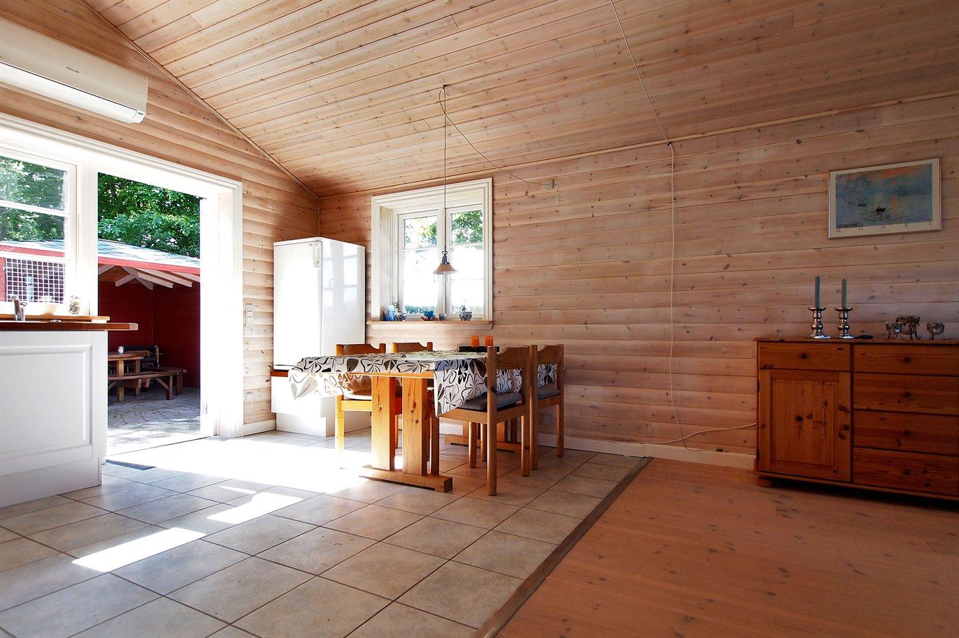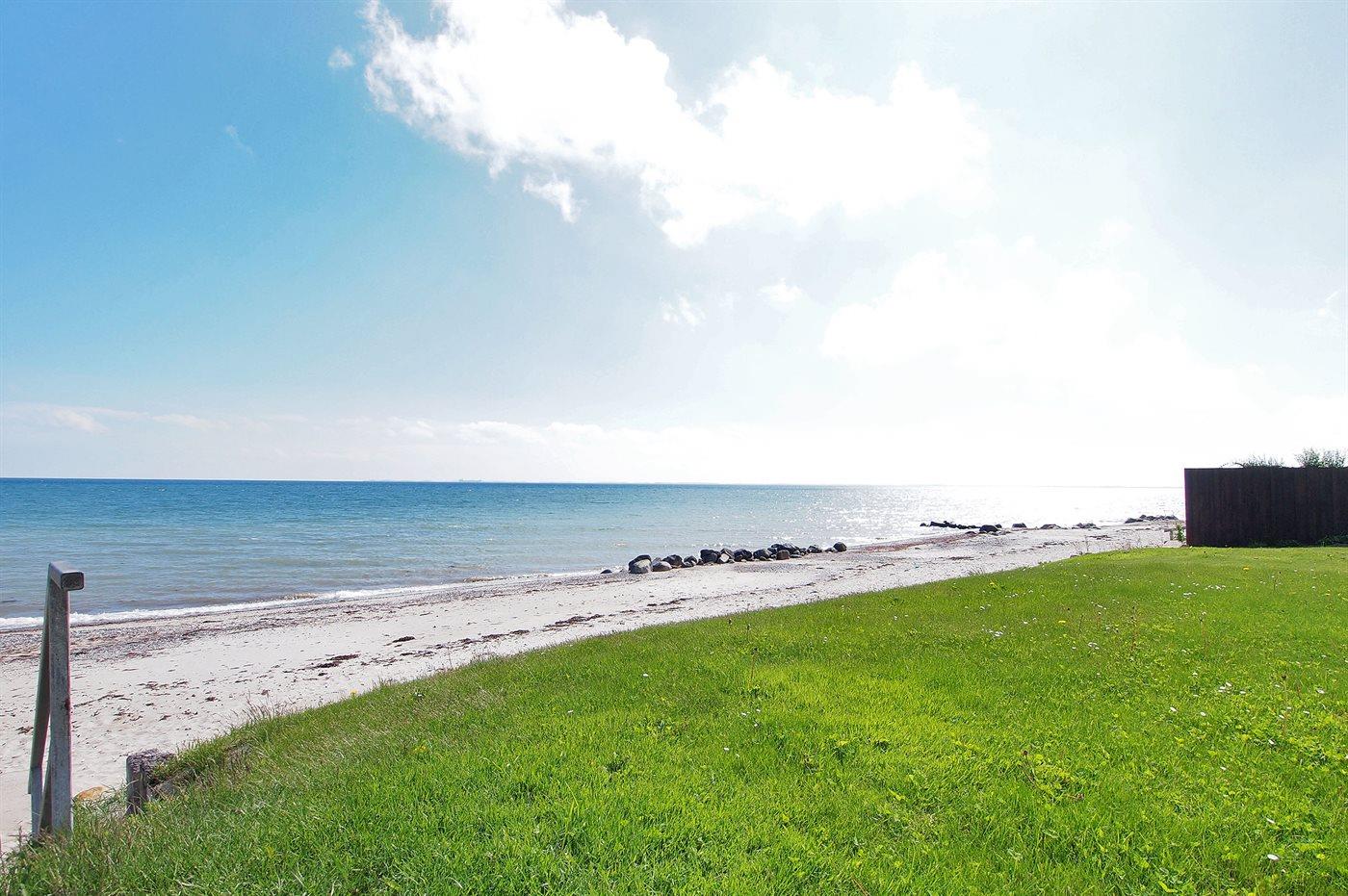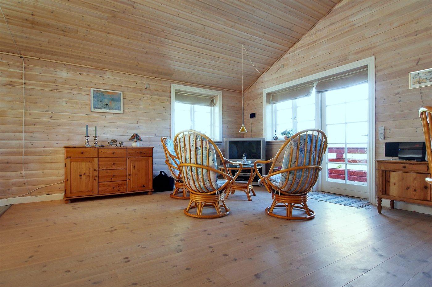 Rummeligt sommerhus beliggende lige ved stranden ud mod Kattegat. Huset er åbent med lofter til kip, og 2 af sovepladserne befinder sig på husets hems.