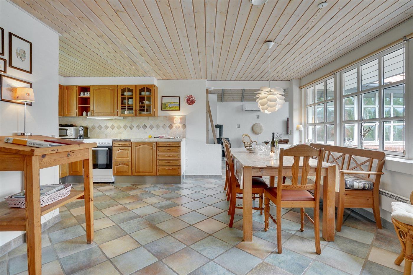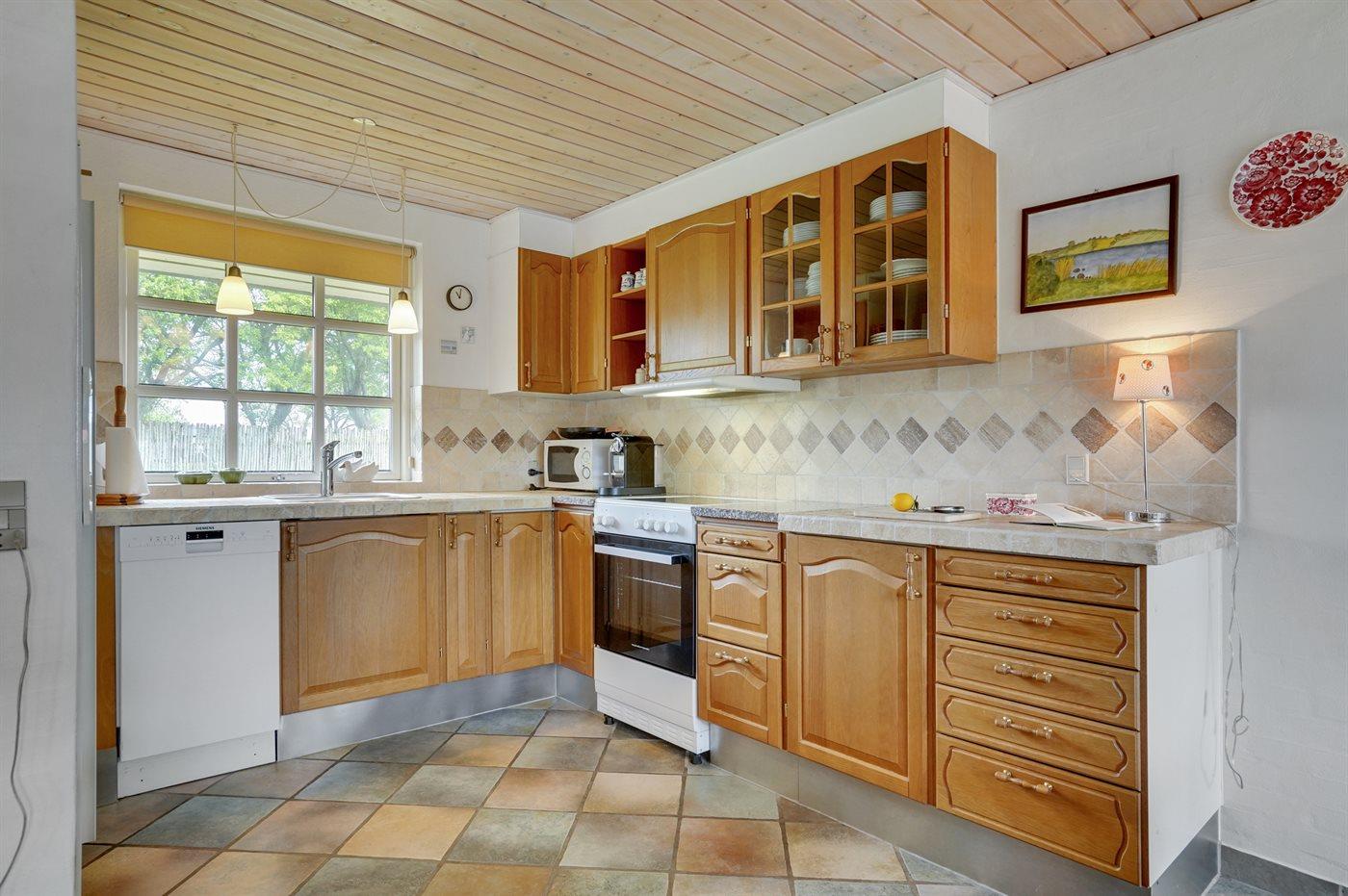 Køkkenet er udstyret med 1 amerikansk køleskab. Der er 4 elkogeplader, varmluftovn, mikrobølgeovn samt opvaskemaskine.