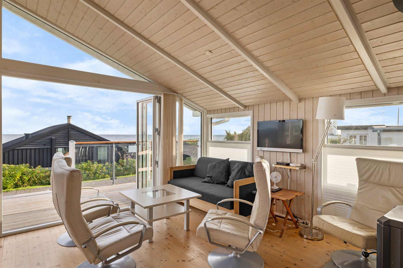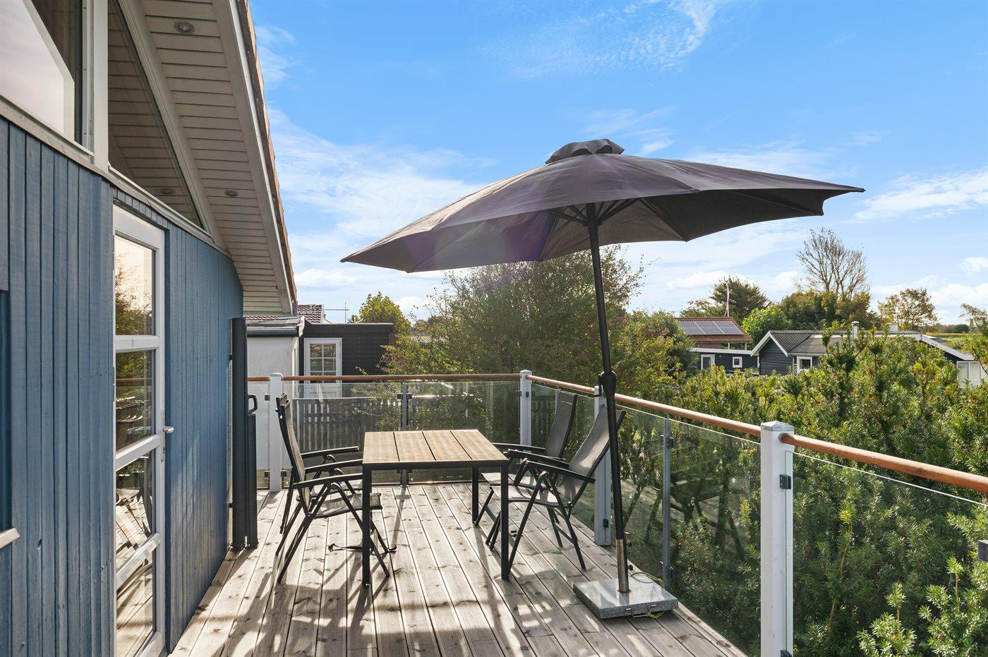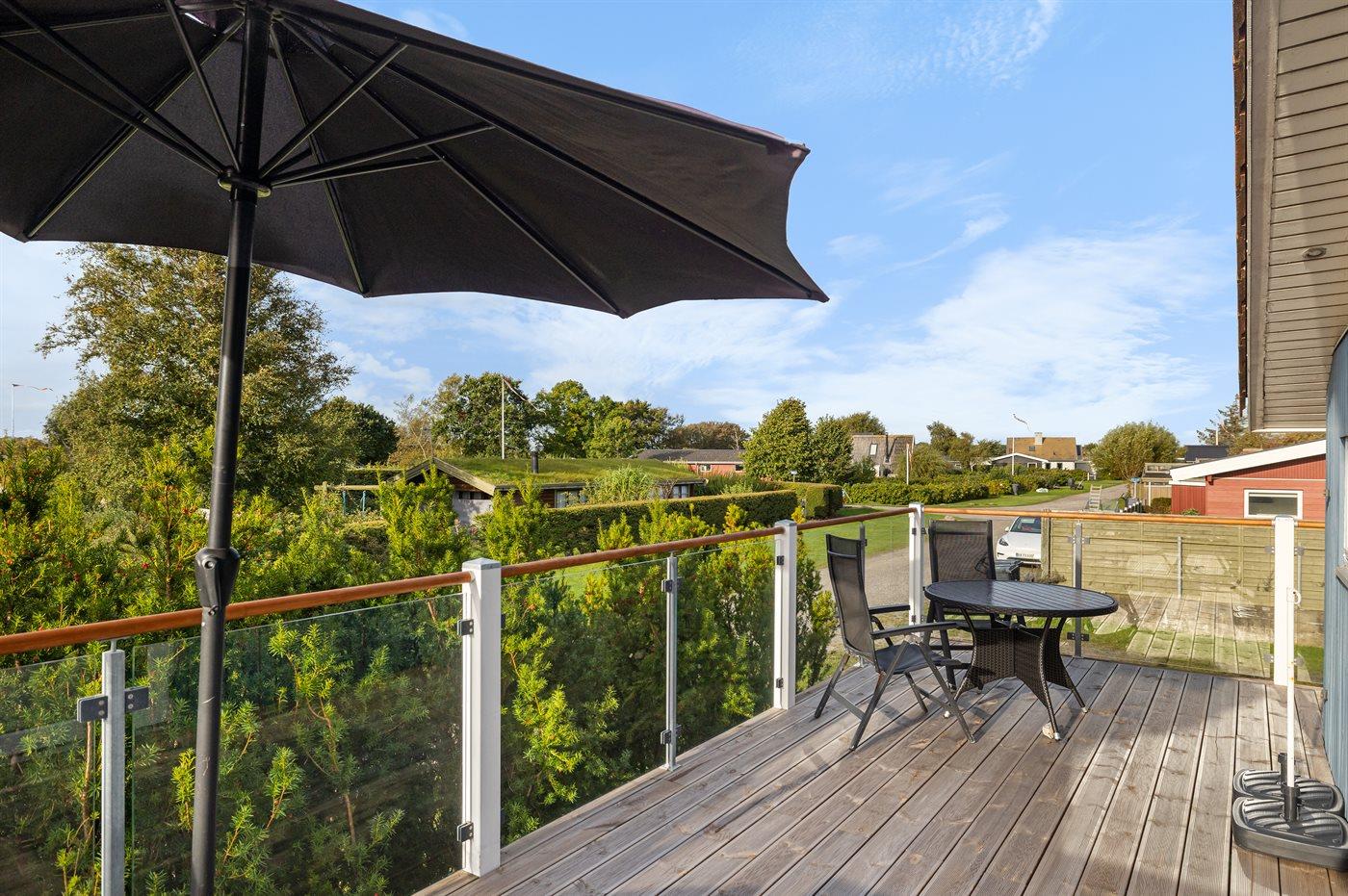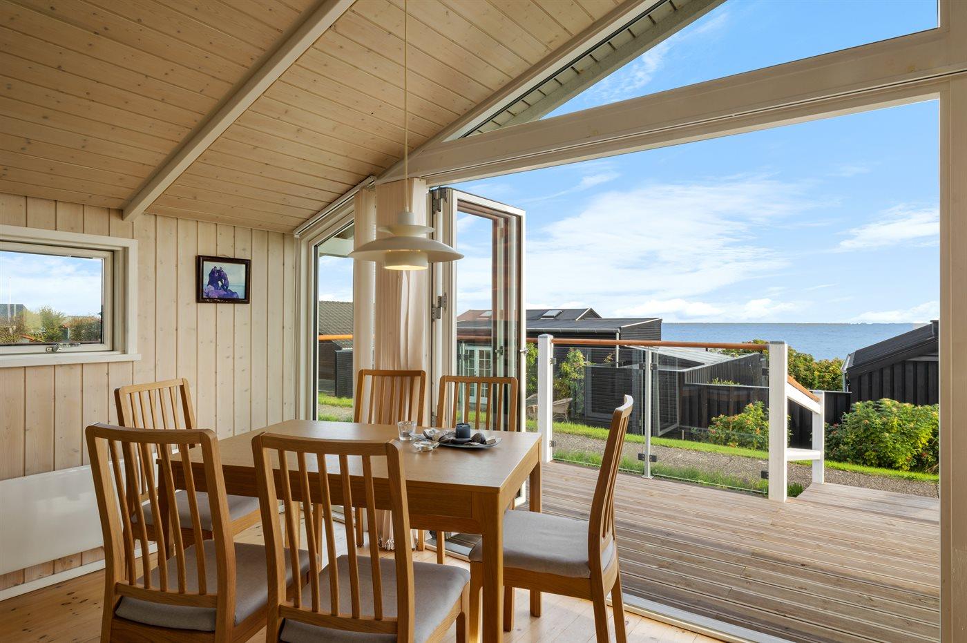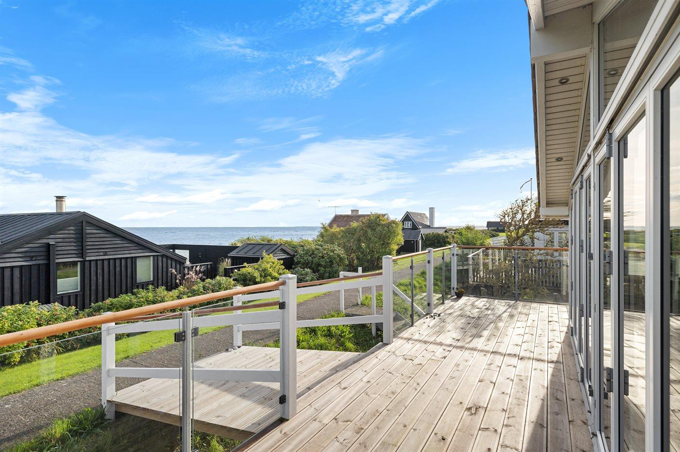 Fra både husets øverste etage og den dejlige terrasse foran huset, er der udsigt ud over vandet. Terrassen går hele vejen rundt om huset, så der altid mulighed for læ på selv blæsende dage.
