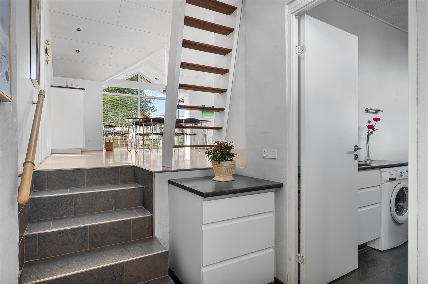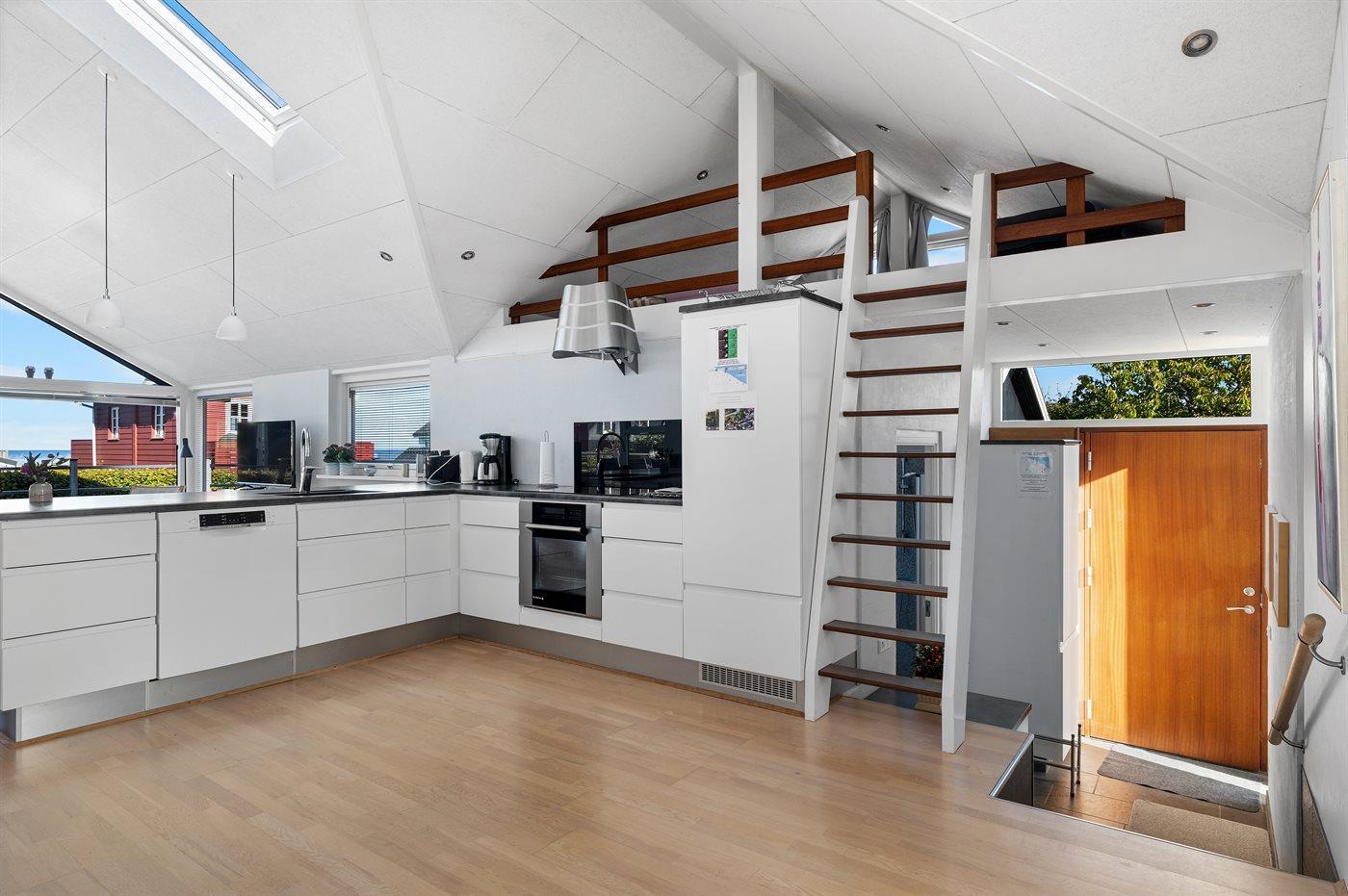 Køkkenet er udstyret med 1 køleskab. Der er 4 keramiske kogeplader, varmluftovn, mikrobølgeovn samt opvaskemaskine.