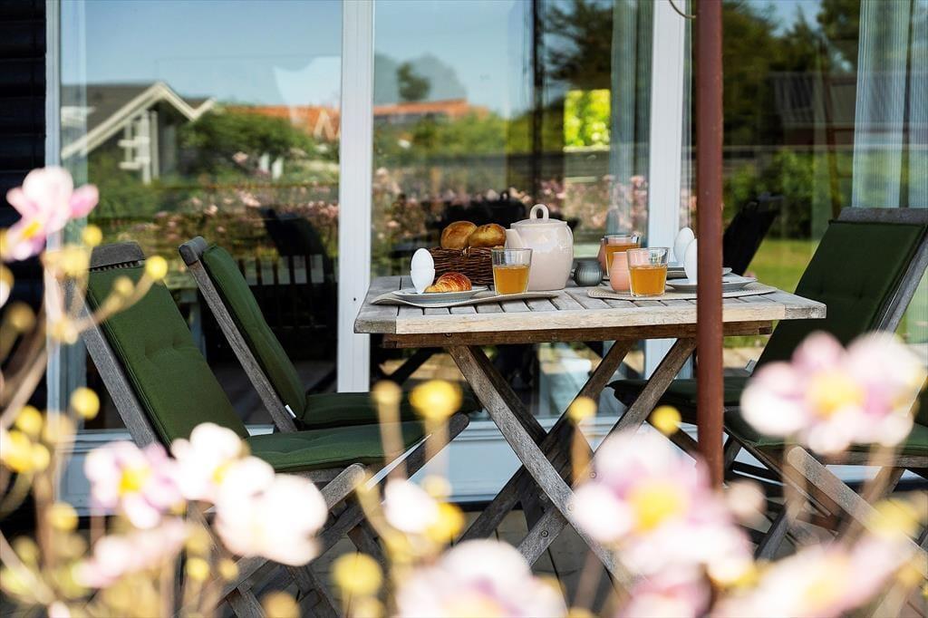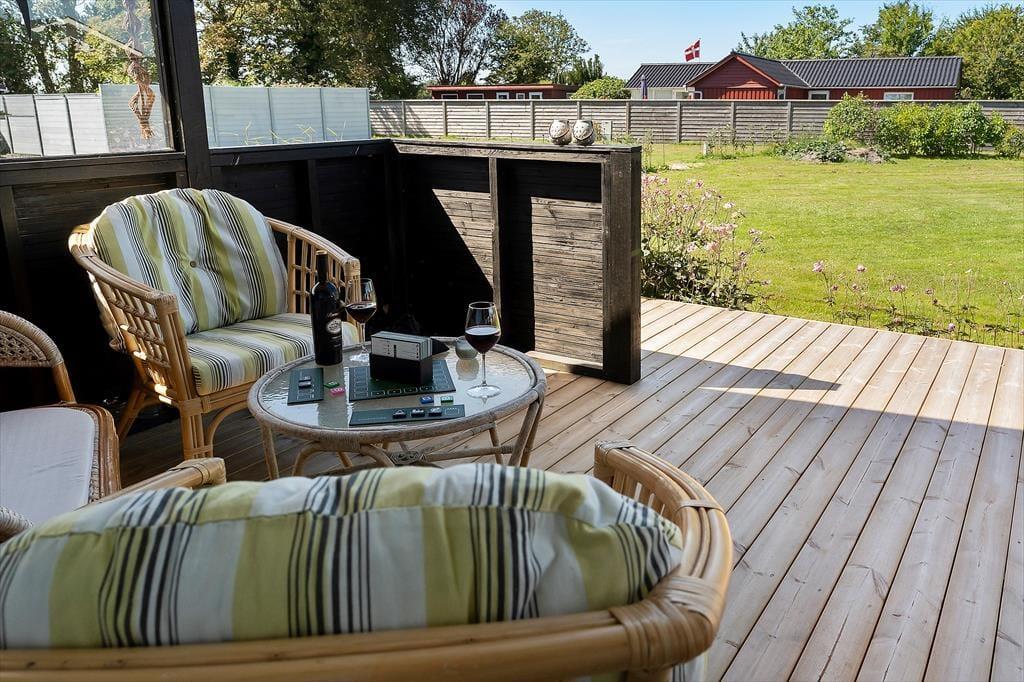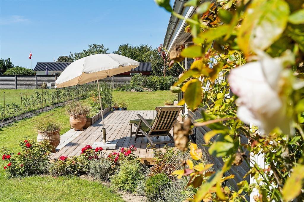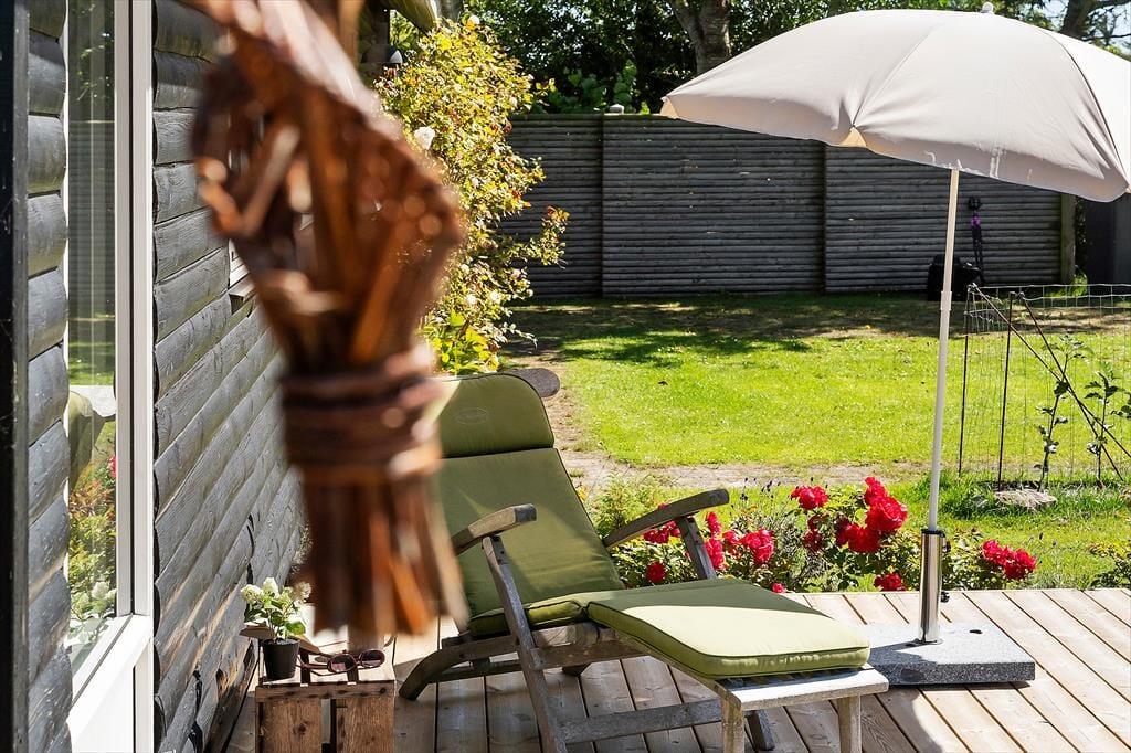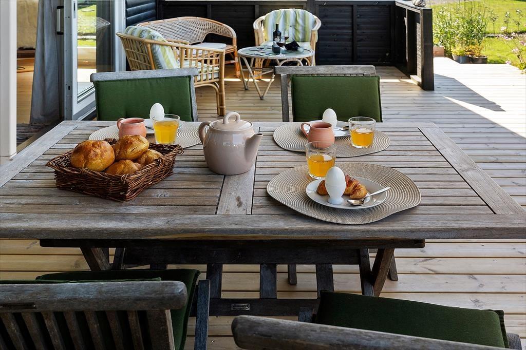 Fra stuen er der direkte udgang til stor, vestvendt terrasse (halvdelen overdækket) med terrassemøbler og fantastiske solnedgange. Grill forefindes. Stor græsplæne. Mellem stuen og køkkenet et opholdsrum med TV (da., nor., sv. en. og tyske programmer) og gratis trådløst fibernet, som dækker hele huset. Huset har brændeovn, el-radiatorer og en energibesparende varmepumpe.