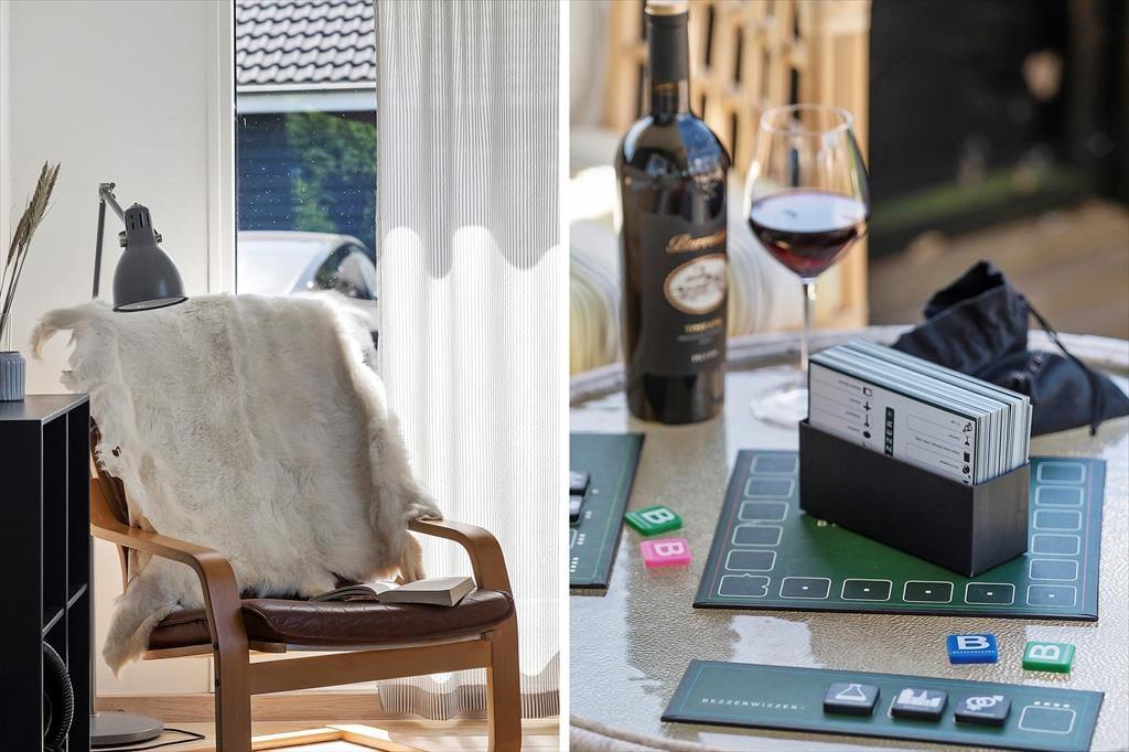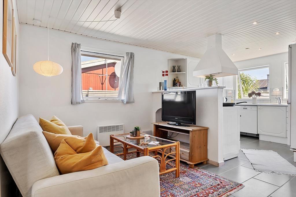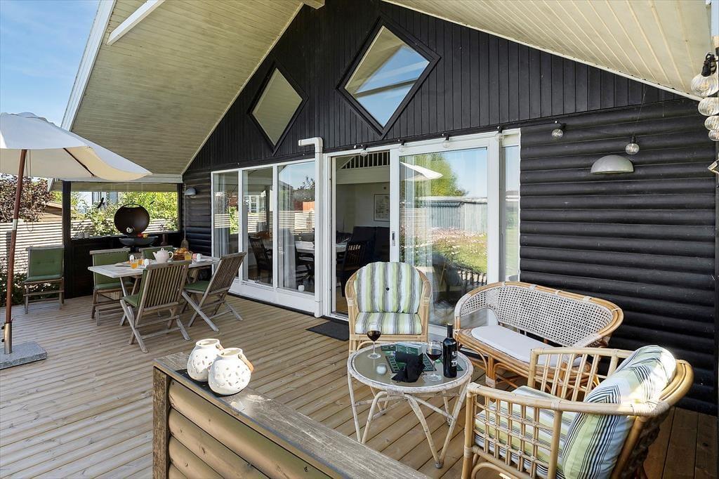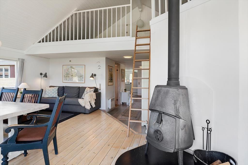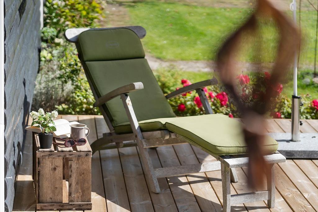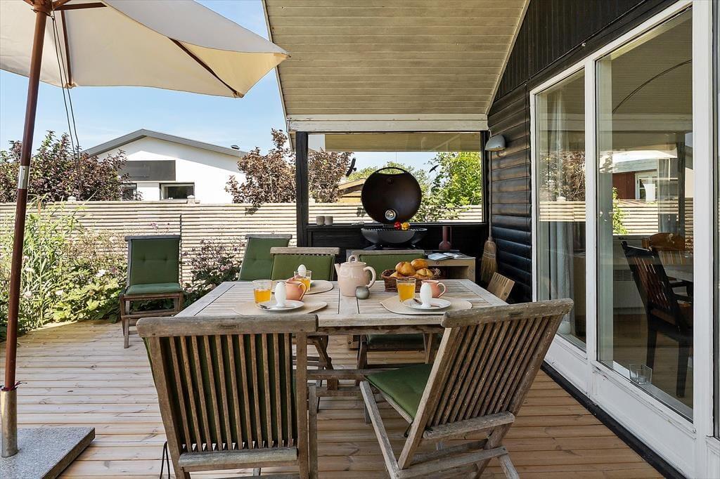 Fra stuen er der direkte udgang til stor, vestvendt terrasse (halvdelen overdækket) med terrassemøbler og fantastiske solnedgange. Grill forefindes. Stor græsplæne. Mellem stuen og køkkenet et opholdsrum med TV (da., nor., sv. en. og tyske programmer) og gratis trådløst fibernet, som dækker hele huset. Huset har brændeovn, el-radiatorer og en energibesparende varmepumpe.