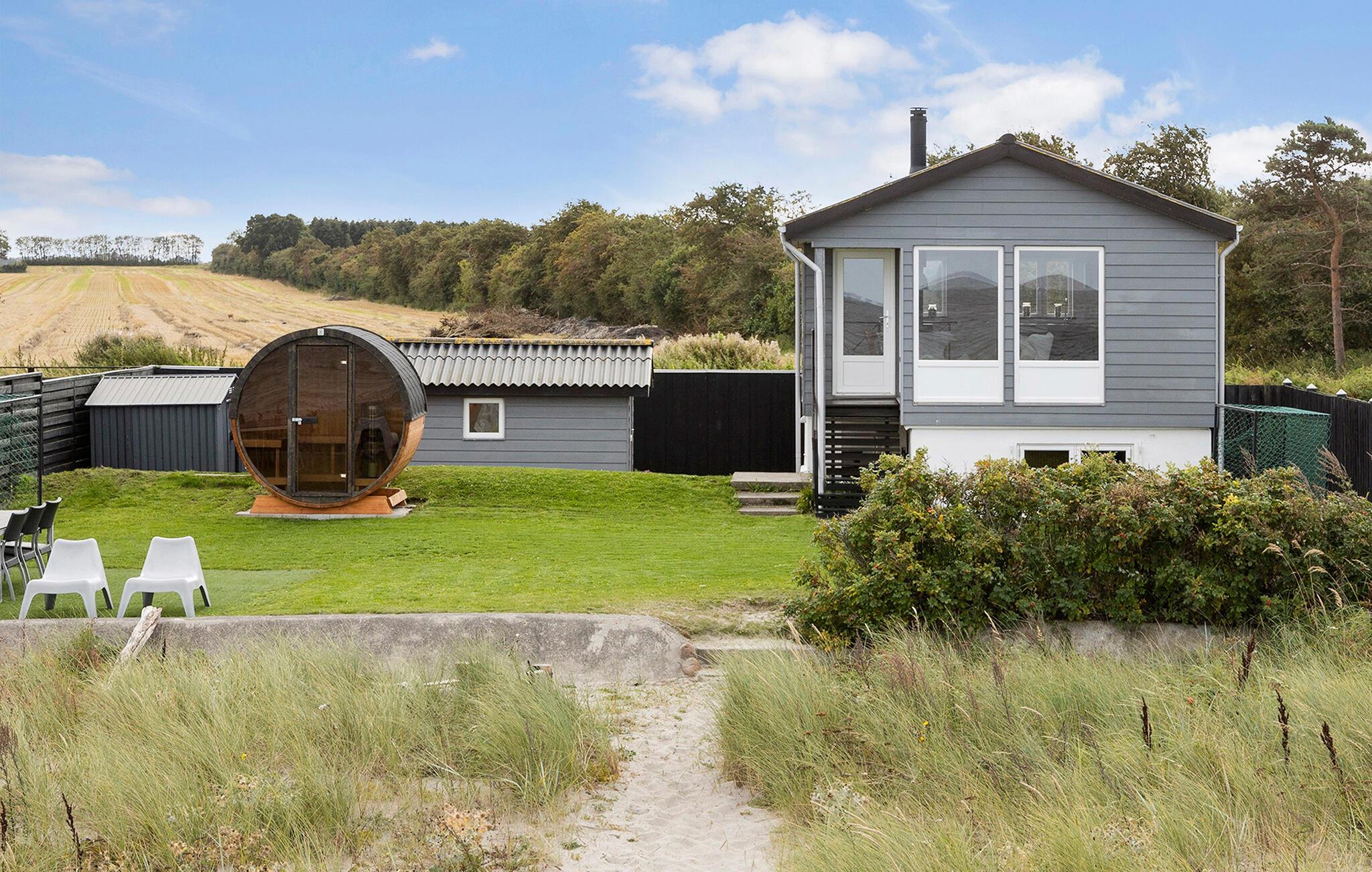 Strandhus ved Tørresø Strand med panoramaudsigt, sauna og bålplads – perfekt til familieferie ved vandet.