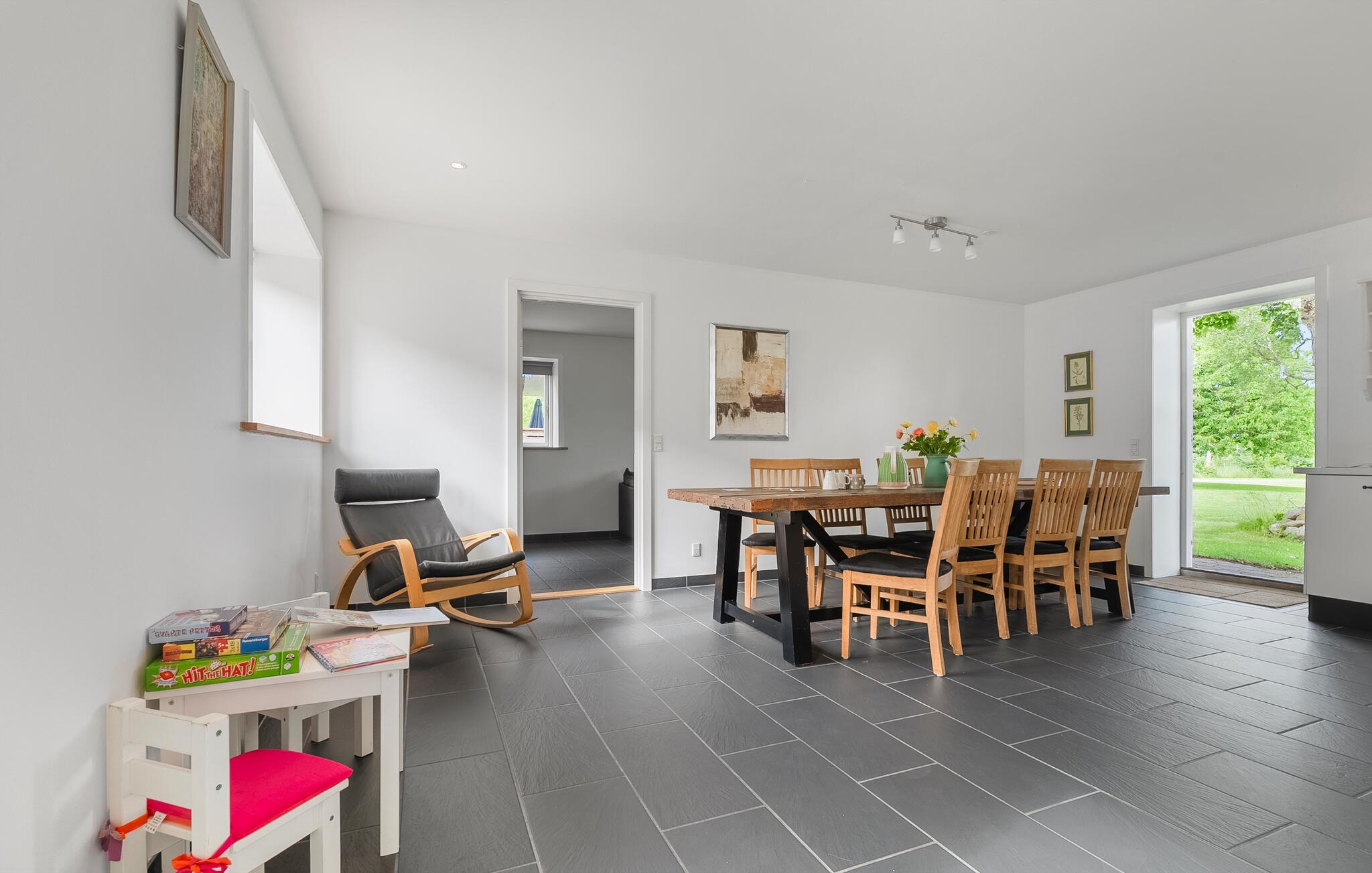 Dette indbydende feriehus er udstyret med moderne faciliteter og ligger på en stor naturgrund, så her kan I se frem til en skøn familieferie. Fremstil lækre retter i det åbne køkken, planlæg dagens aktiviteter rundt om spisebordet, hold en hyggelig spilleaften eller stream en god film, når I vender hjem fra dagens eventyr.