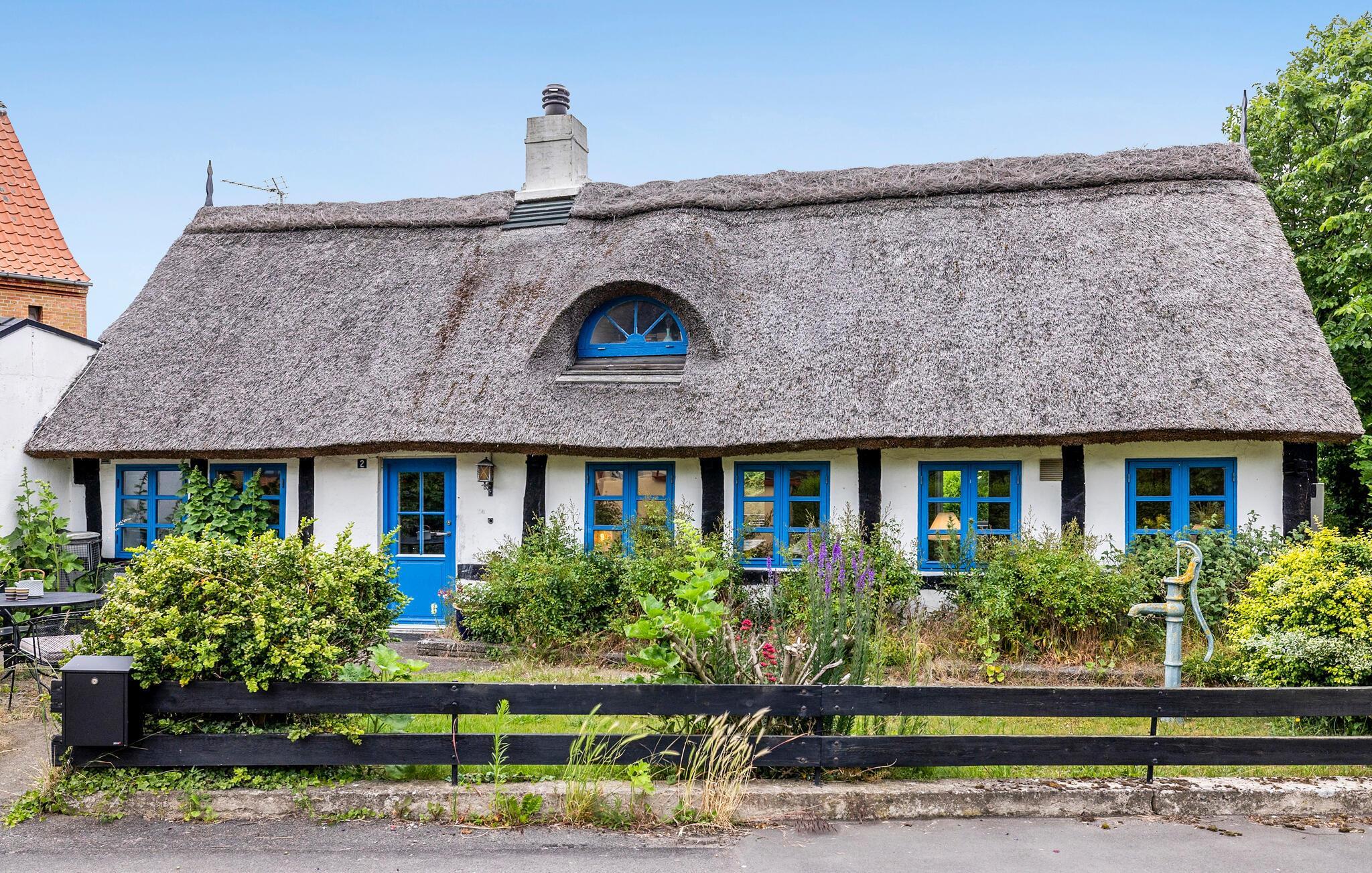 Charmerende bindingsværkshus med stråtag og delvis havudsigt i rolige Tejn, kun 200 m fra vandet.