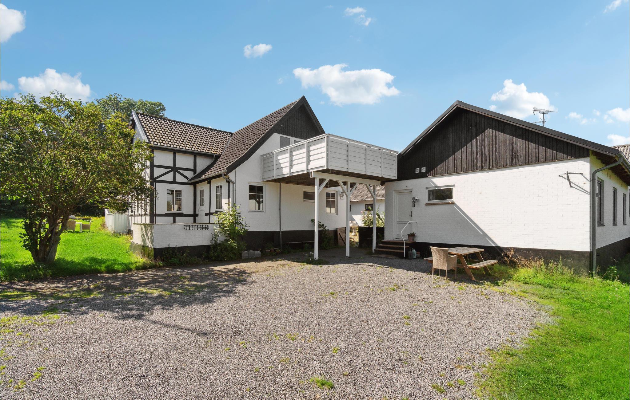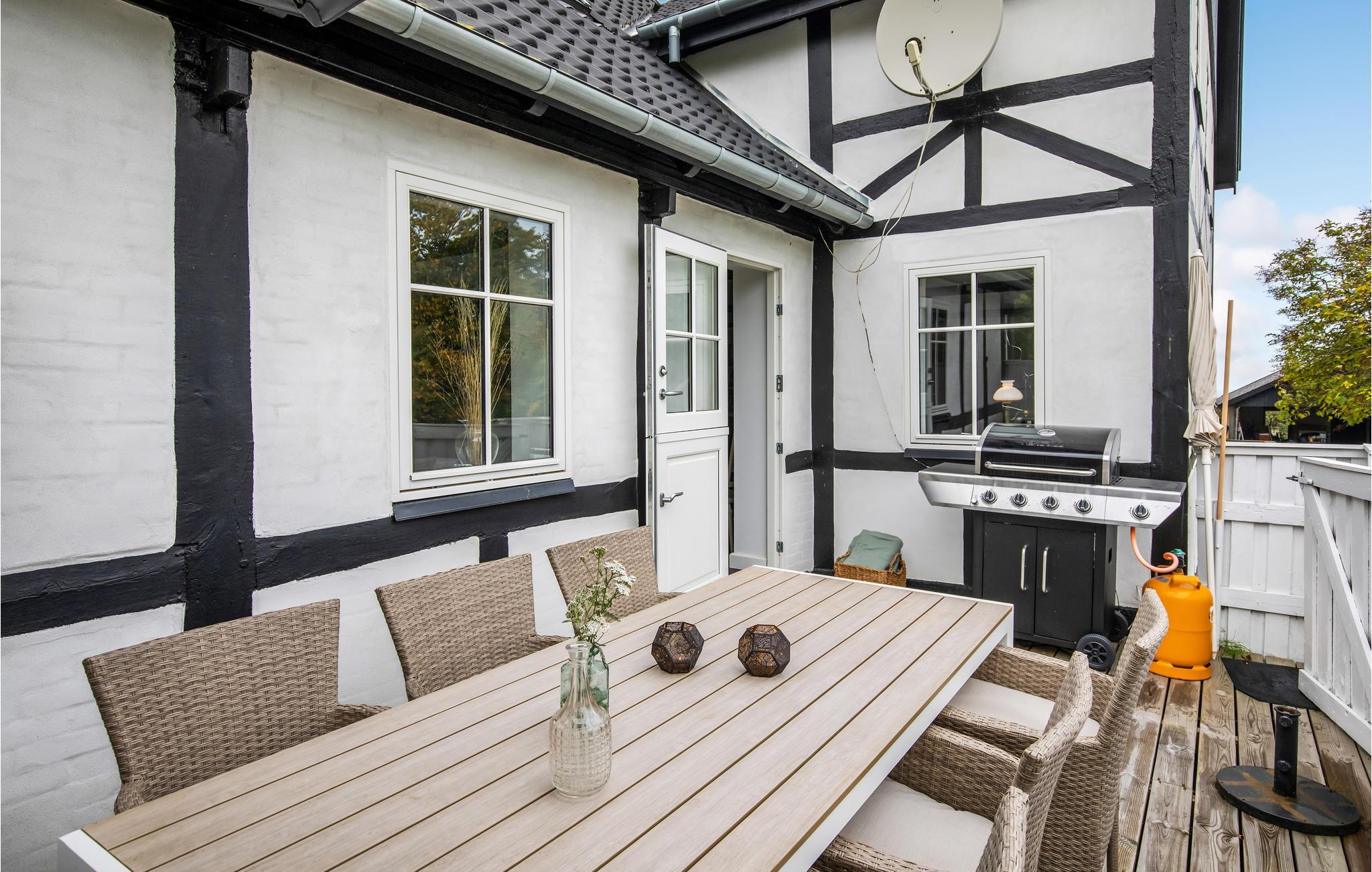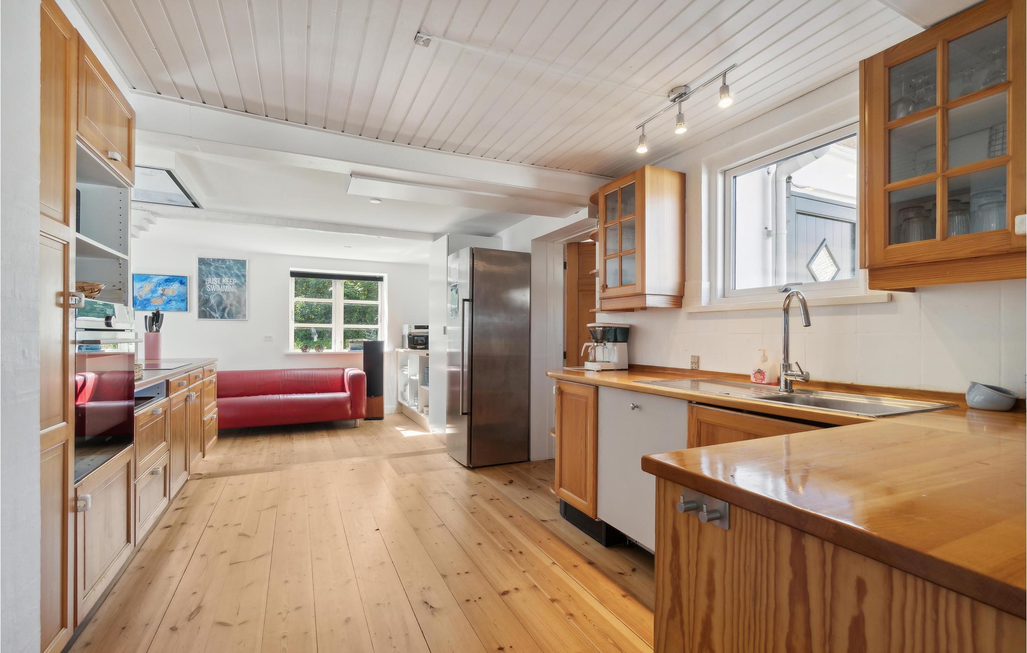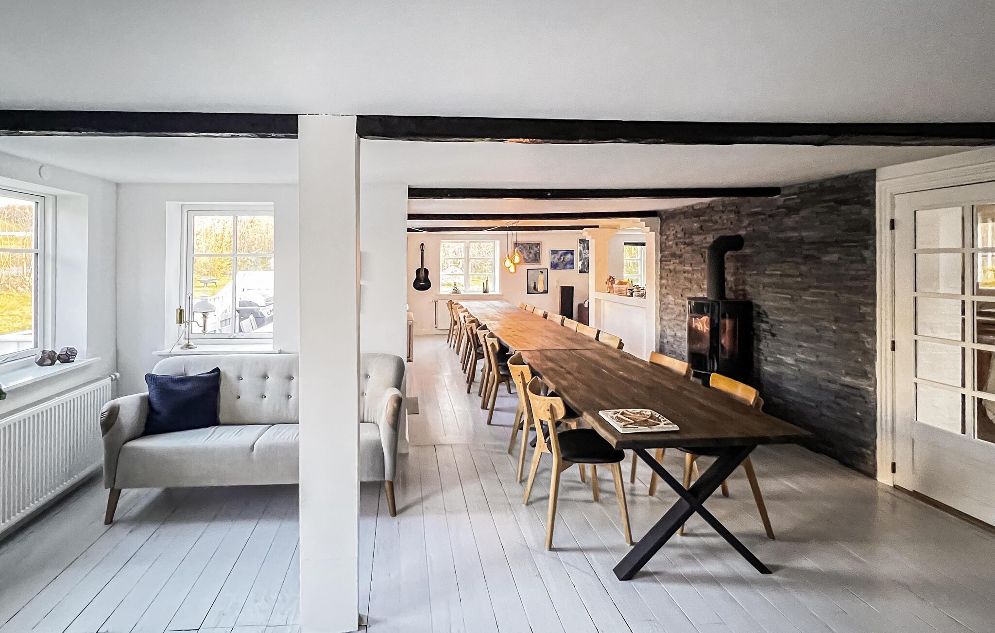 Velkommen til dette helt særlige feriehus i Tejn, som er en fin, renoveret gård med bindingsværk, hvor I kan holde en klimavenlig ferie. Boligen er indrettet med moderne faciliteter og behagelige indretningsløsninger samt velbevarede træk fra det oprindelige hus. Glæd jer til høj komfort, masser af plads og en autentisk atmosfære, som gør det nemt at sænke skuldrene og komme i feriestemning. Dæk op til en hyggelig middag i den lyse stue, når I vender hjem efter dagens oplevelser.
