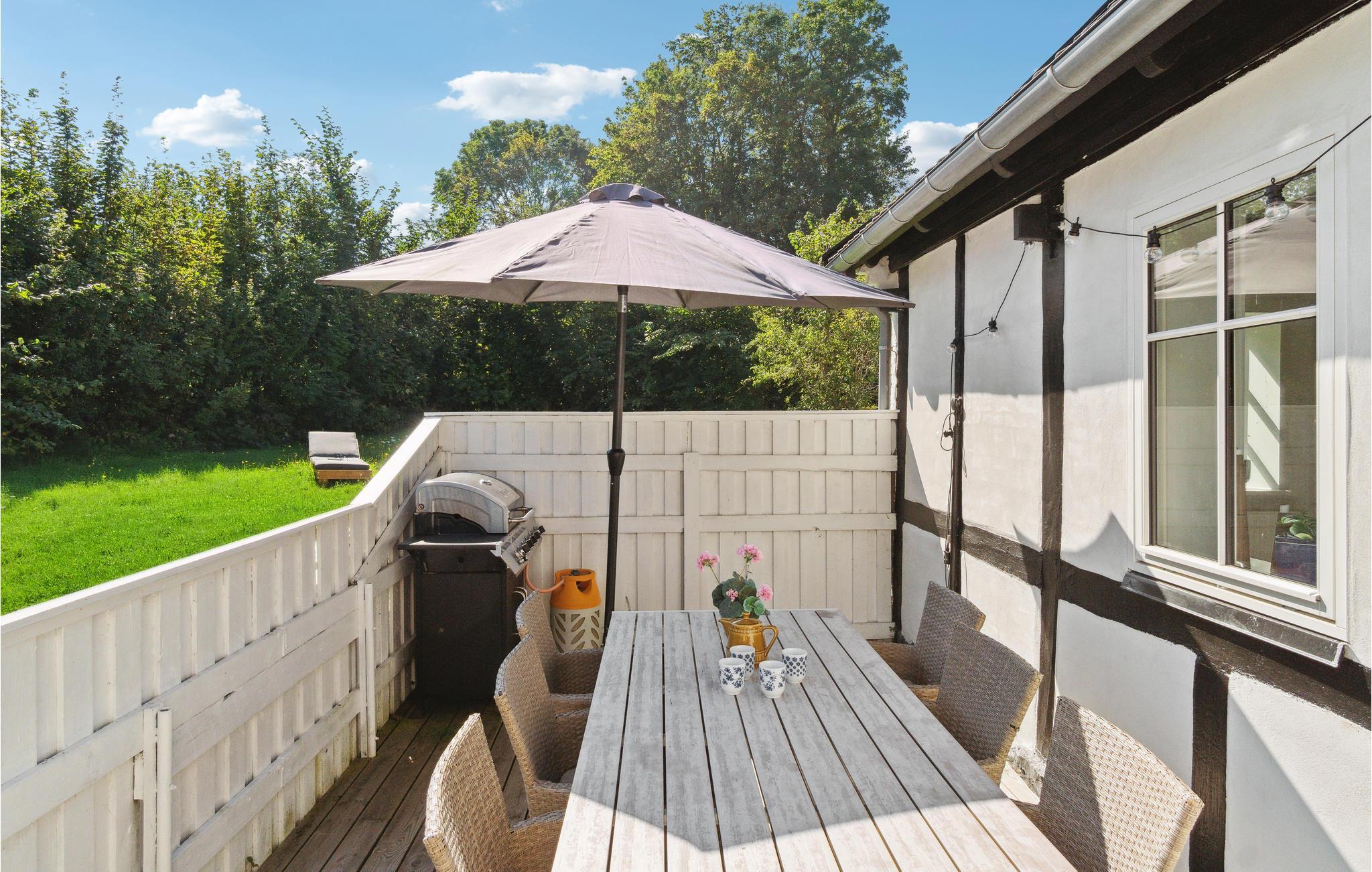 Stemningsfuld og renoveret bindingsværksgård med havudsigt og moderne faciliteter i Tejn på Bornholm.