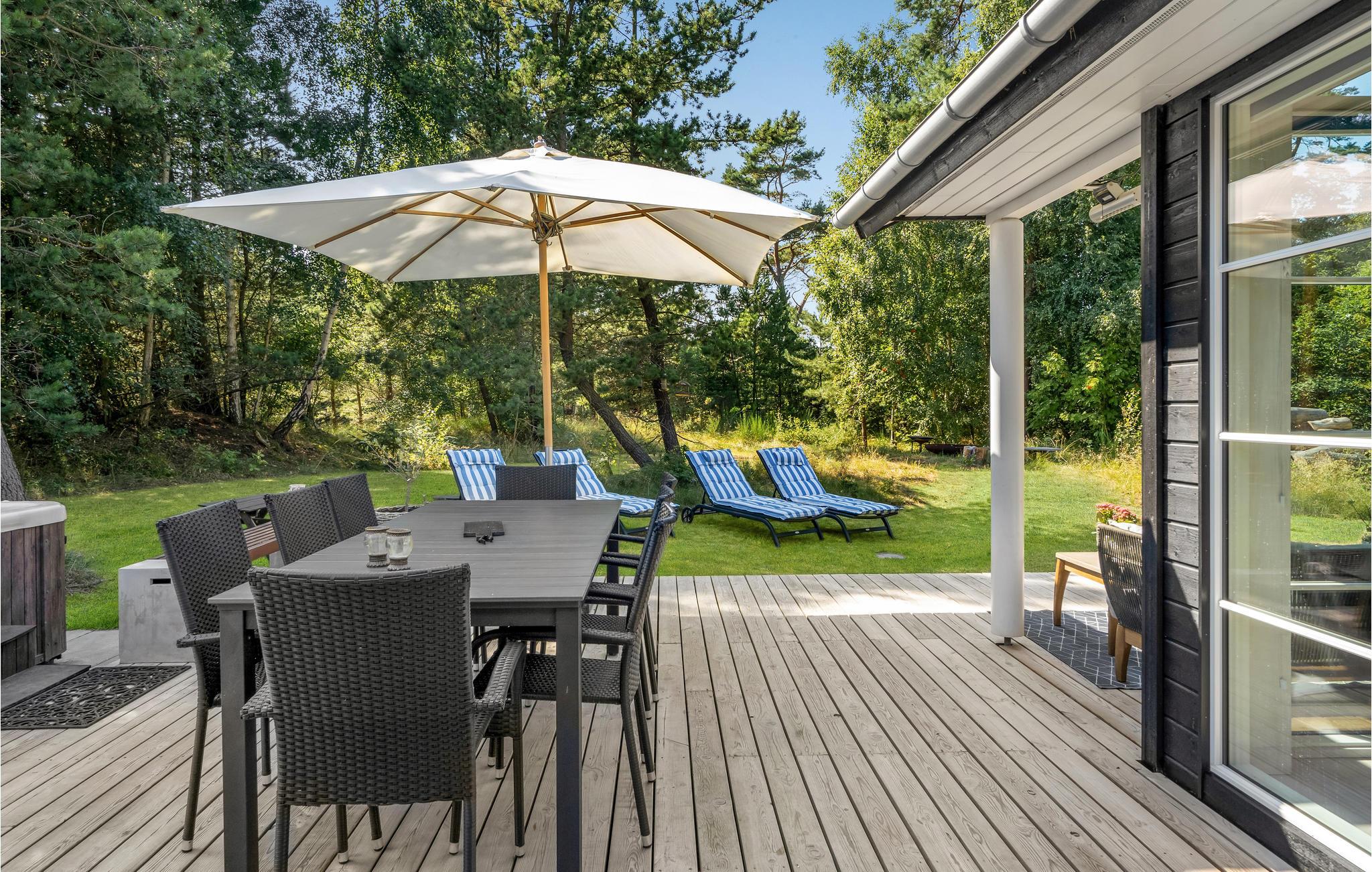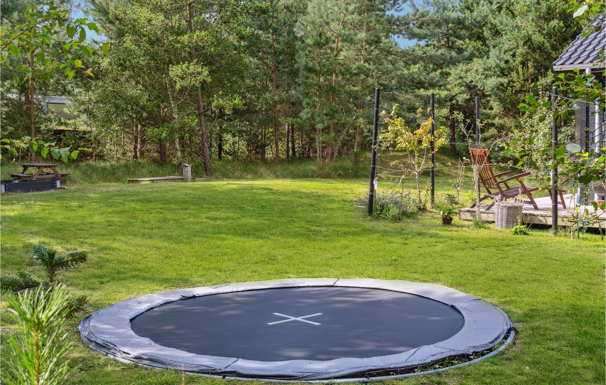 Udenfor er der fin plads til børnenes leg med både gynger, sandkasse og trampolin (kan benyttes under eget ansvar). Bliver varmen for meget, kan I køles ned under udebruseren inden I lægger jer tilrette på solsengen og slapper af, under den overdækkede terrasse kan I slappe af i det hyggelige chaiselong hjørne med terrassevarmere, så selv på de kølige aftner kan der hygges på terrassen. Er I til andre aktiviteter kan I nå de lokale golfbaner, put and take-søer, hyggelige kroer, gallerier indenfor 10 minutters kørsel.