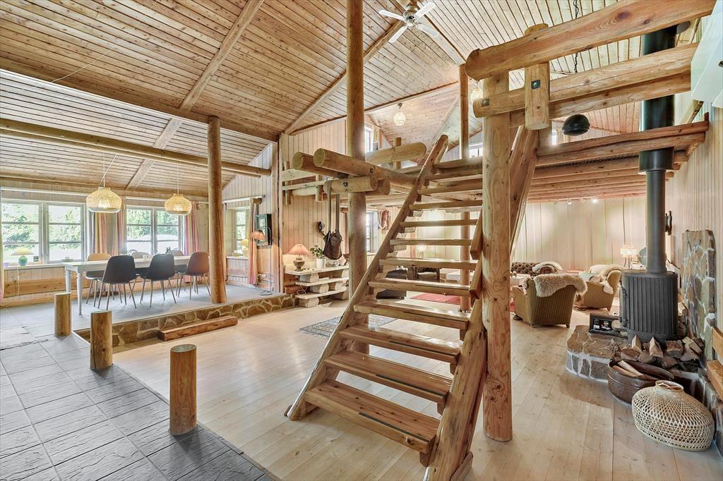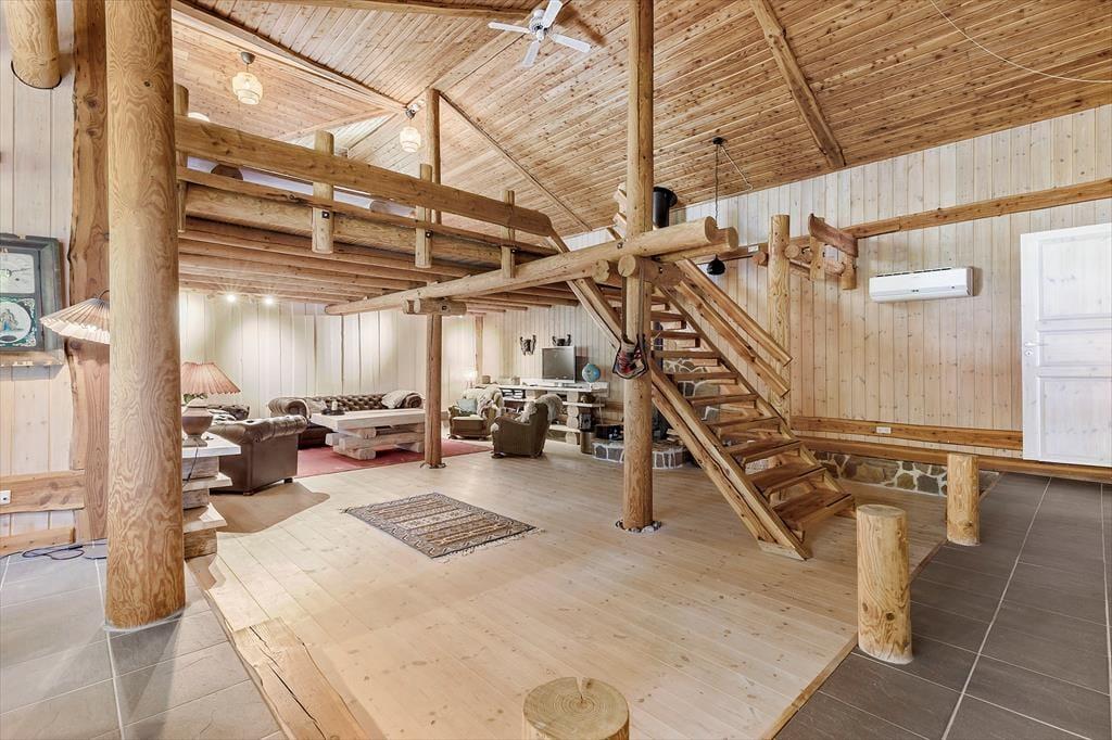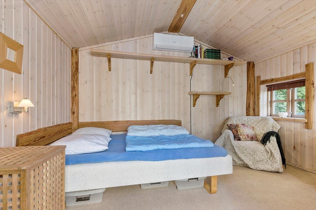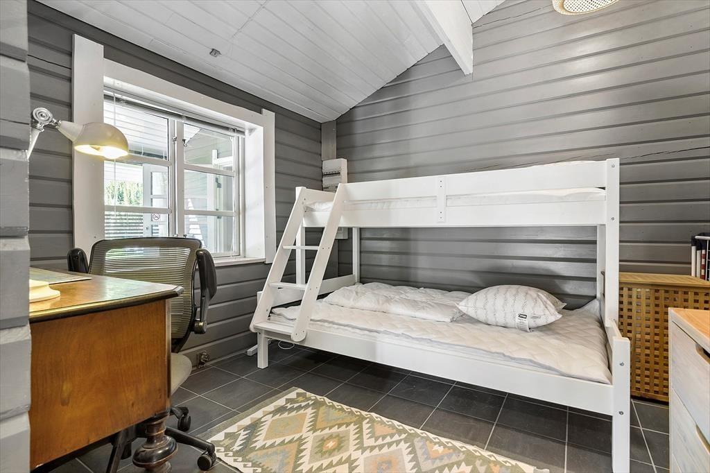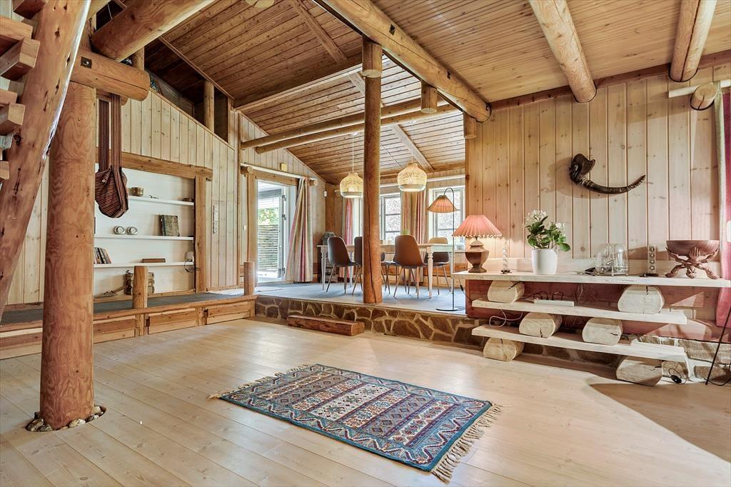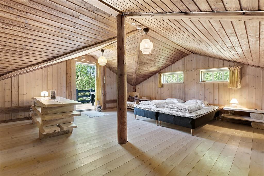 Stuen er meget stor og halvdelen af grundplanen er lavet til en hems for voksne, hvor der er en meget stor seng og rigtig god plads til at sætte sig med en god bog og læse i fred og ro.
