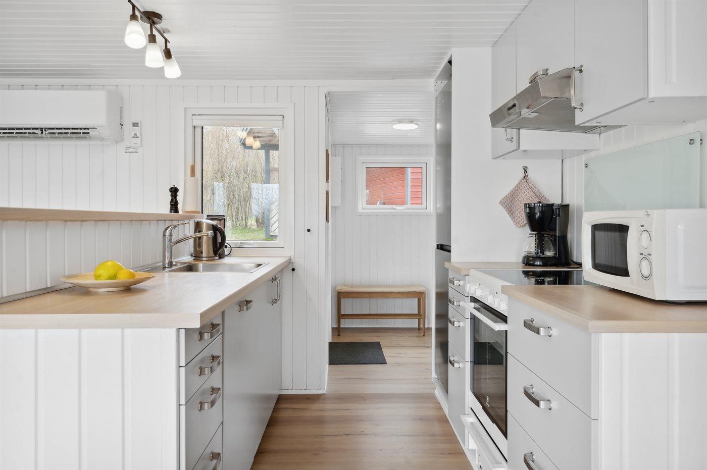 Køkkenet er udstyret med 1 køleskab. Der er 4 keramiske kogeplader, varmluftovn, mikrobølgeovn samt opvaskemaskine.