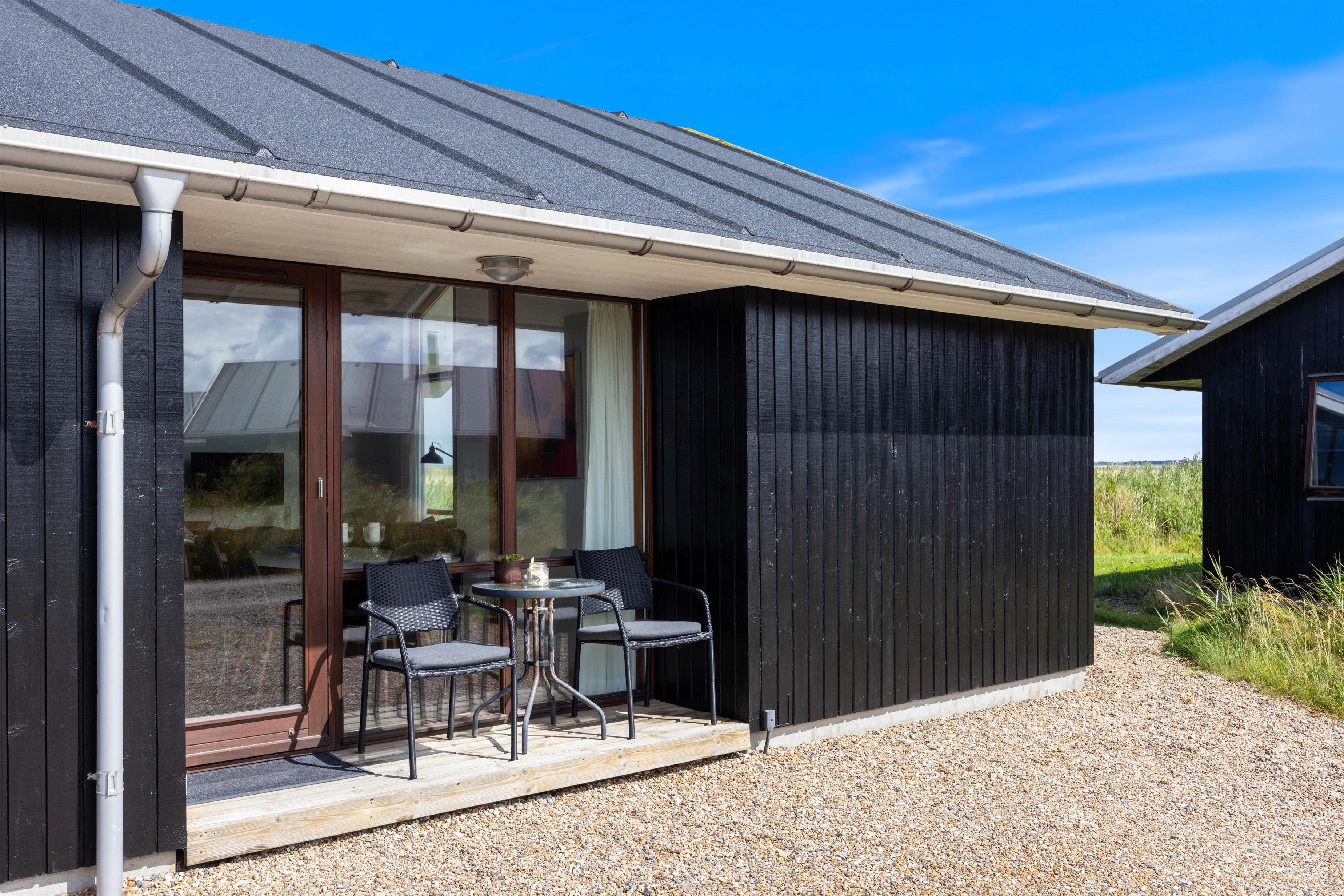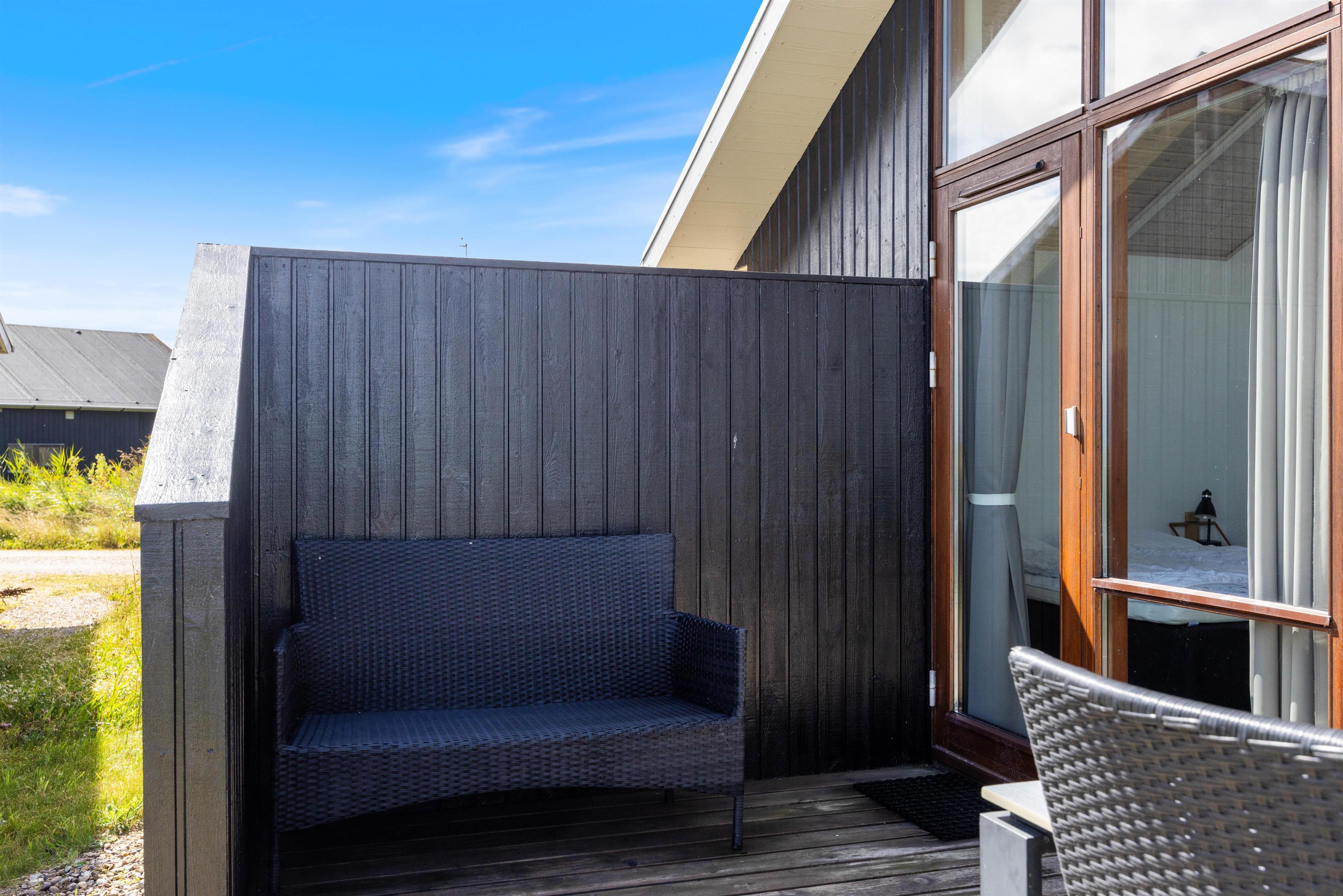 Fra stuen har i direkte udgang til sommerhusets åbne og overdækket terrasse. Her kan I læne jer tilbage i havemøblerne, eller ligge på solsengene og slappe helt af og nyde den gode udsigt til vandet. Om aftenen har I mulighed for at tænde op i grillen, og nyde et lækkert grillmåltid.