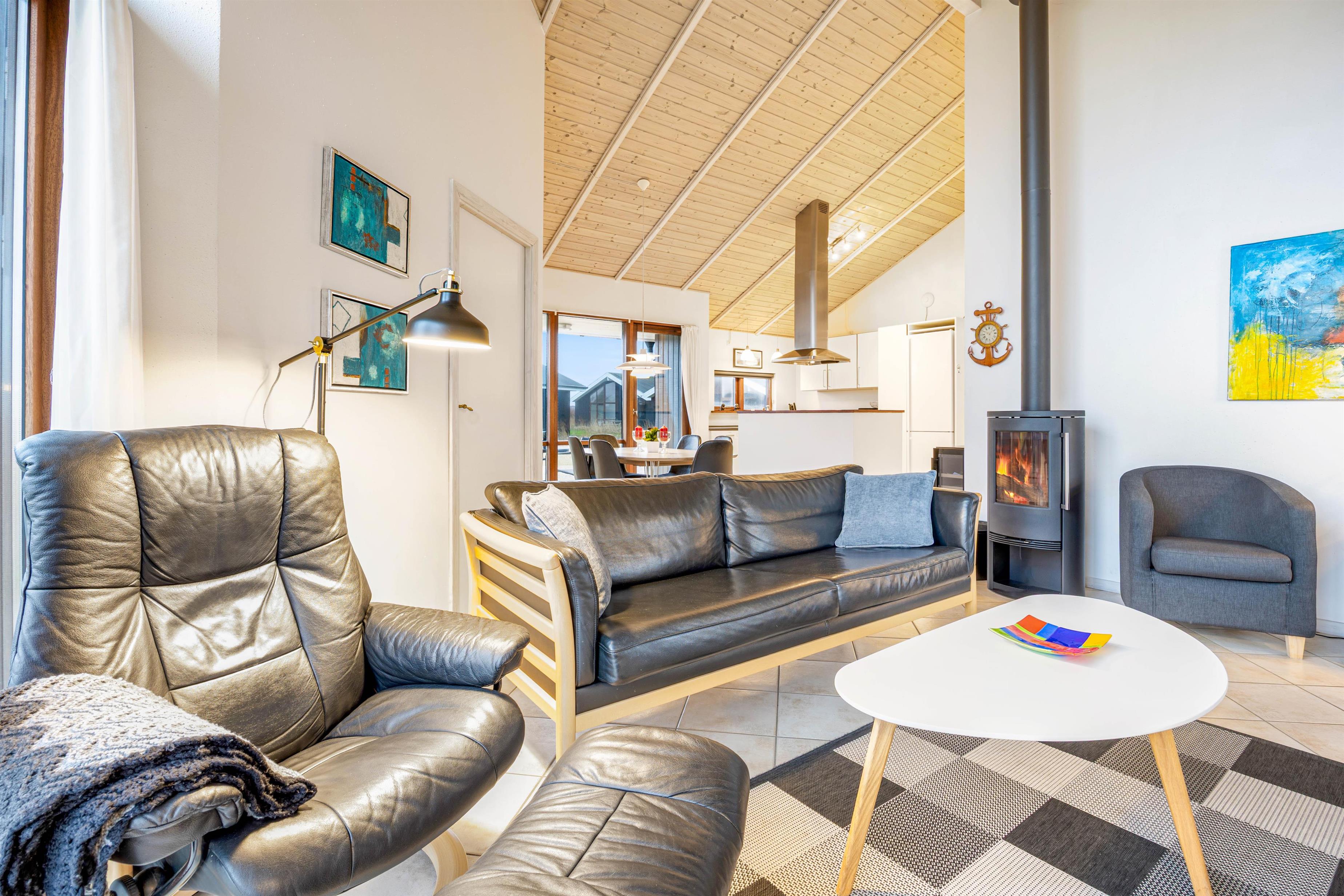 Sommerhusets samlingspunkt er køkkenalrummet, hvor hele familien har mulighed for at være samlet og nyde hinandens selskab. I køkkenet finder I et fantastisk vinkøleskab, hvilket er med til at sikre I kan nyde en god glaske vin til jeres aftensmad, eller bare et lækkert glas på en varm sommerdag. Uanset om I står i det veludstyret køkken og tilbereder et lækkert måltid mad, eller I sidder i sofaen foran brændeovnen og streamer en god film på fjernsynet via Chromecasten, har i mulighed for at være sammen.