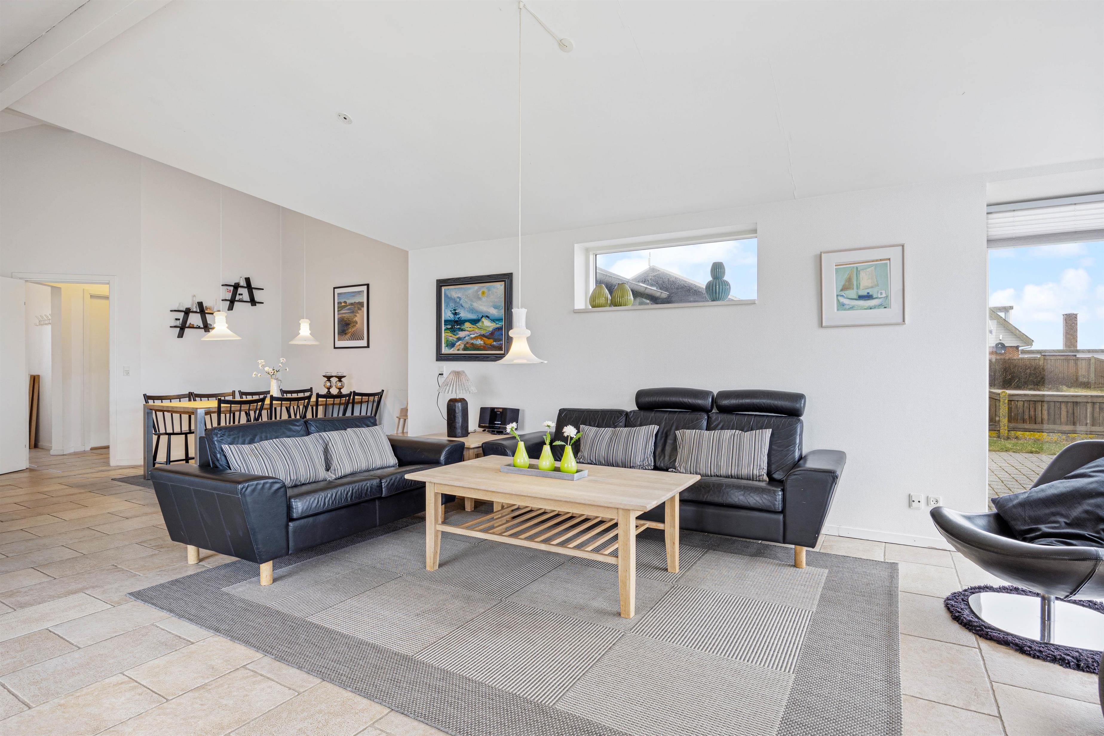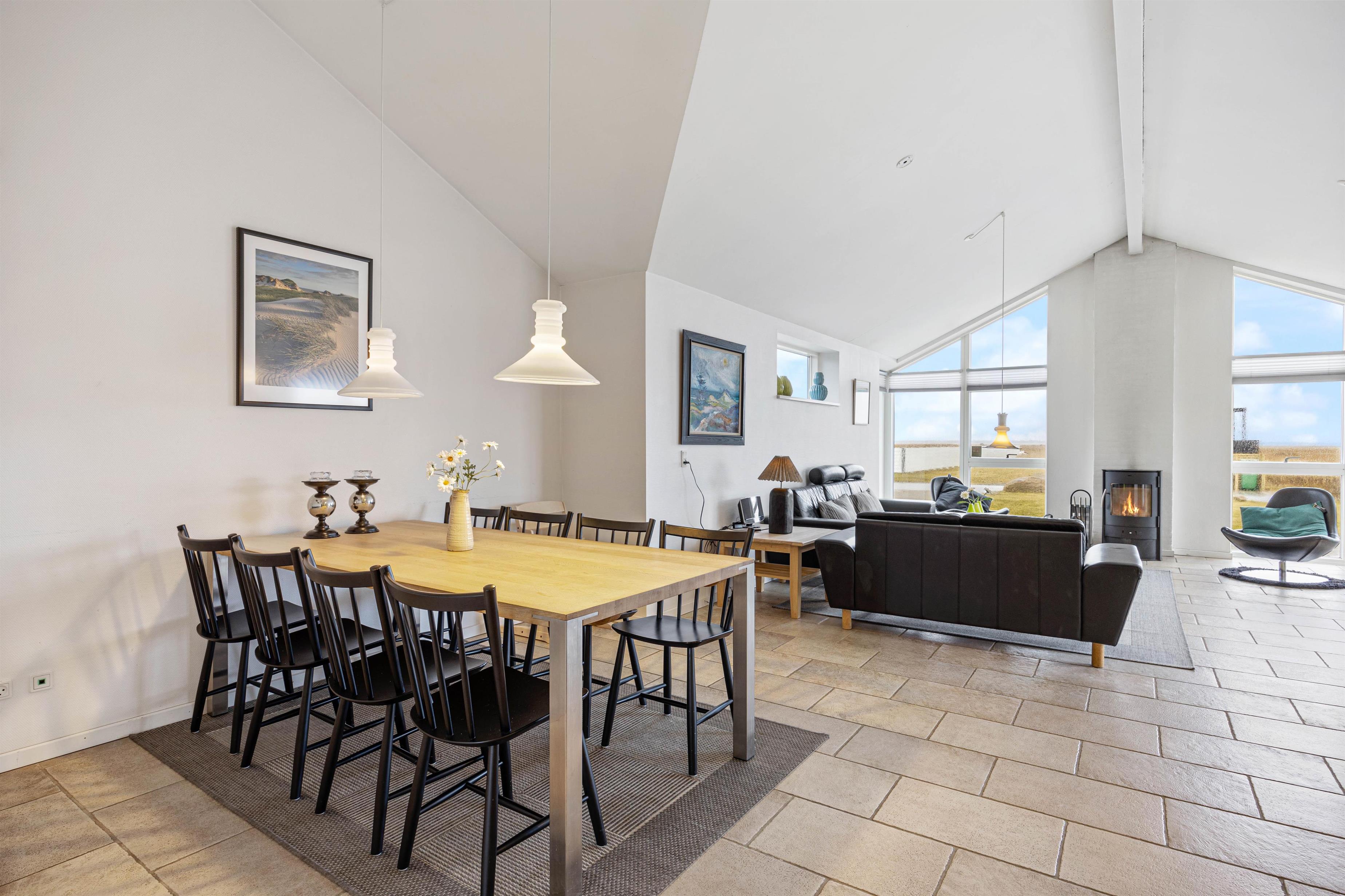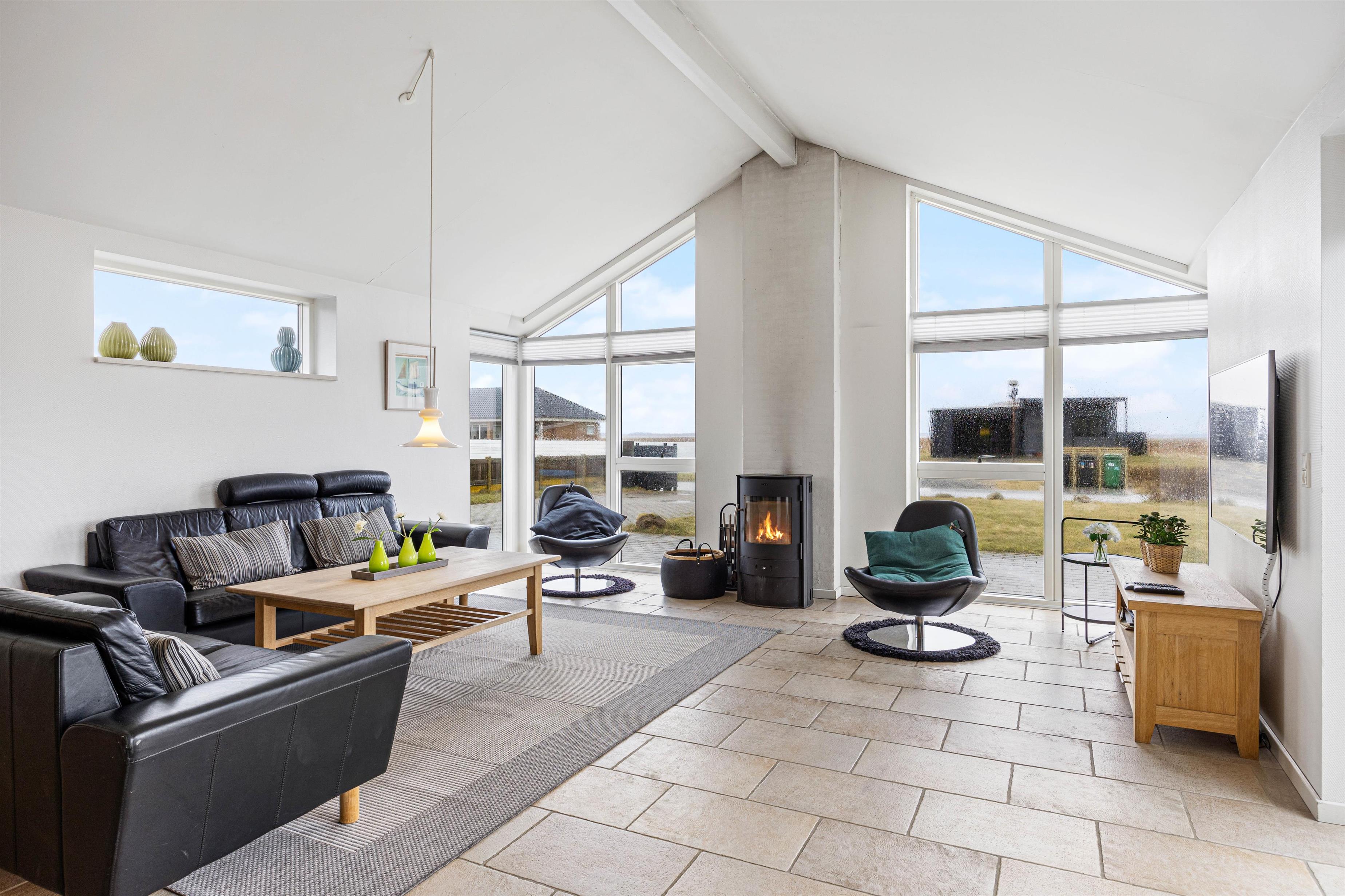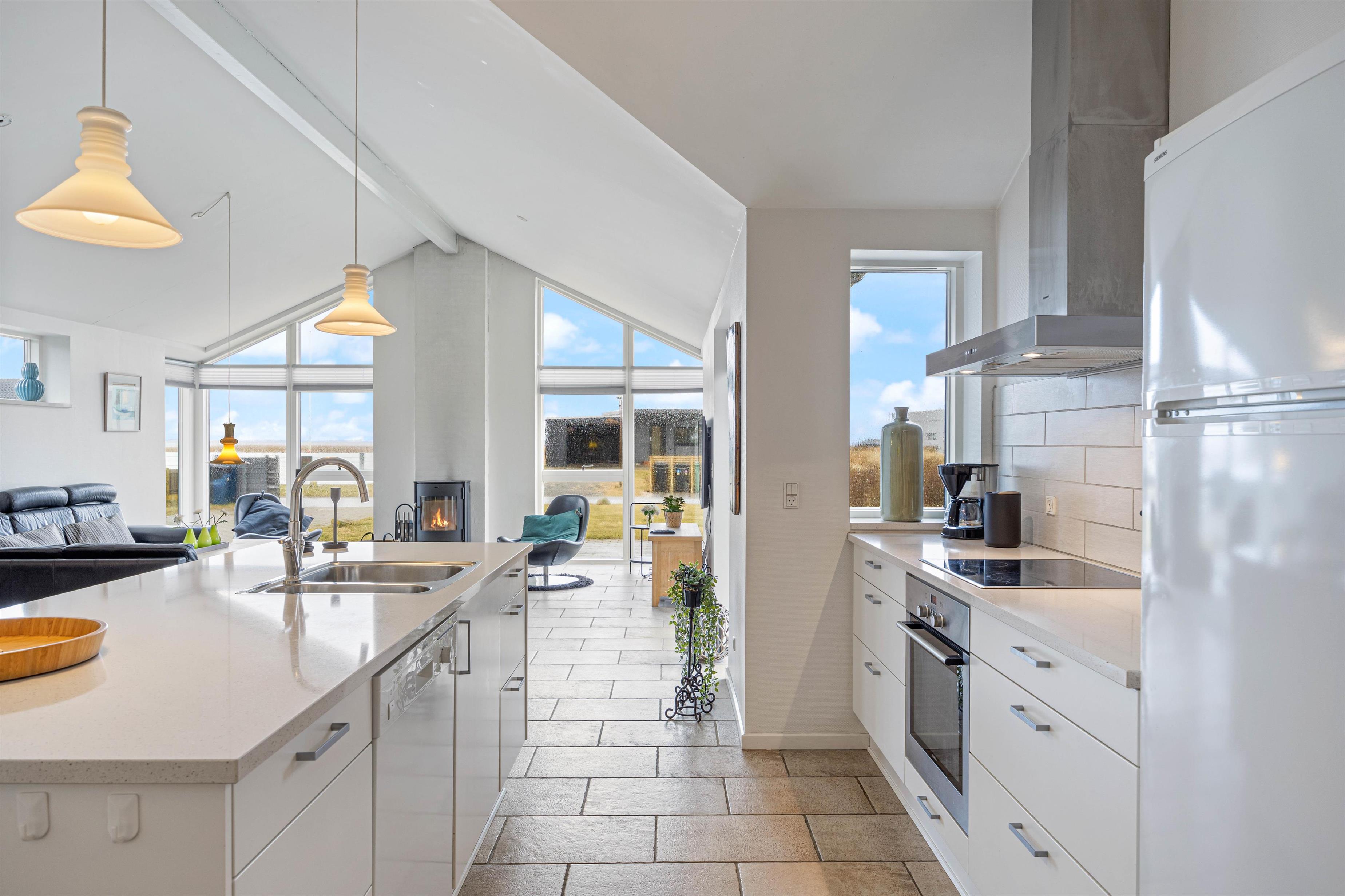 I køkkenalrummet findes alle moderne faciliteter, som gør det nemt at lave et dejligt måltid, smide opvasken i maskinen og nyde en drink på siddepladserne oppe ved køkkenøen. På de kolde dage kan man krybe sammen i sofaen, se en god film og nyde varmen fra brændeovnen. Samt de lune gulve fra gulvvarmen, som sikrer varme fødder. Alt imens man kan følge vejrets gang igennem de store panoramavinduer.