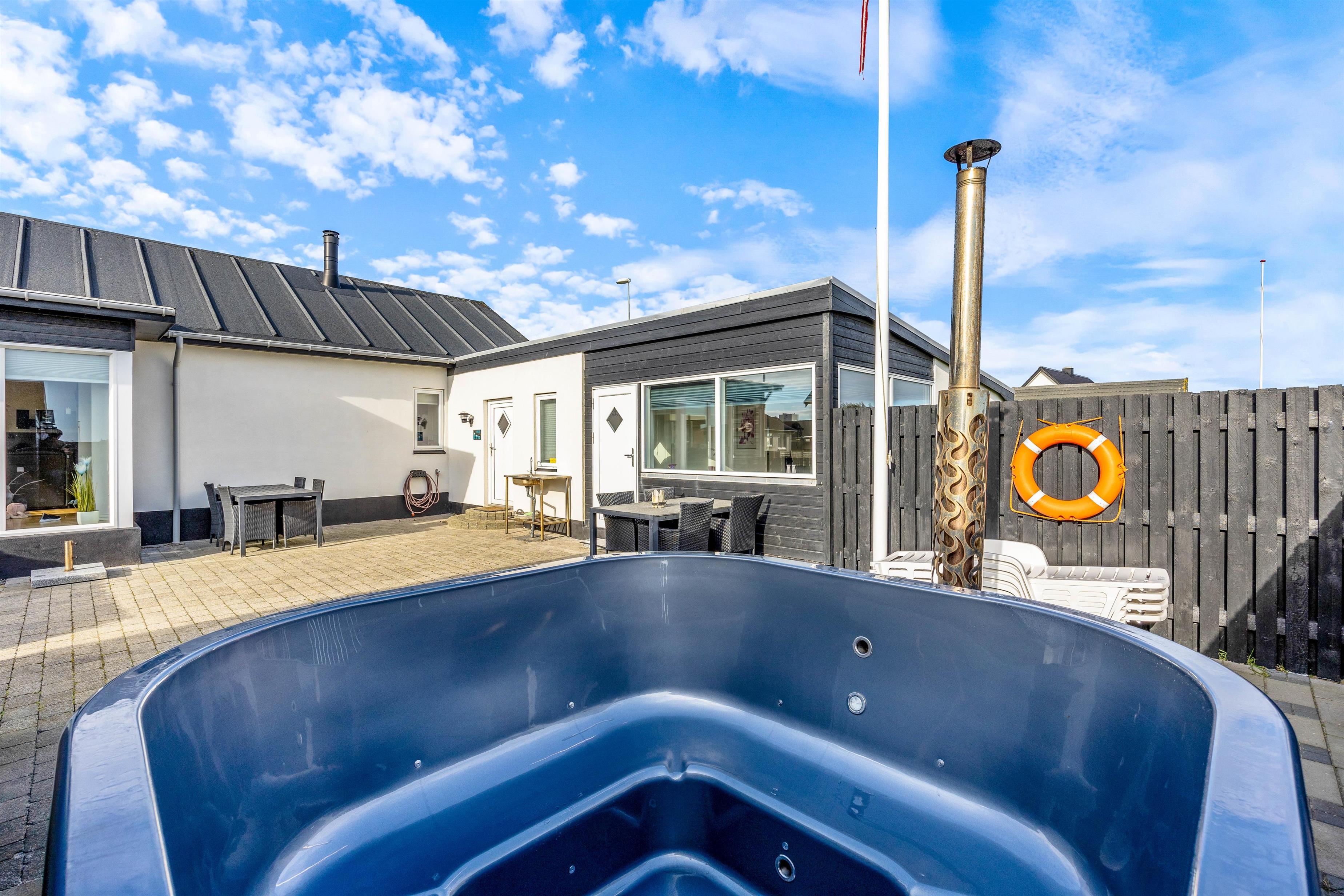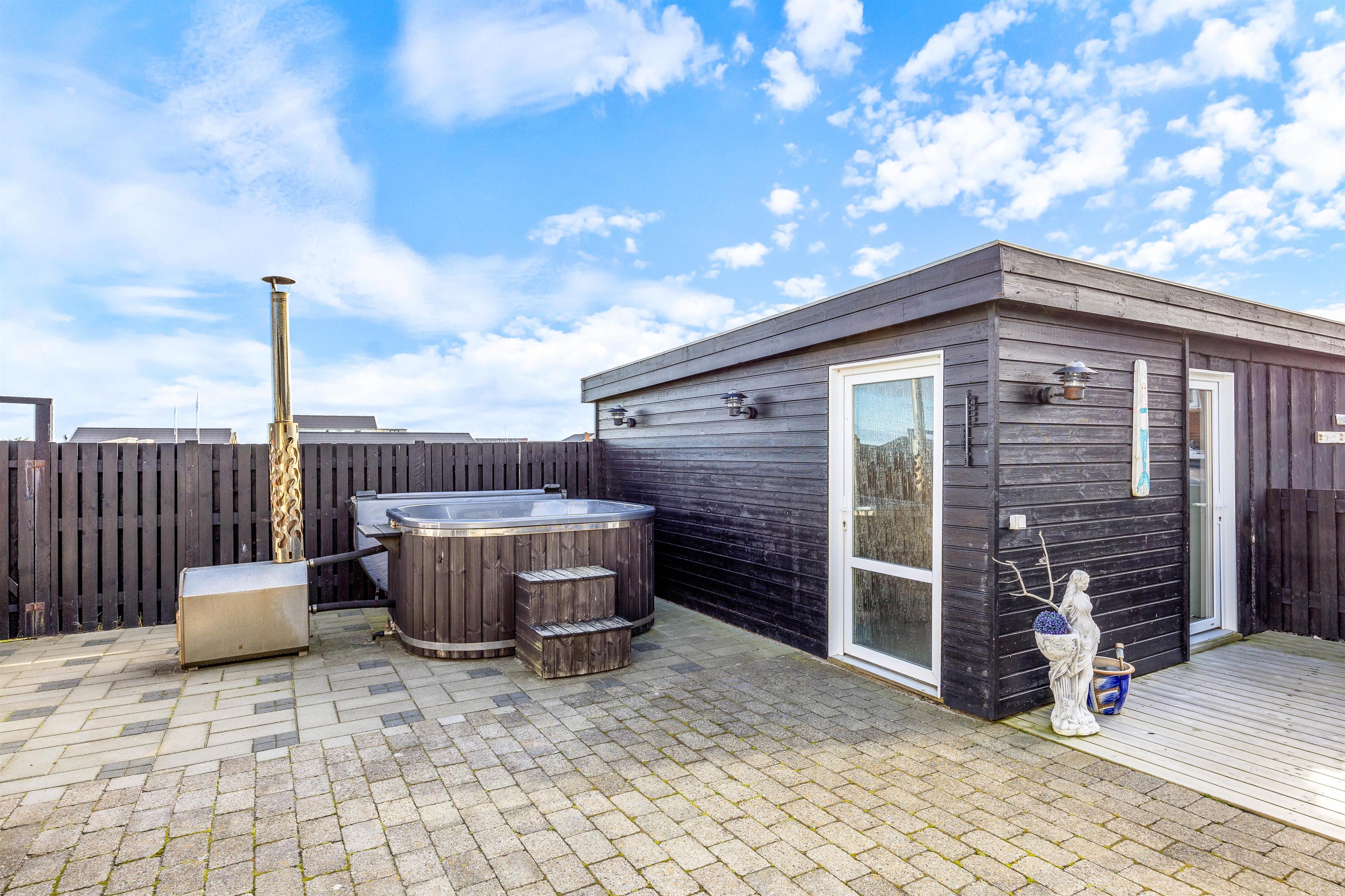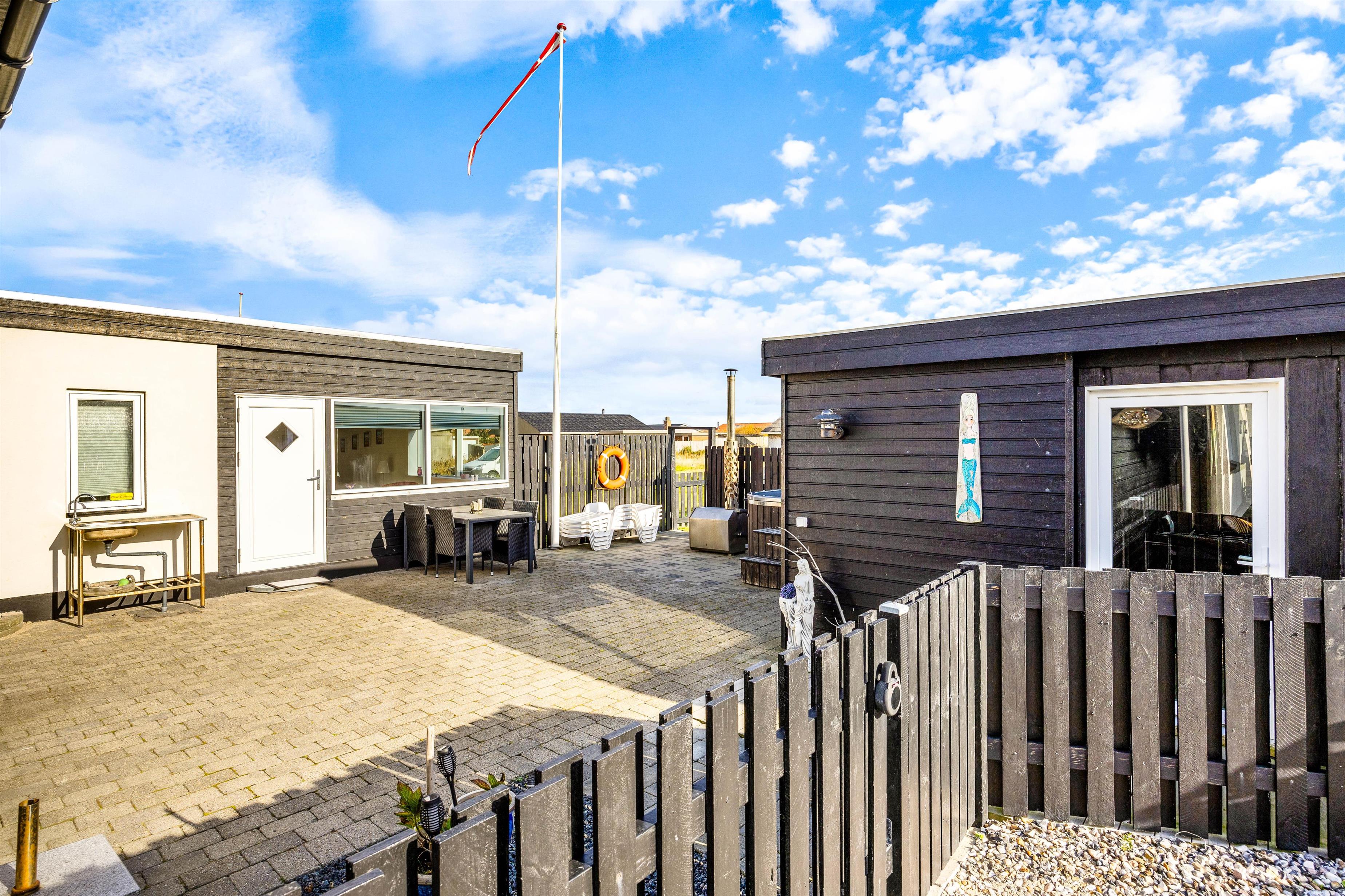 Feriehuset ligger på en 790 kvadratmeter stor grund, hvor der er en delvis stenbelagt, afskærmet og lukket have. På terrassen har I flere forskellige siddepladser, hvor I kan nyde solens varme stråler, når den er fremme. Det er også her, I finder vildmarksbadet, hvor det kan anbefales at nyde et koldt glas vin, mens I nyder varmen og slapper af.