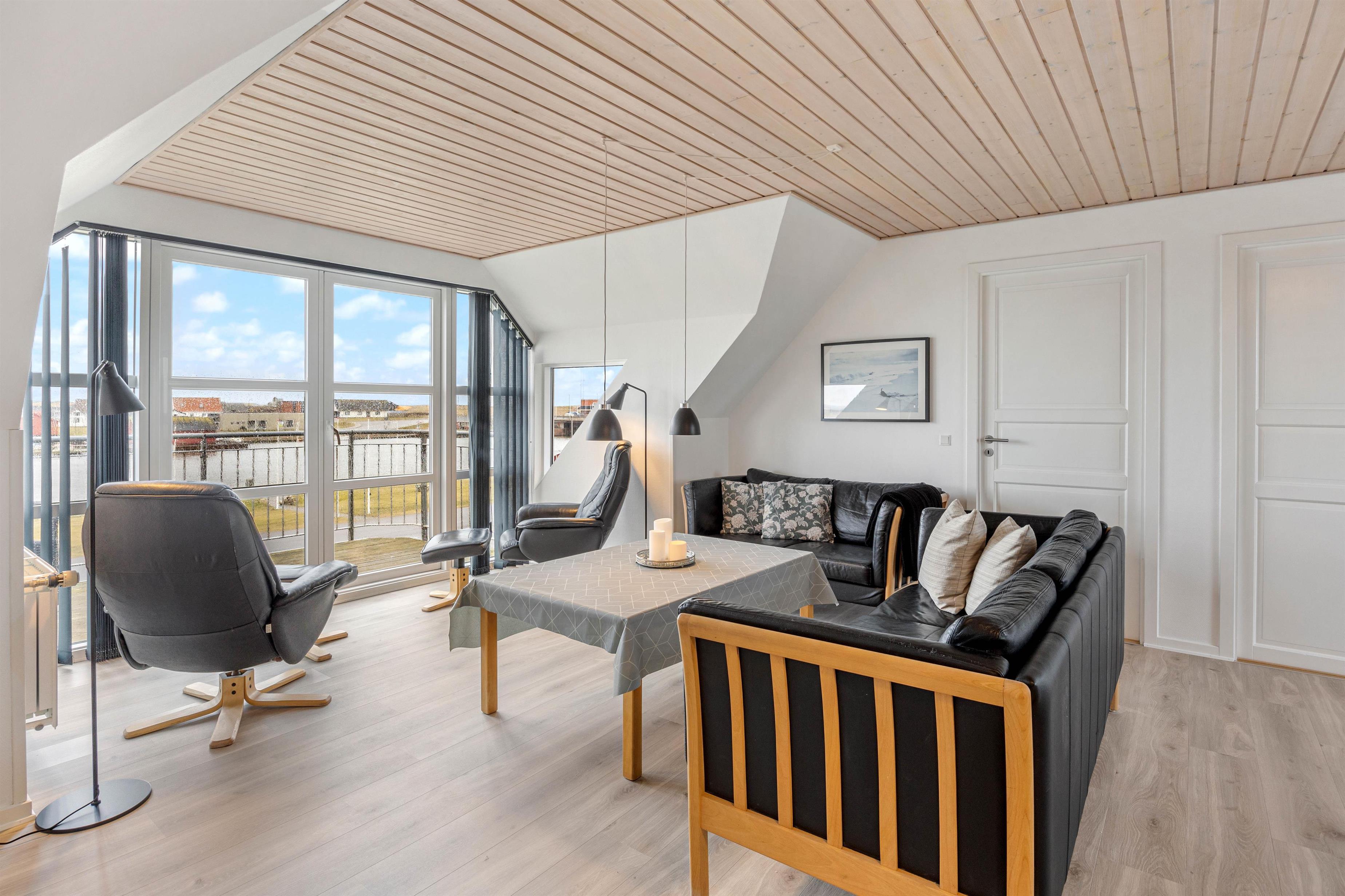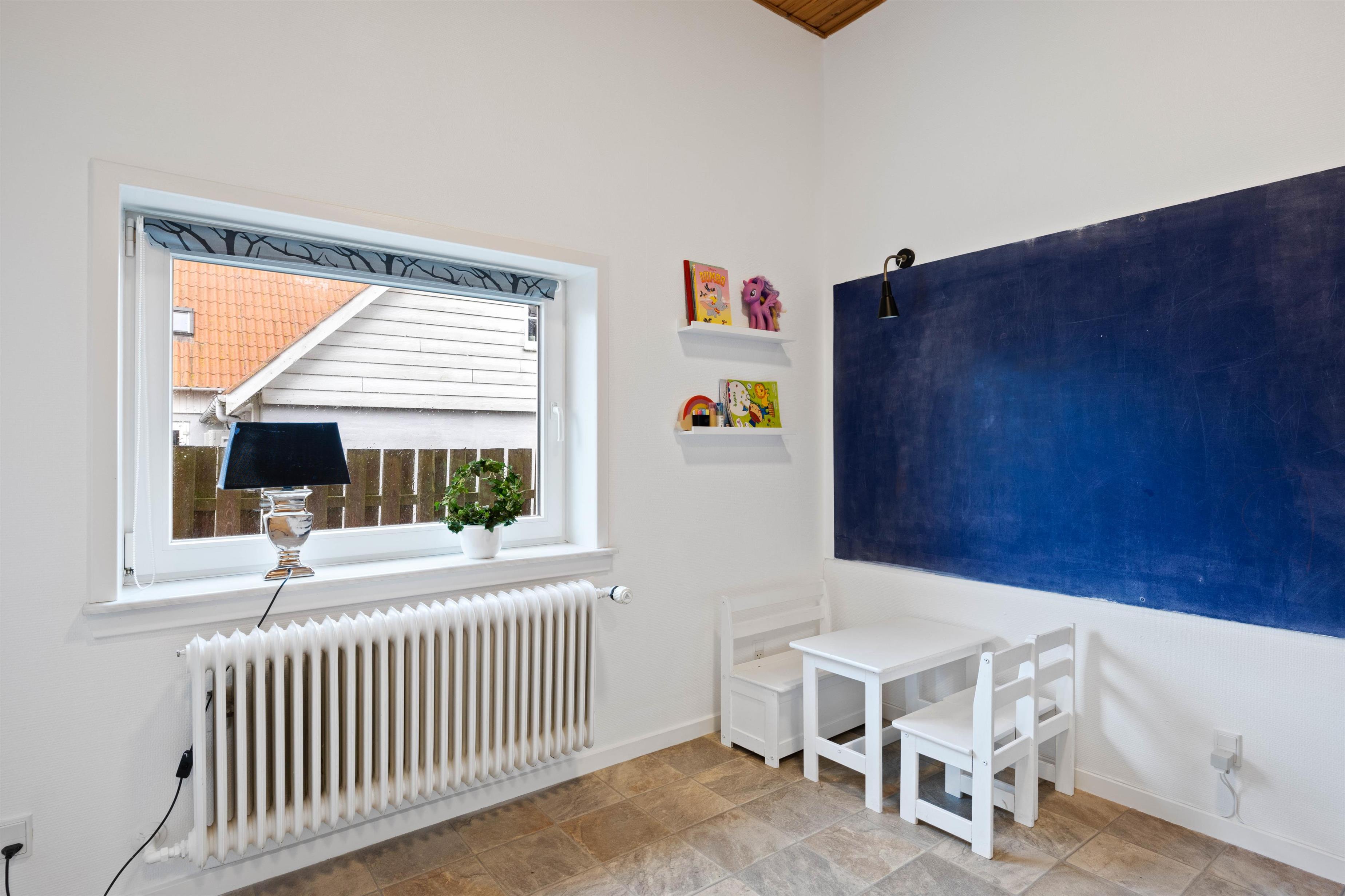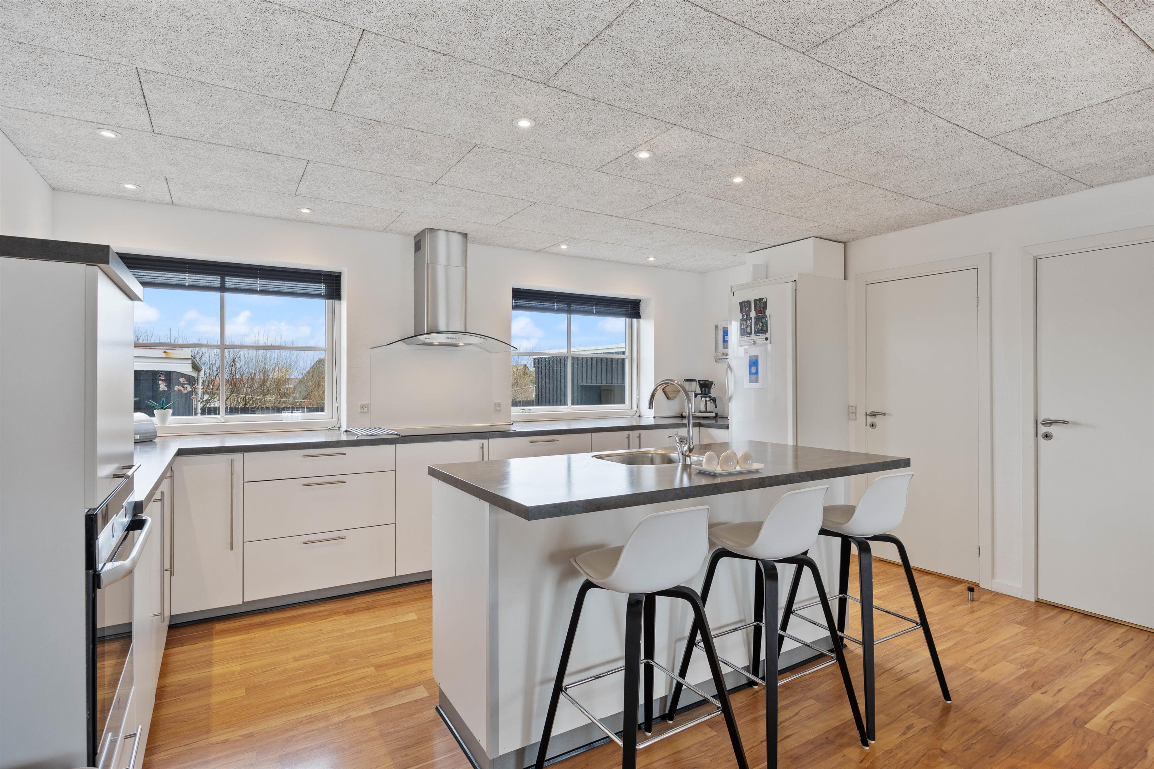 Det lyse og rummelige sommerhus på Skolegade 11 danner rammen for en fantastisk ferie på Vestkysten. Sommerhusets stue og køkken ligger i forlængelse af hinanden, hvorfra nogle af jer har mulighed for at slænge jer i den store sofa eller nyde en kold drink ved kogeøen, imens andre står for madlavningen i det flotte og indbydende køkken. Fra køkkenalrummet kan I nyde den smukke panoramaudsigt ud over kanalen med de forbi sejlende både, og herfra har I yderligere direkte adgang ud til en af terrasserne.