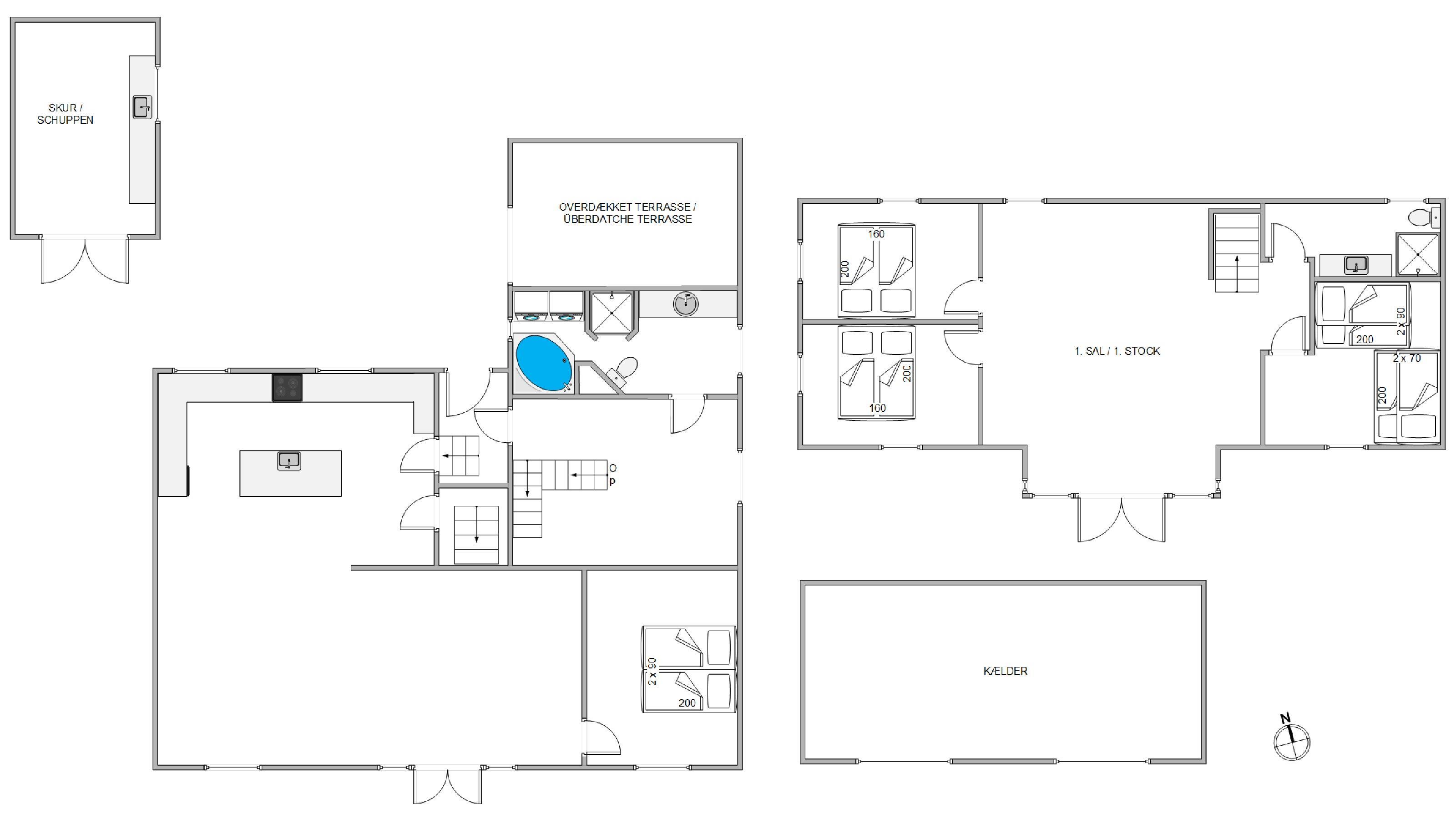 Derudover er sovepladserne fordelt på 4 soverum, hvoraf et af rummene er med køjer, som vil være ideelt for de mindste gæster. Indretningen i sommerhuset giver mulighed for at skabe ro for de mindste ved puttetid samtidig med, at de voksne kan more sig med en pool- eller bordfodboldturnering nedenunder i det skønne aktivitetsrum.