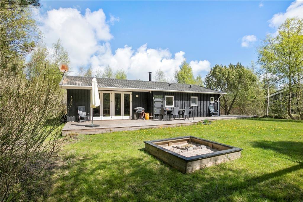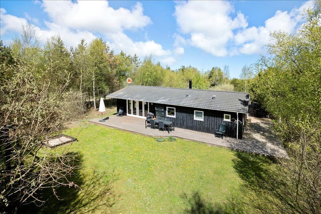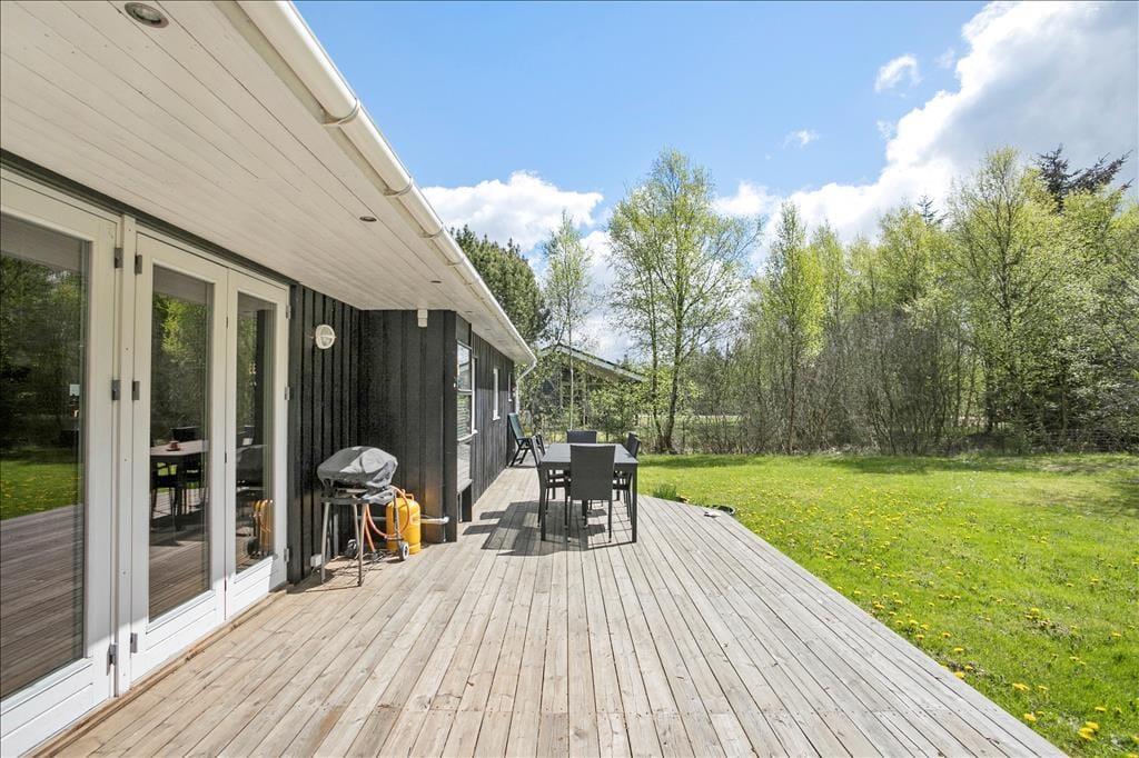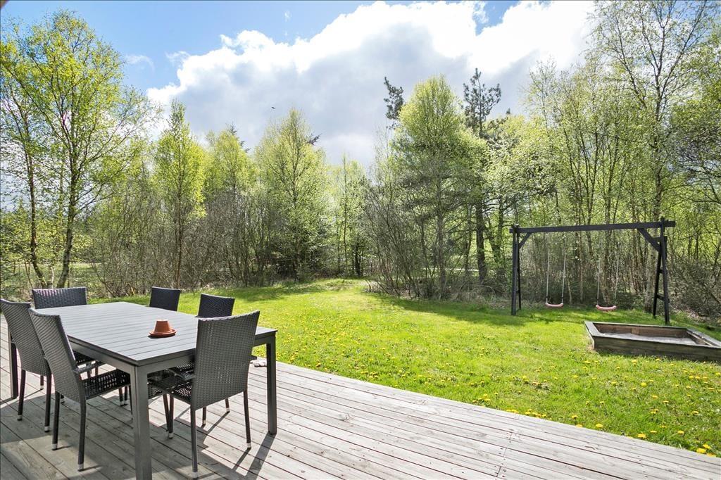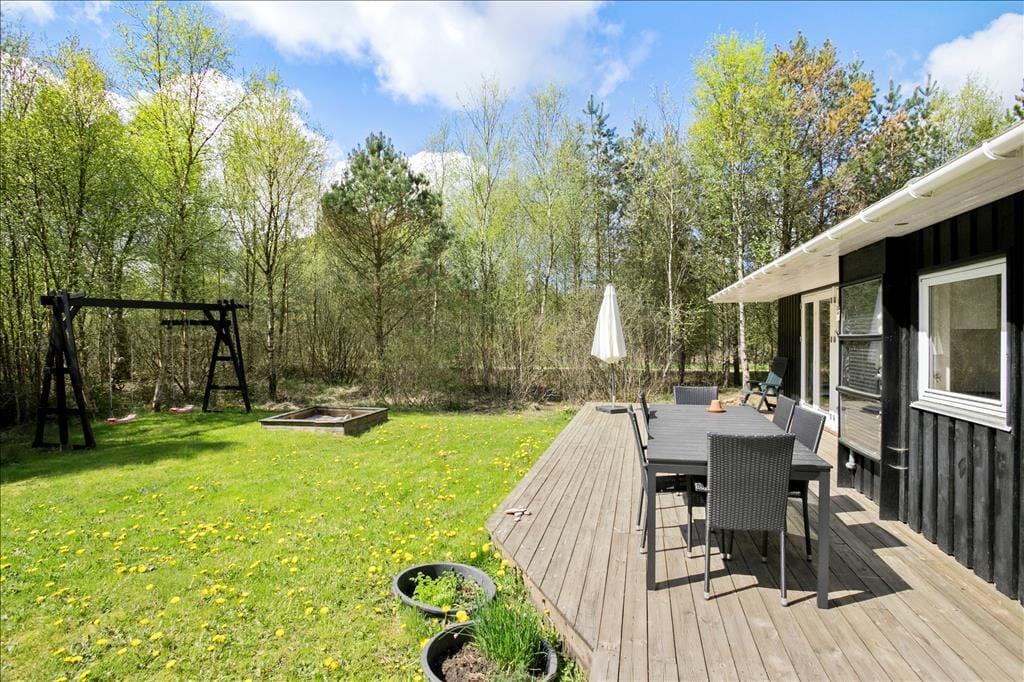 God plads og velordnede rammer er bestemt også kendetegnende for de udendørs omgivelser: Grunden måler 1.132 m2 og er skærmet af tæt randbeplantning, så de solbeskinnede dage kan gå med at boltre sig på græsplænen eller dase på den store træterrasse. Til de yngste feriegæster er der gynger og sandkasse, mens hele familien kan få glæde af terrassens gode havemøbler, liggestole og selvfølgelig også grillen.