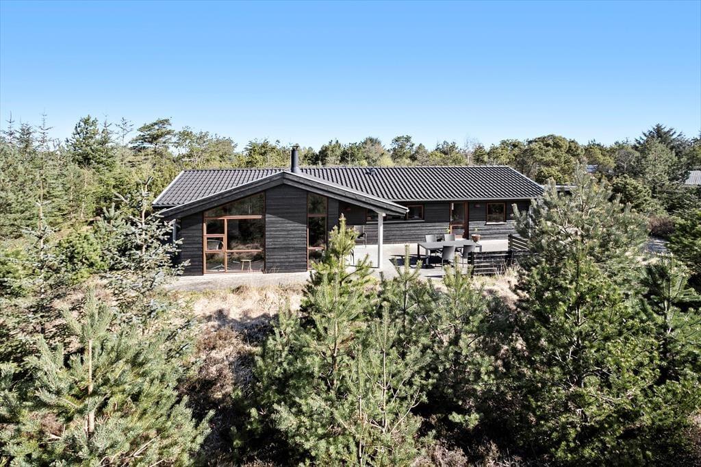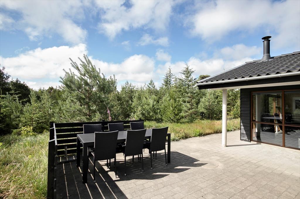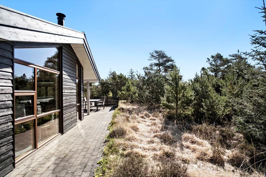 Udearealerne er dejligt rolige og ugenerede, for sommerhuset ligger på en 1269 m2 stor naturgrund med skærmende beplantning. Det føles nærmest som at bo midt ude i naturen – dog er der åbnet op omkring sommerhuset, hvor der er anlagt en stor, solrig og delvist overdækket fliseterrasse. Her er der havemøbler og en parasol til rådighed, og hvis I kan lide at grille, er det oplagt at tilberede flere af feriemåltiderne under åben himmel.