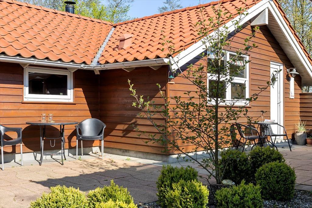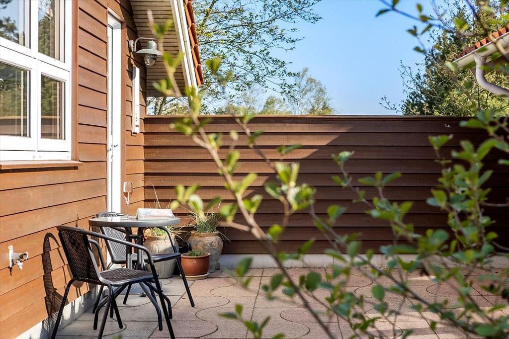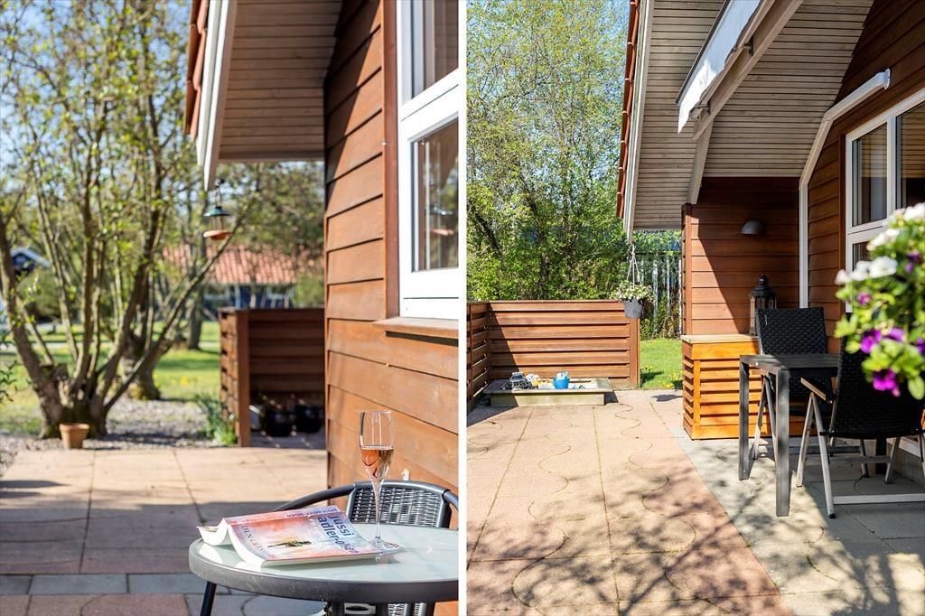Fra stuen har I direkte adgang til et skønt og delvist afskærmet terrassemiljø, der breder sig syd for sommerhuset. Lige ved stuen er der en markise, som I kan rulle ud, hvis sommerfrokosten eller den efterfølgende siesta skal foregå i skyggen. På græsplænen kan både børn og hunde spille bold og lege, og for enden af indkørslen er der carport til bilen.