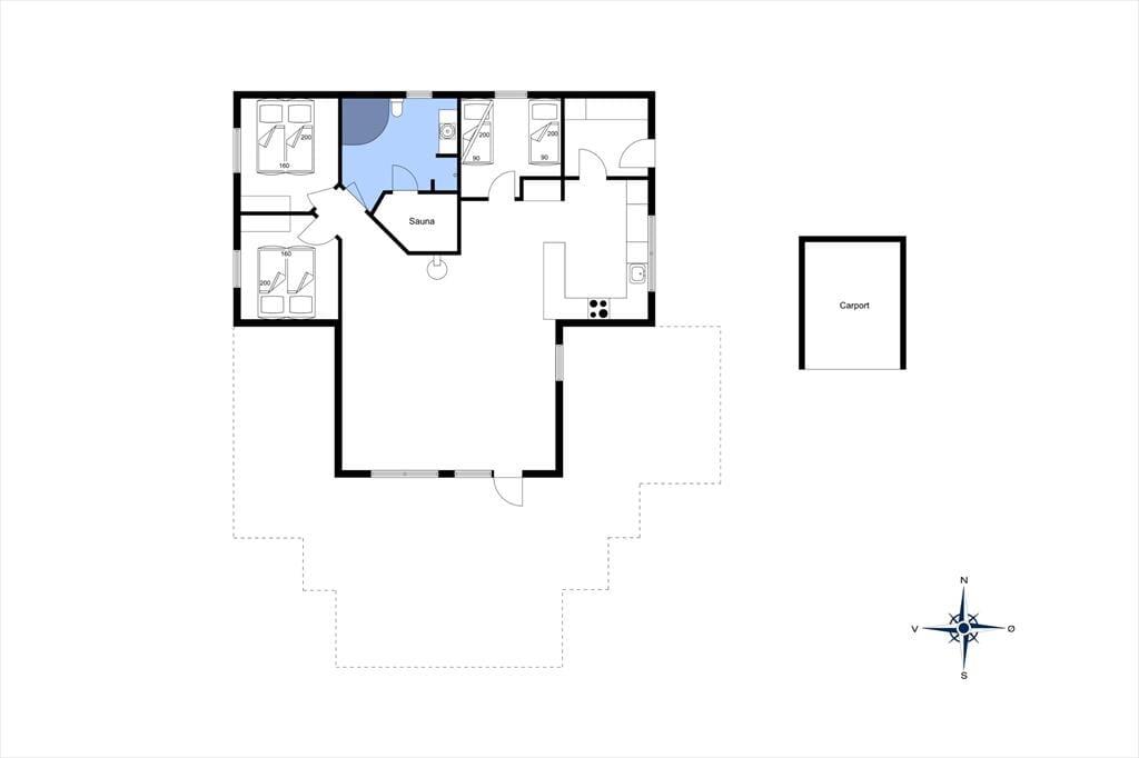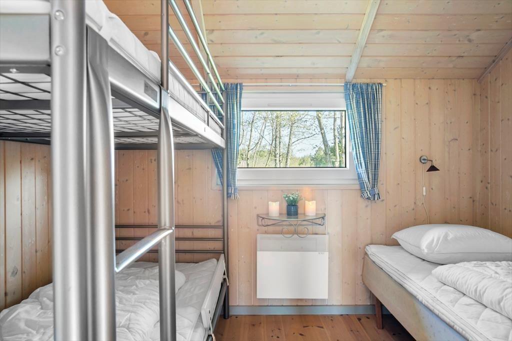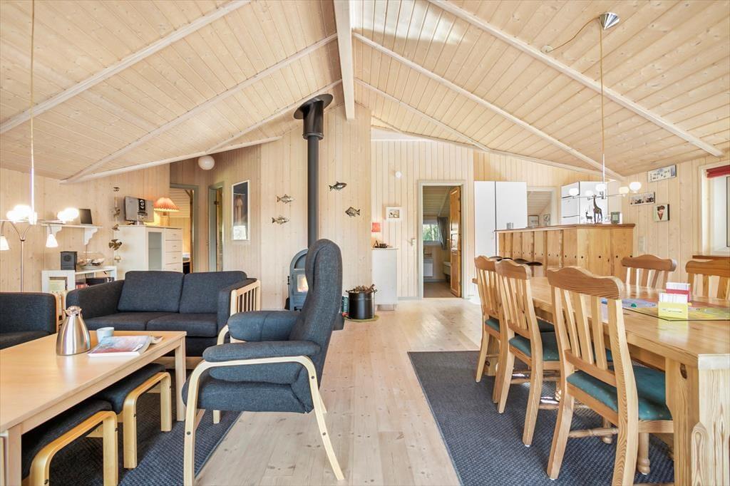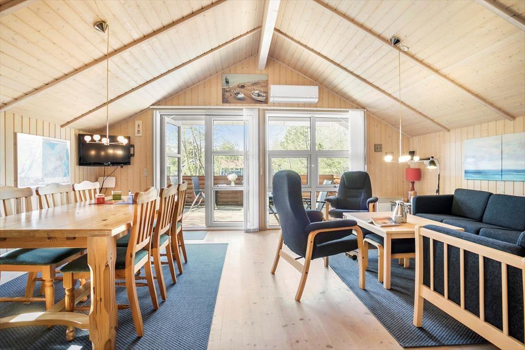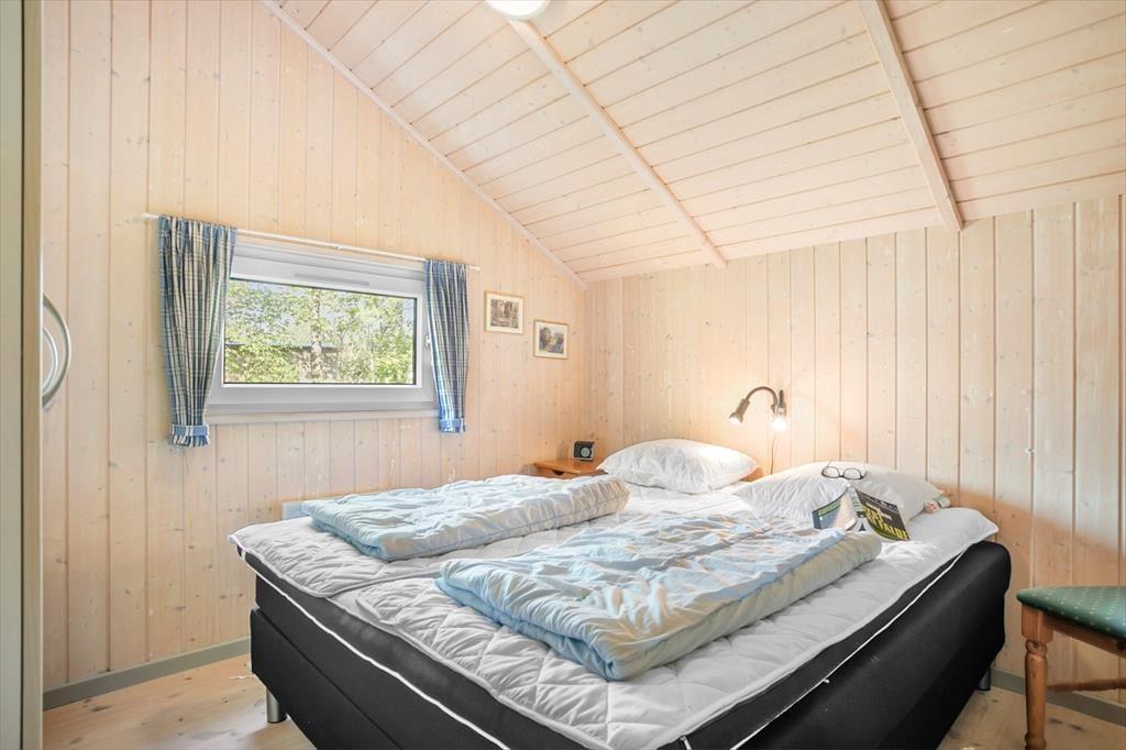 Det er nemt at føle sig hjemme i det 90 m2 store sommerhus, der har loft til kip, lyse trælister på væggene og komfortabelt møblement. Foruden den førnævnte brændeovn er der sofaafdeling og spisebord i stuen, og en disk med barstole markerer overgangen til køkkenet, hvor I kan trylle noget lækkert frem både morgen, middag og aften. I entréen er der vaskemaskine, mens husets syv sengepladser er fordelt på tre soveværelser, og endelig fuldendes planløsningen af et stort badeværelse med hjørnespabad, sauna og bruseniche.