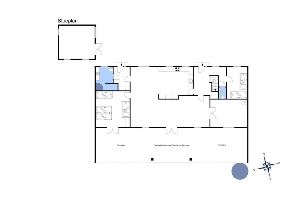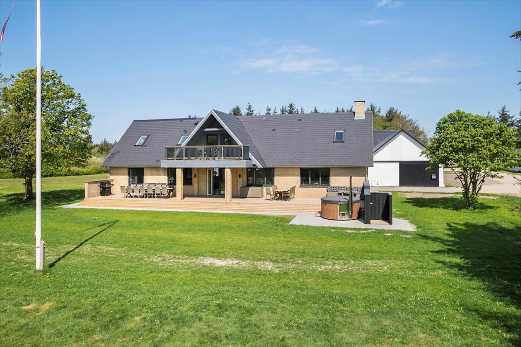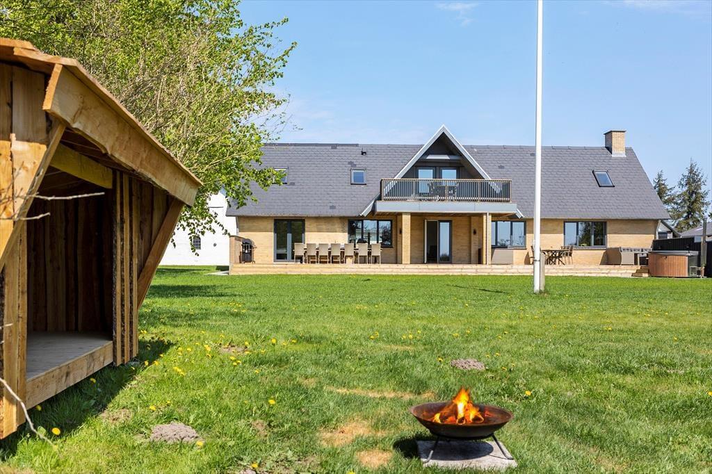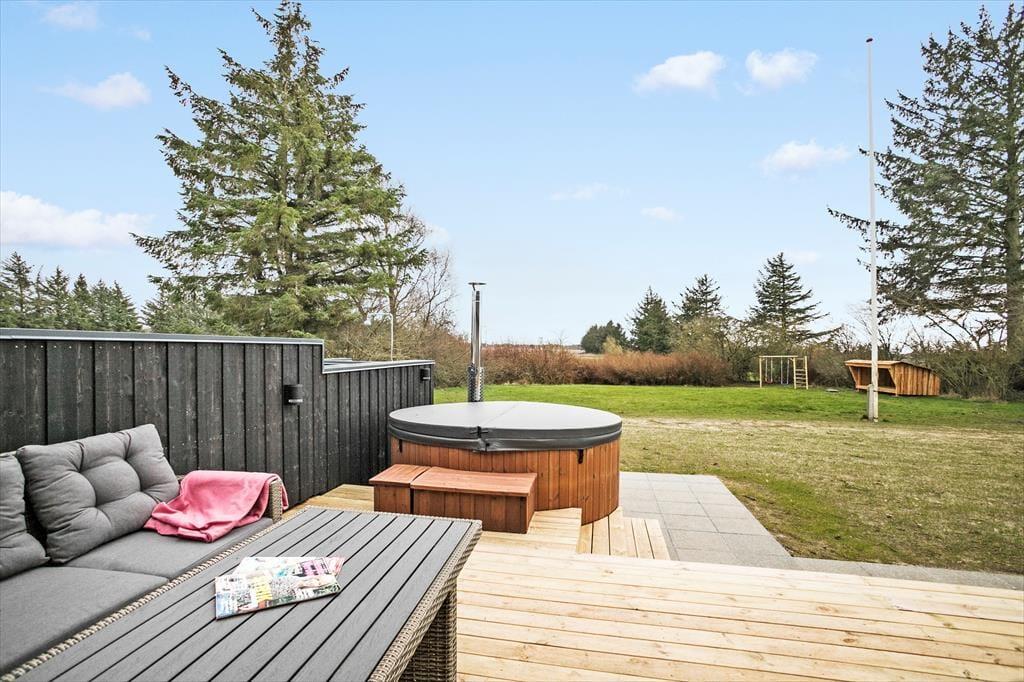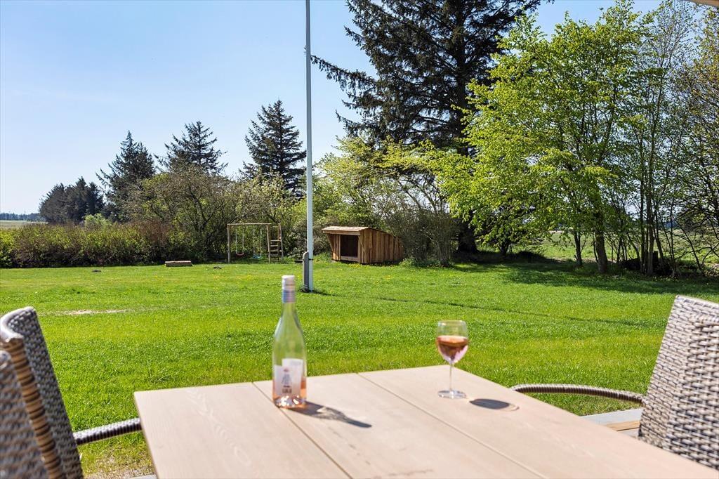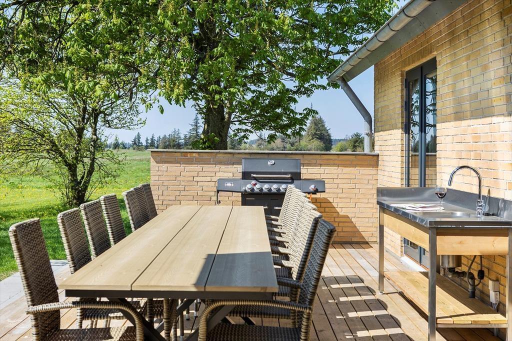 Fra stuen er der adgang til haven og den store sydvendte terrasse som er delvist overdækket. Her er god plads og hvis vejret tillader det, skal måltiderne naturligvis nydes her og måske endda tilberedes på grillen eller udekøkkenet. I forlængelse af terrassen, kan man nyde en stund i vildmarksbadet, som er en herlig sanseoplevelse i alt slags vejr. Havens græsplæne indbyder til boldspil og sjov for hele familien. Her også mulighed for at tage en overnatning i shelter og til de mindste er her gynger og sandkasse. De andre bygninger på grunden er ikke en del af lejemålet og vil være aflåste under opholdet.