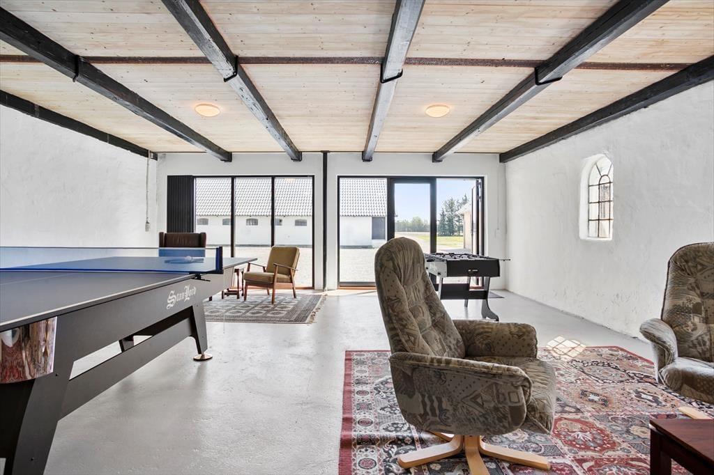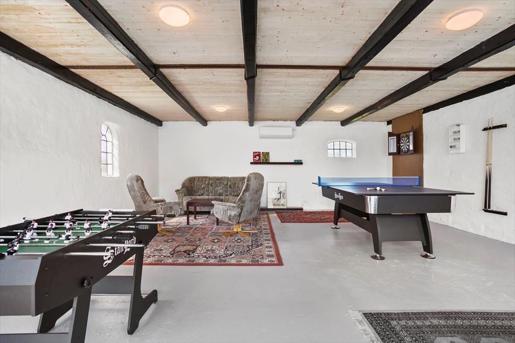 Til højre for stuehuset, er den dobbelte carport forvandlet til et aktivitetsrum, hvor der kan dystes mellem legebørn i alle aldre. Her er kombineret pool- og bordtennisbord, fodboldbord samt dart, som indbyder til mange timers sjov og hygge.