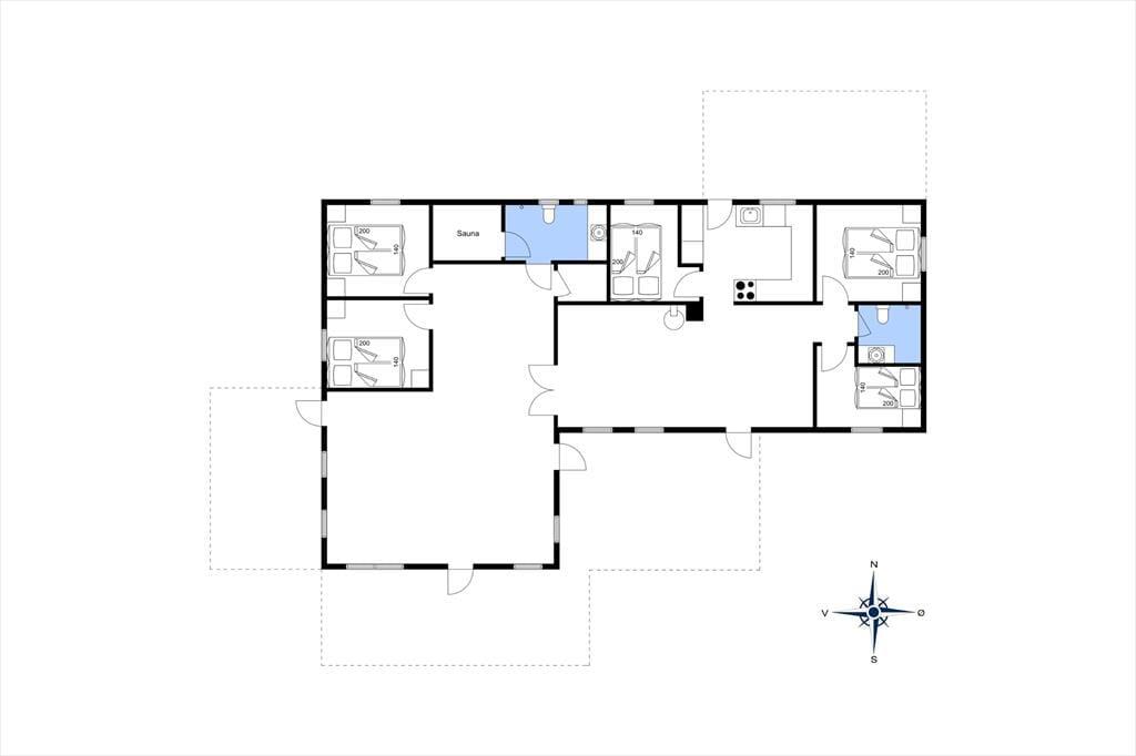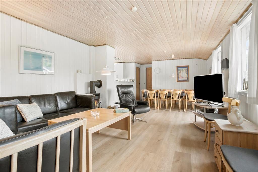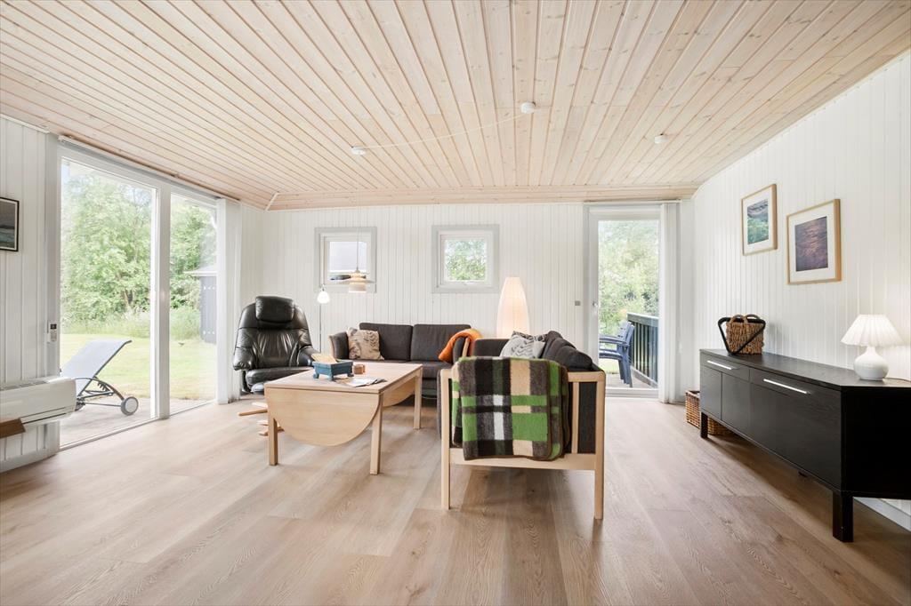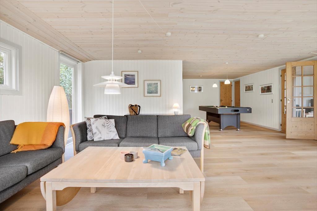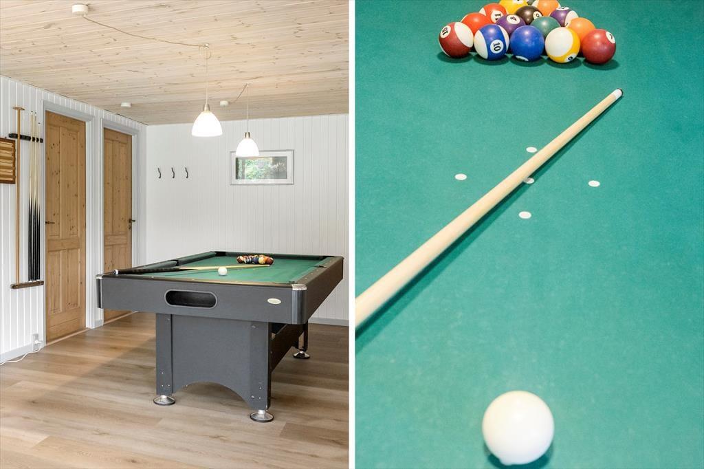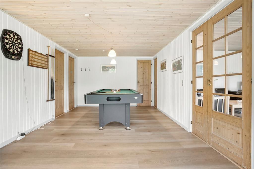 Takket være den gennemtænkte planløsning og de lækre faciliteter passer sommerhuset glimrende til to børnefamilier, og en parferie med gode venner kan også sagtens lade sig gøre. Der er dobbeltseng på alle fem soveværelser, og det ene af de to badeværelser er udstyret med en sauna, hvis dele af selskabet trænger til en stille stund i varmen. I aktivitetsrummet kan I spille pool og dart, lige så længe I orker, og her er der for øvrigt også en god sofaafdeling, der inviterer til brætspil eller en pause med en spændende roman. Der er også sofaarrangement i den tilstødende stue, der derudover har en brændeovn, et spisebord og et stort fladskærms-tv foruden åben forbindelse til et veludstyret køkken.