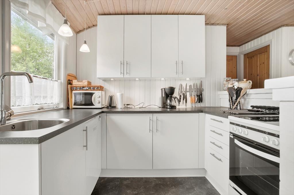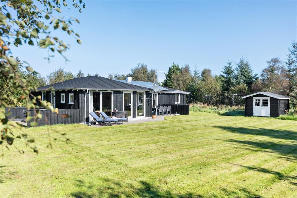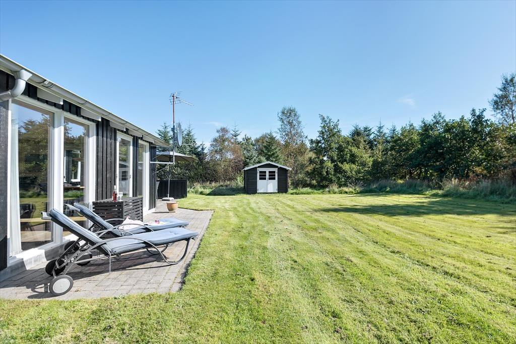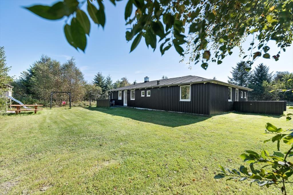 Med havedøre i stuen, køkkenet og aktivitetsrummet er det ingen sag at flytte frokosten ud i det fri eller tage avisen med ud til liggestolen. Der er flere dejlige terrasser at vælge imellem, og i haven er der også et legeområde til de mindste feriegæster med gynger, sandkasse og et legetårn med rutsjebane. Til bilen er der en carport, og endelig har I masser af plads til at spille bold på græsplænen, der skærmes af randbeplantning ind mod naboerne.
