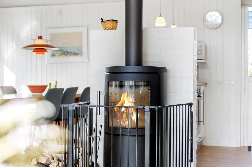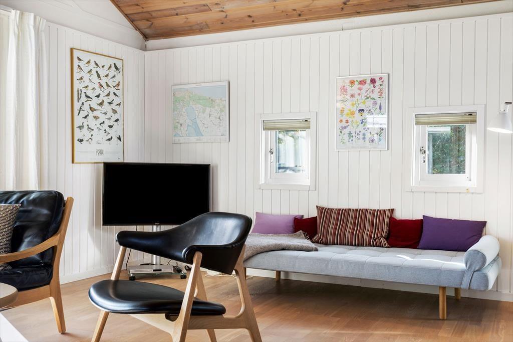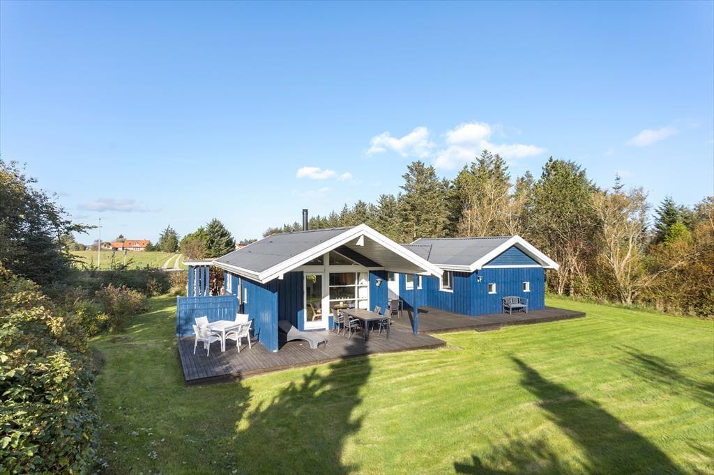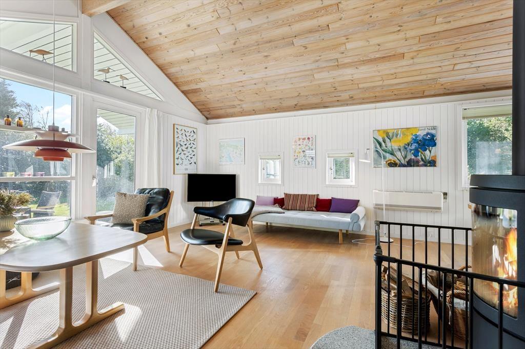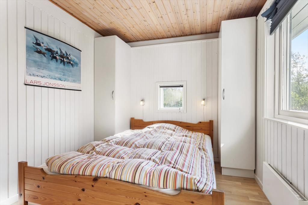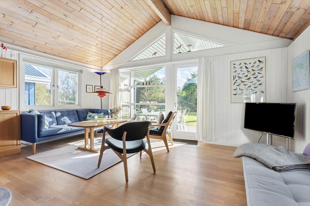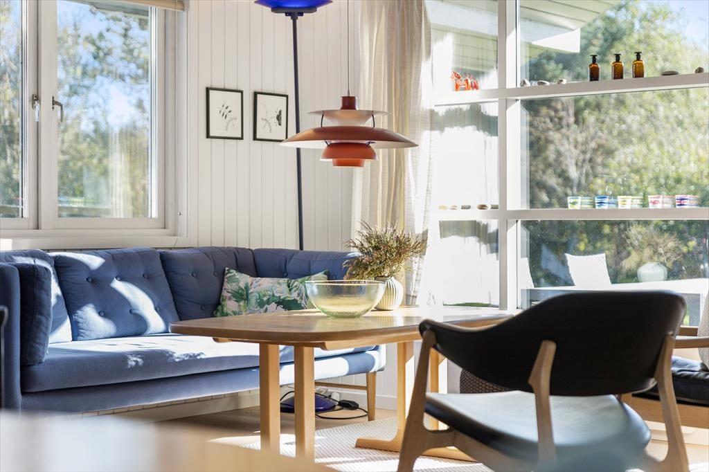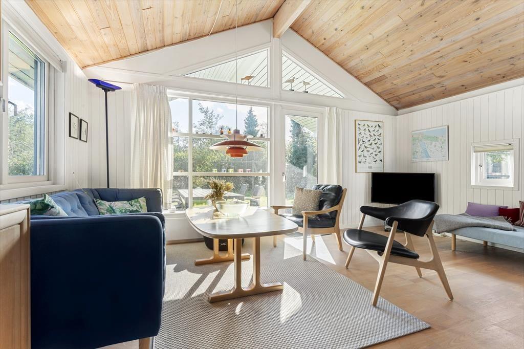 Det 91 m2 store sommerhus lyser op med sin blåmalede træfacade på den grønne grund. Inden døre er der loft til kip og både pænt og hyggeligt møblement, og især i stuen inviterer det store gavlvindue masser af dagslys indenfor. En brændeovn skaber stemning og bidrager med varme til ferier på køligere tidspunkter af året – og hvis det er sommerligt udenfor, kan I i stedet lave iskaffe i det åbne køkken og tage den med ud på terrassen. Fra entréen har I adgang til husets fire gode soveværelser såvel som et badeværelse med bruser og vaskemaskine.