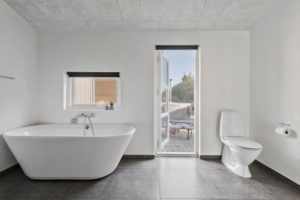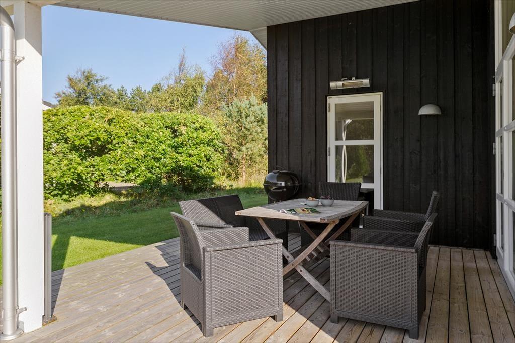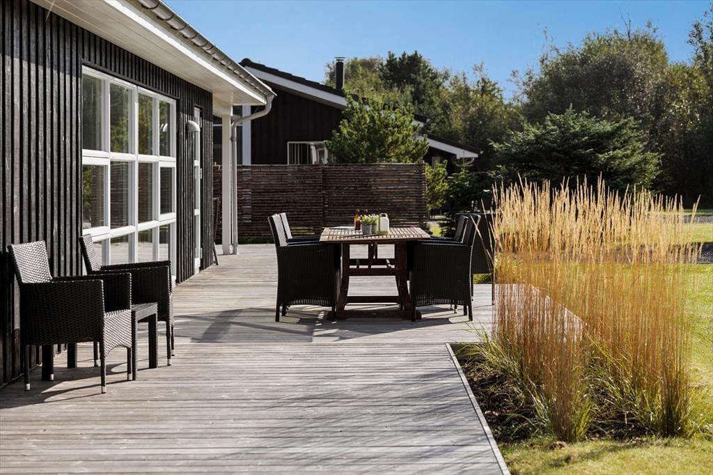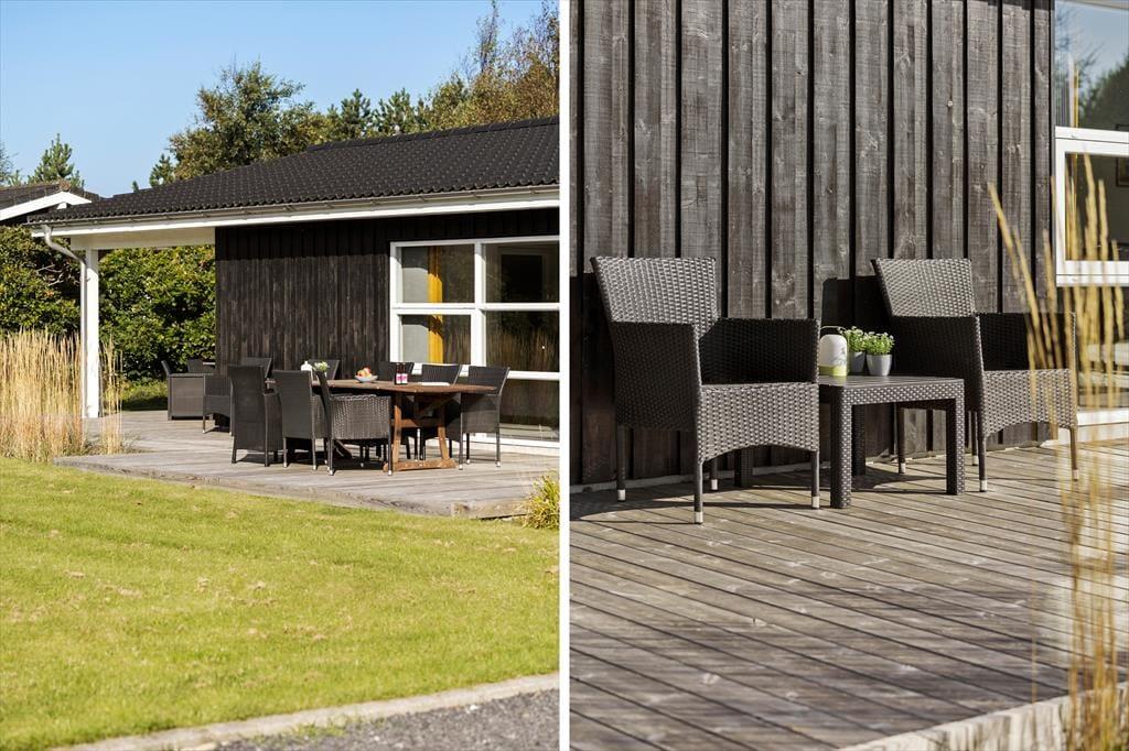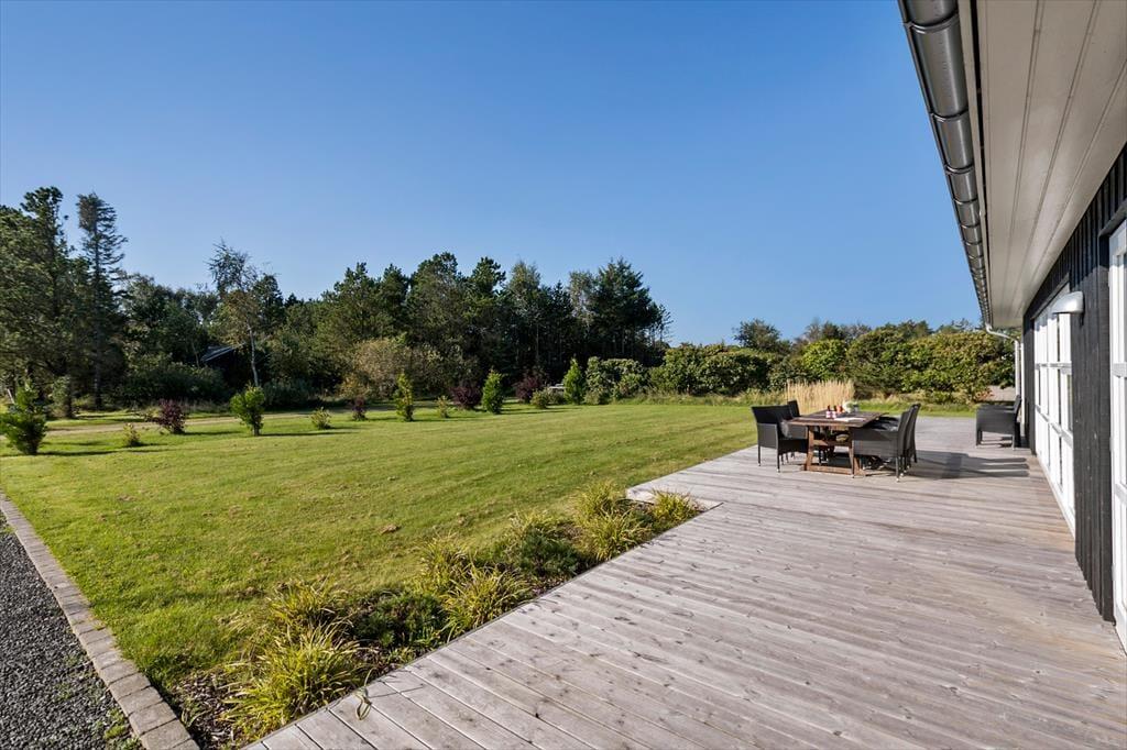 En af de absolutte perler ved dette sommerhus er den skønne terrasse med wellnessområde. Her kan du forkæle dig selv med en tur i vildmarksbadet eller nyde varmen fra den udendørs sauna – uanset om det er sommer eller vinter. Efter en lang gåtur til stranden eller en tur i klitterne er dette det ideelle sted at slappe af og genoplade batterierne. Den store terrasse indbyder også til måltider i det fri, og med havemøbler, liggestole og grill er der alle muligheder for hyggelige grillaftener i de lyse sommernætter. Haven er omkranset af smuk natur, og børnene kan lege trygt på grunden, mens de voksne nyder udsigten eller slapper af med en god bog.