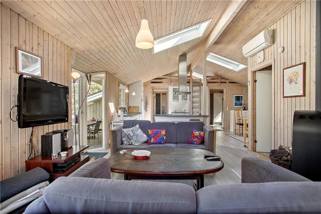 Sommerhuset er indrettet med et stort opholdsrum bestående af køkken, spisestue og stue. Dette sted bliver hurtigt det naturlige samlingspunkt. Store vinduespartier og ovenlysvinduer giver et skønt lysindfald. Udover opholdsrummet er der to badeværelser og fire soverum. Hvert soverum med to sovepladser. Her udover er der en hyggelig hems, hvor børn ofte finder fristed og kan gemme sig lidt væk når de voksne hygger.