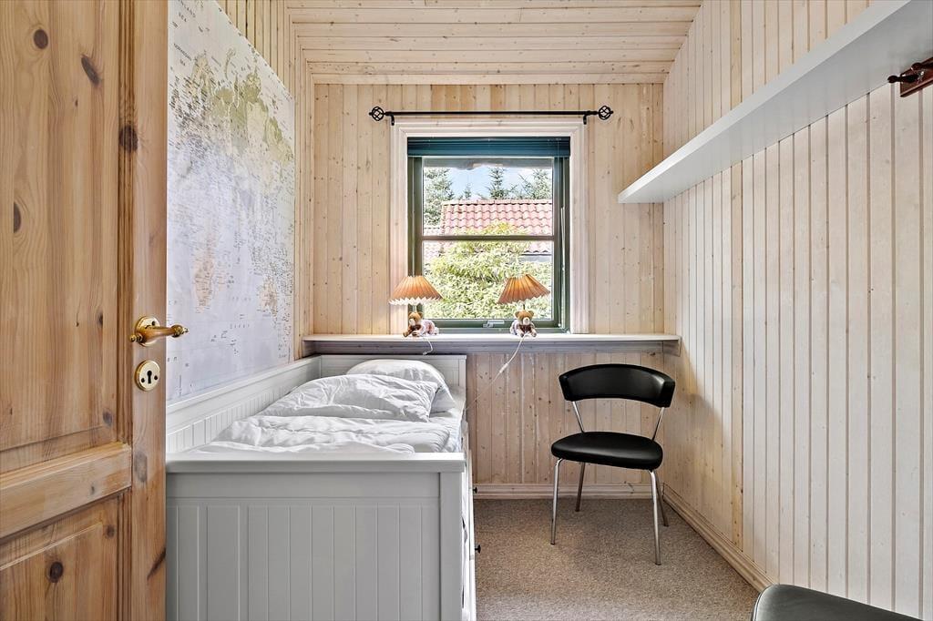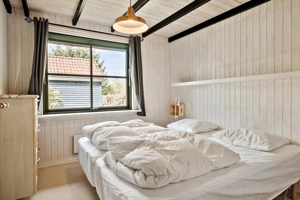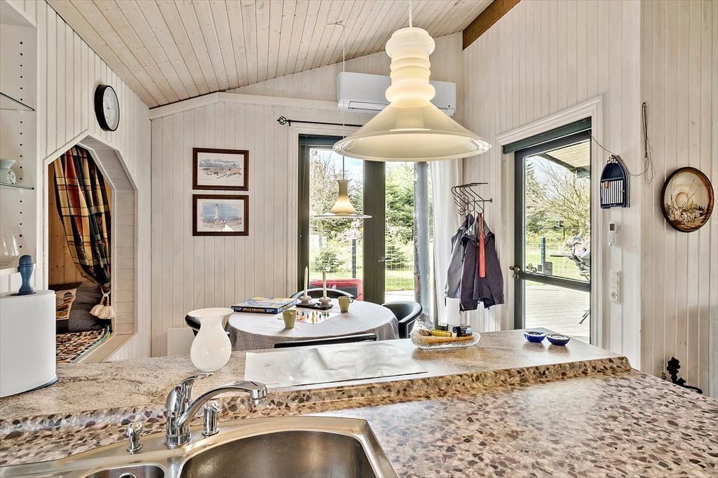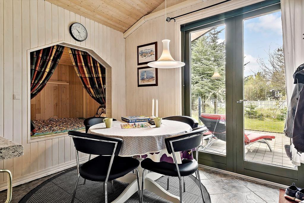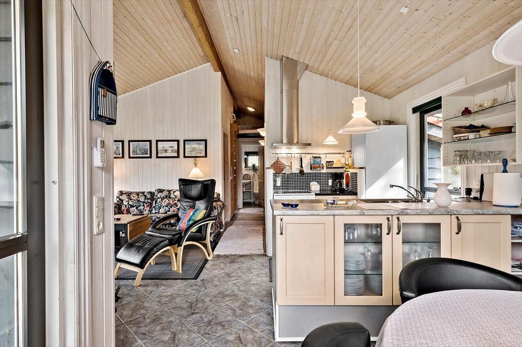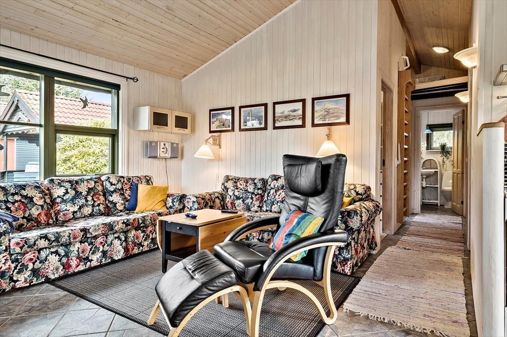 Sommerhuset er sådan en slags, du straks kan føle dig godt tilpas i, for rummene er fyldt med komfortabelt møblement og har en rar atmosfære. På helt klassisk manér er der brændeovn i stuen, og udover sofaarrangement, spisebord og et åbent køkken finder du også en dejlig alkove i opholdsrummet – den er helt perfekt til en god middagslur, og om natten fungerer den også som et glimrende supplement til sengene på de to soveværelser. Planløsningen byder på praktisk vis på et badeværelse og et ekstra toilet, såalt i alt fungerer huset som en skøn feriebolig for fire personer.
