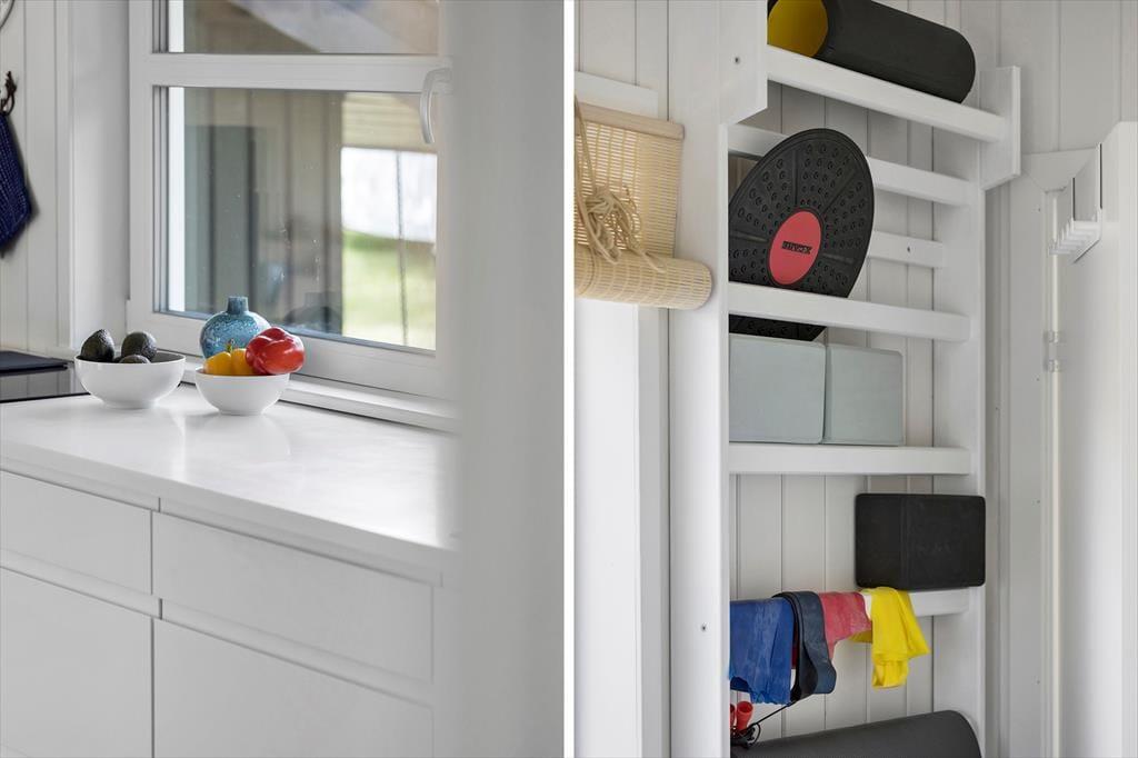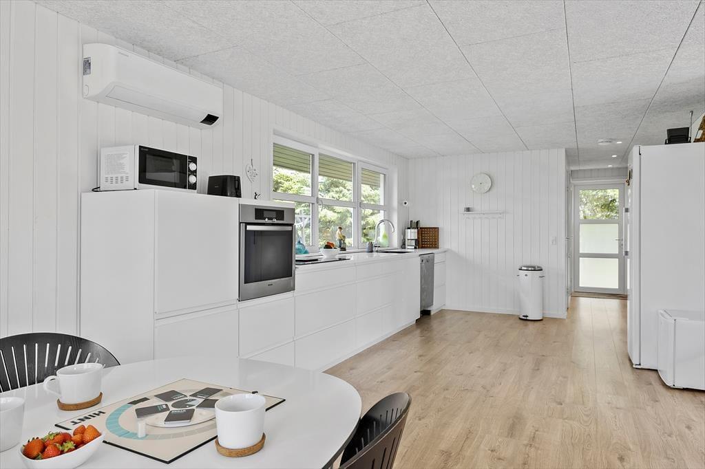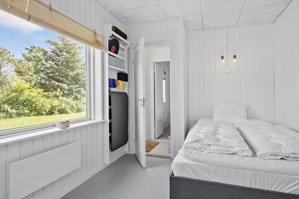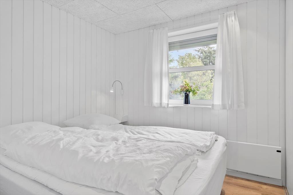 Det 100 m2 store sommerhus har en lys og venlig atmosfære, der inviterer til hygge og afslapning – og annekset på 30 m2 er holdt i samme enkle indretningsstil, så der er det også rart at være. I alt er fire soveværelser fordelt i de to bygninger, mens hovedhuset derudover rummer et badeværelse, et gæstetoilet og en stor stue med integreret køkken. Her i opholdsrummet er der god plads til at gøre madlavningen til et fælles hyggeprojekt, og både spisebordet og sofaarrangementet er dejlige steder at samles til brætspil, filmaftener, grin og gode samtaler. Når vejret er solrigt og sommerligt, kan du lade stuens havedøre stå åbne, så du og familien kan smutte ind og ud, som det passer jer.