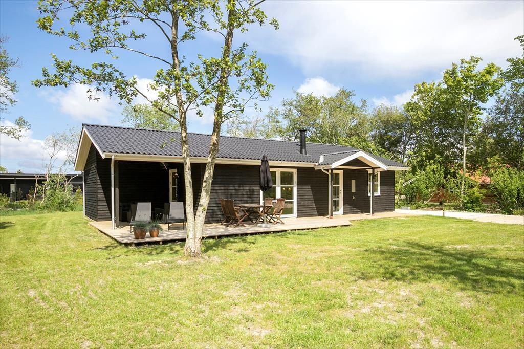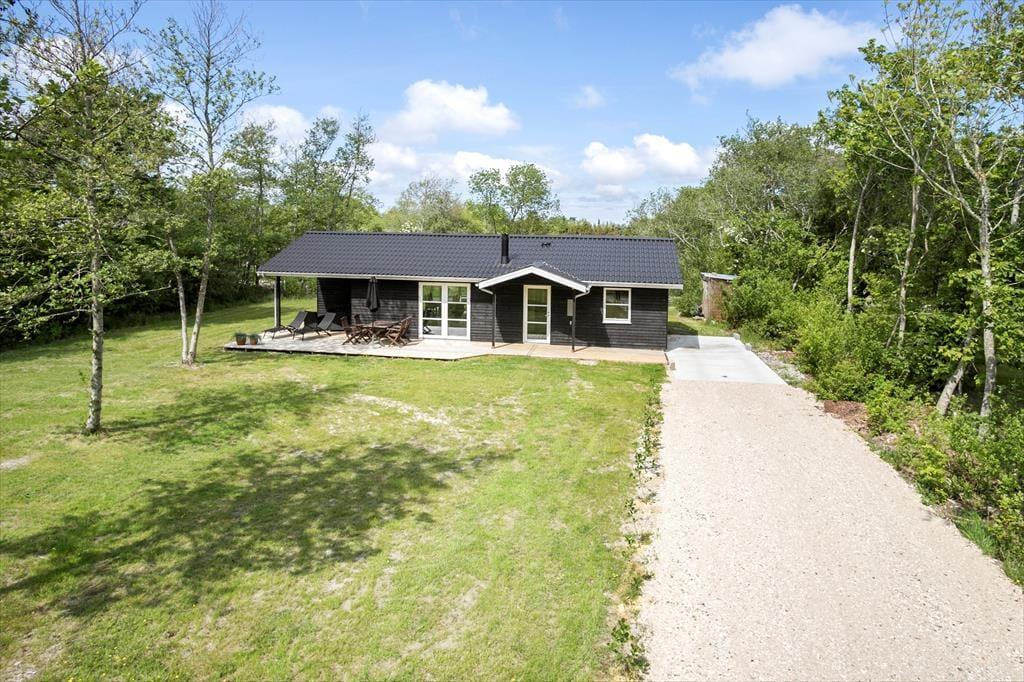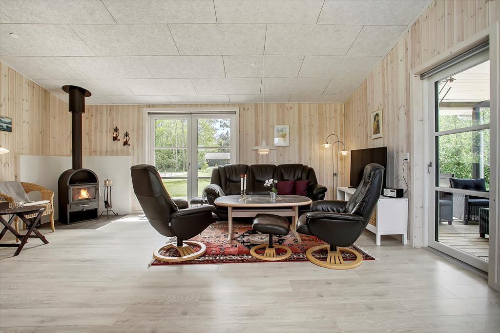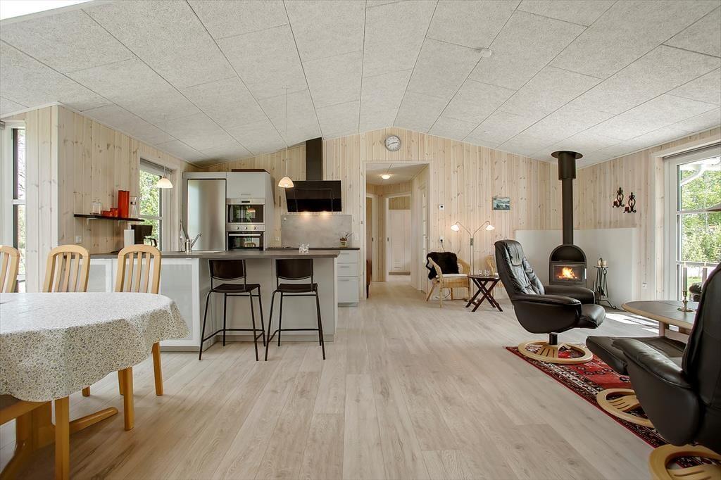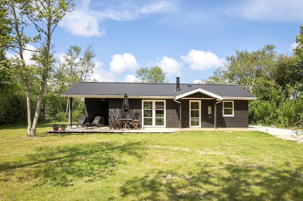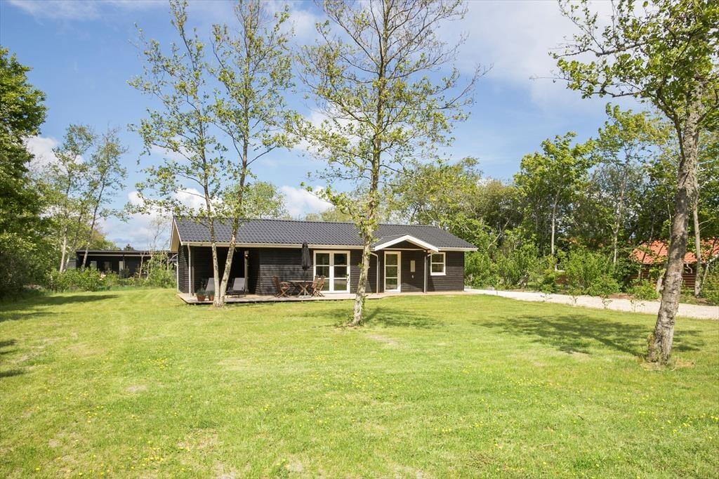 Huset, som er bygget i 2022, er et kvalitetsbyggeri på 89 m2. På klassisk sommerhusmanér er der lyse trælister på væggene, og med akustikloft med ovenlysvindue samt indfaldslys fra tre verdenshjørner er rumfornemmelsen helt i top i stuen. De mange vinduer sørger for, at I har kig til den grønne have, uanset om I står i det åbne køkken, sidder samlet om spisebordet eller slapper af i sofaafdelingen nær brændeovnen. Er det ved at være sengetid – eller trænger I bare til en pause på langs med en god bog – har I tre gode soveværelser til rådighed med i alt seks sengepladser. Endelig fuldendes planløsningen af et badeværelse med bruser og en entré med vaskemaskine.