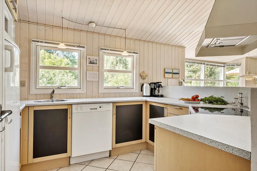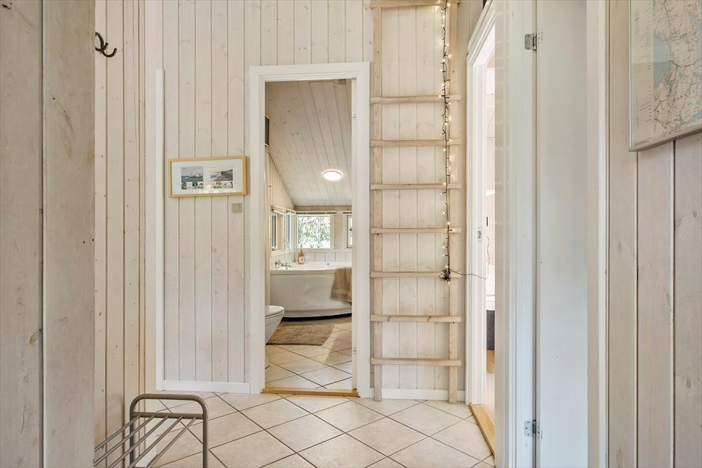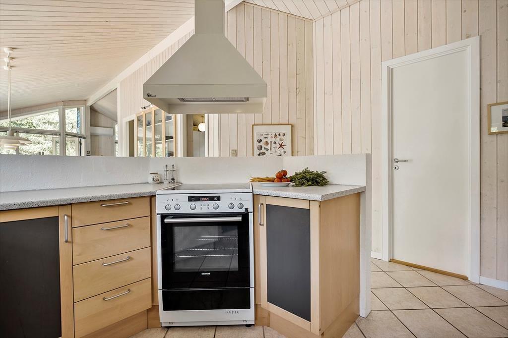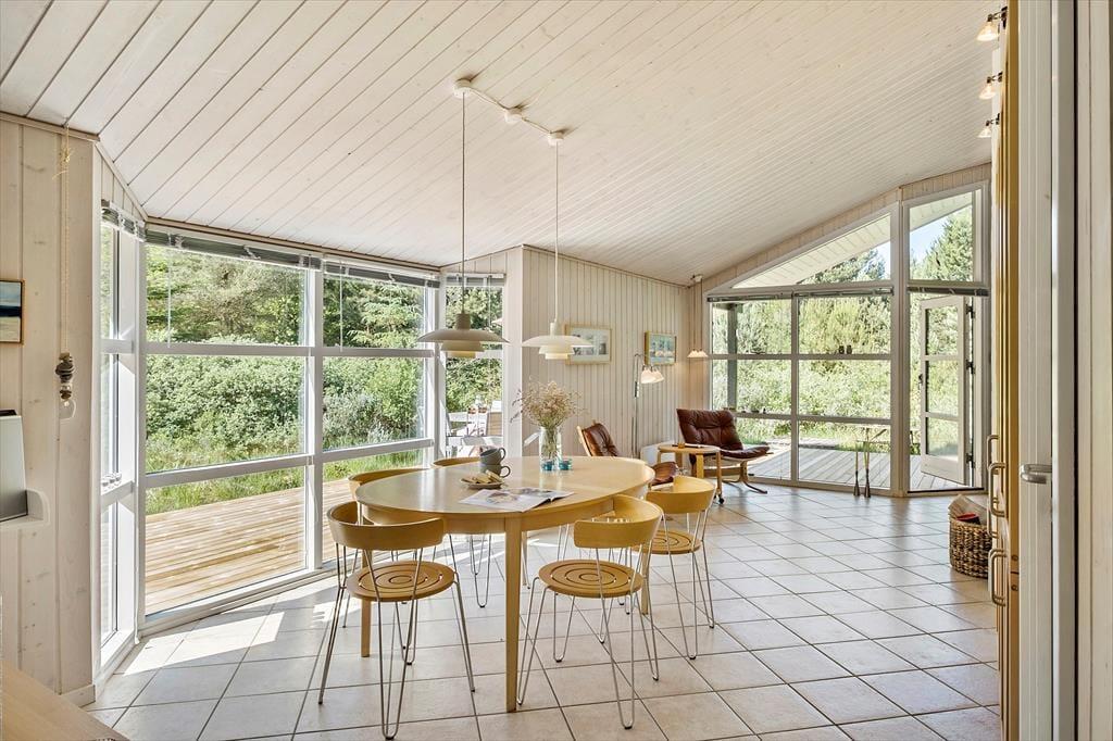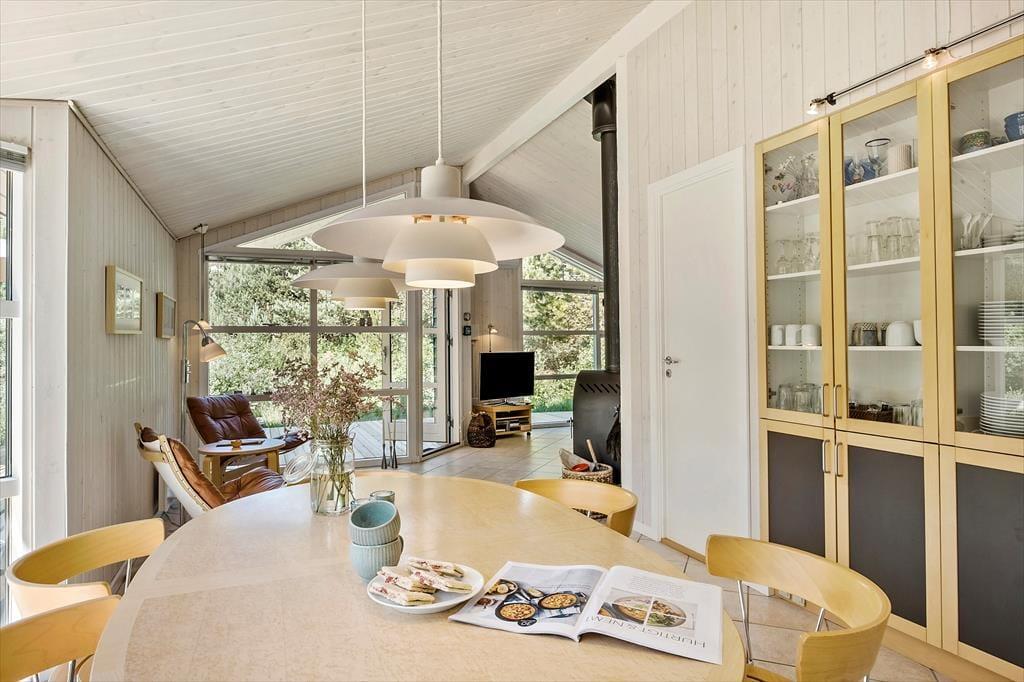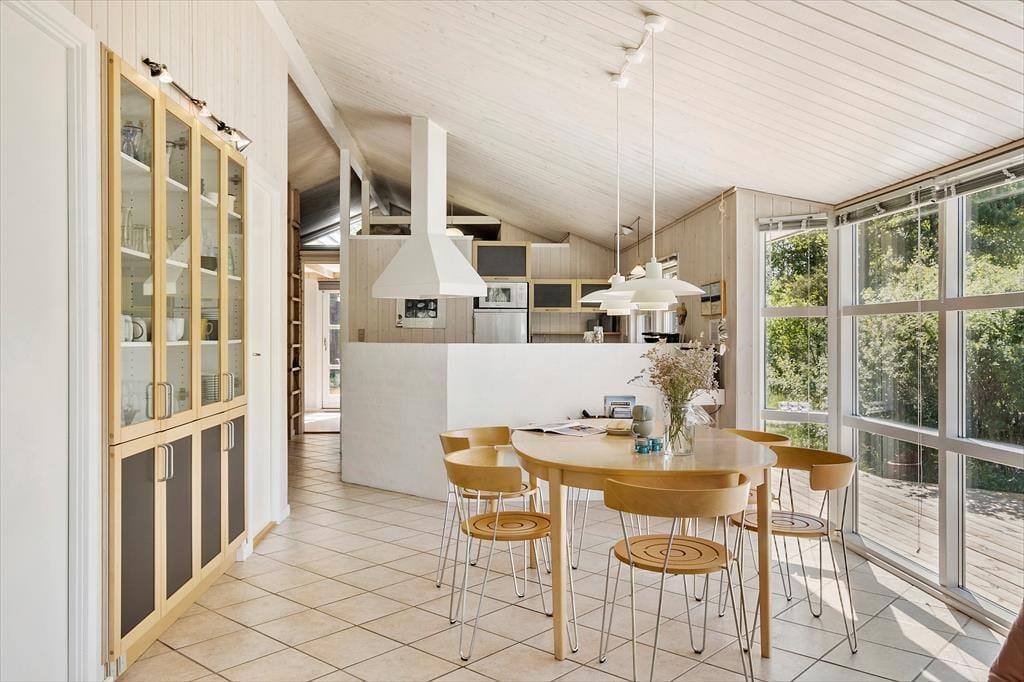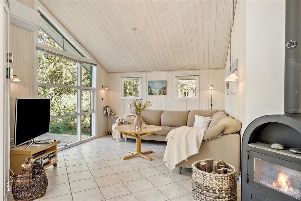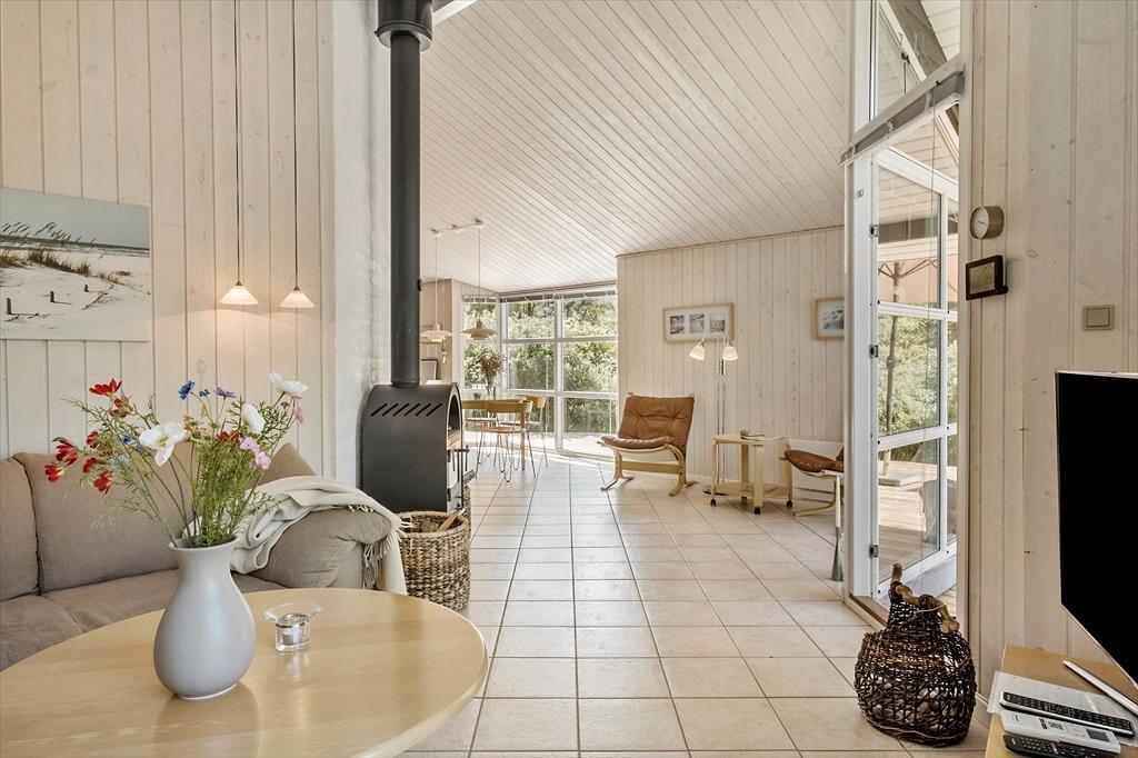 Når du træder indenfor, møder du en klassisk og indbydende sommerhusstemning, der gør det let at finde ro. I stuen, som er præget af lyse trævægge og loft til kip, kan du nyde aftenerne med hygge foran brændeovnen. Køkkenet er åbent og forbundet med opholdsrummet, så du nemt kan tilberede feriemåltider, mens samtalerne fortsætter på tværs af rummene. Når dagen går på hæld, er der tre hyggelige soveværelser at fordele sig på, som alle byder på en god nats søvn. Huset har desuden to badeværelser – en praktisk fordel for familier eller grupper, der ferierer sammen.
