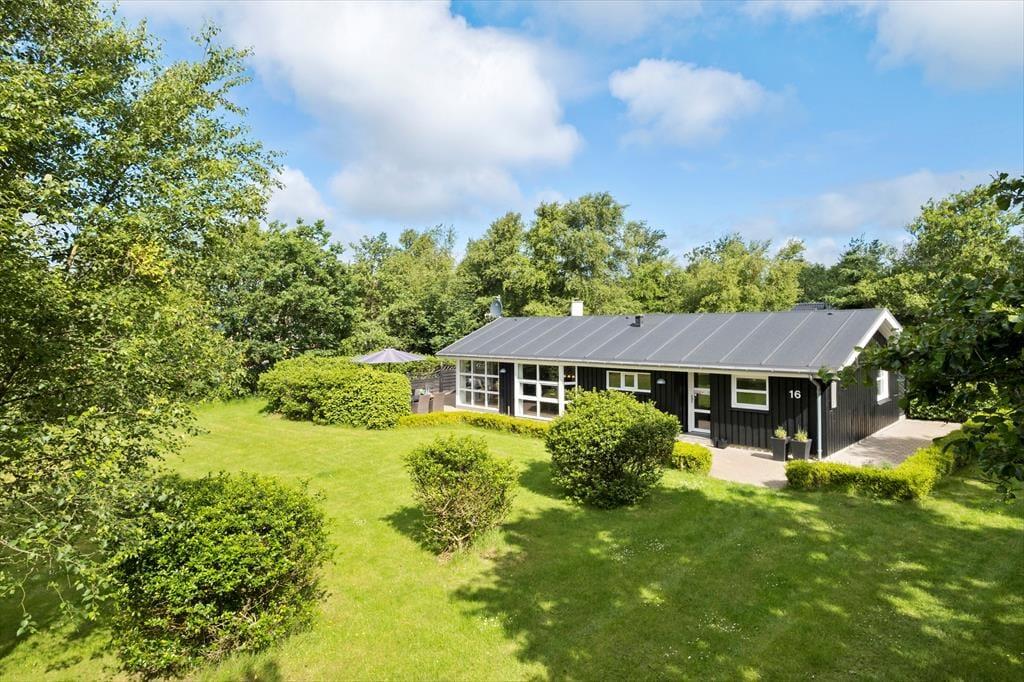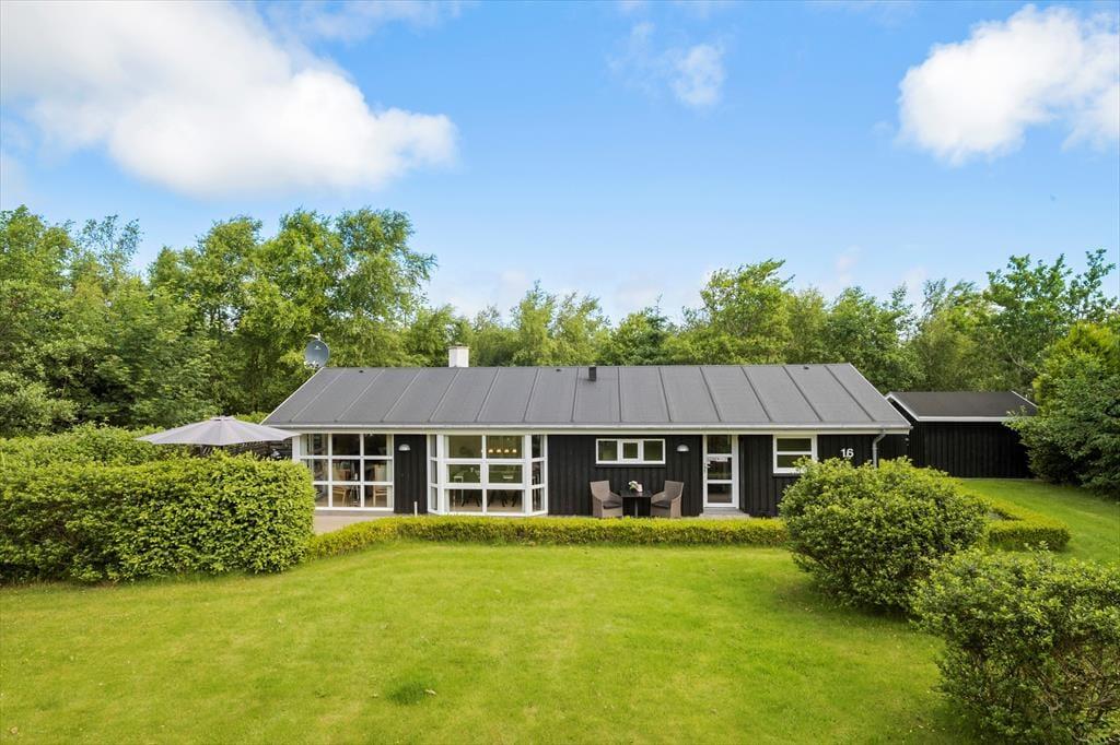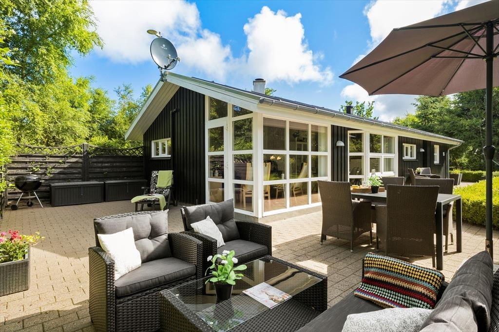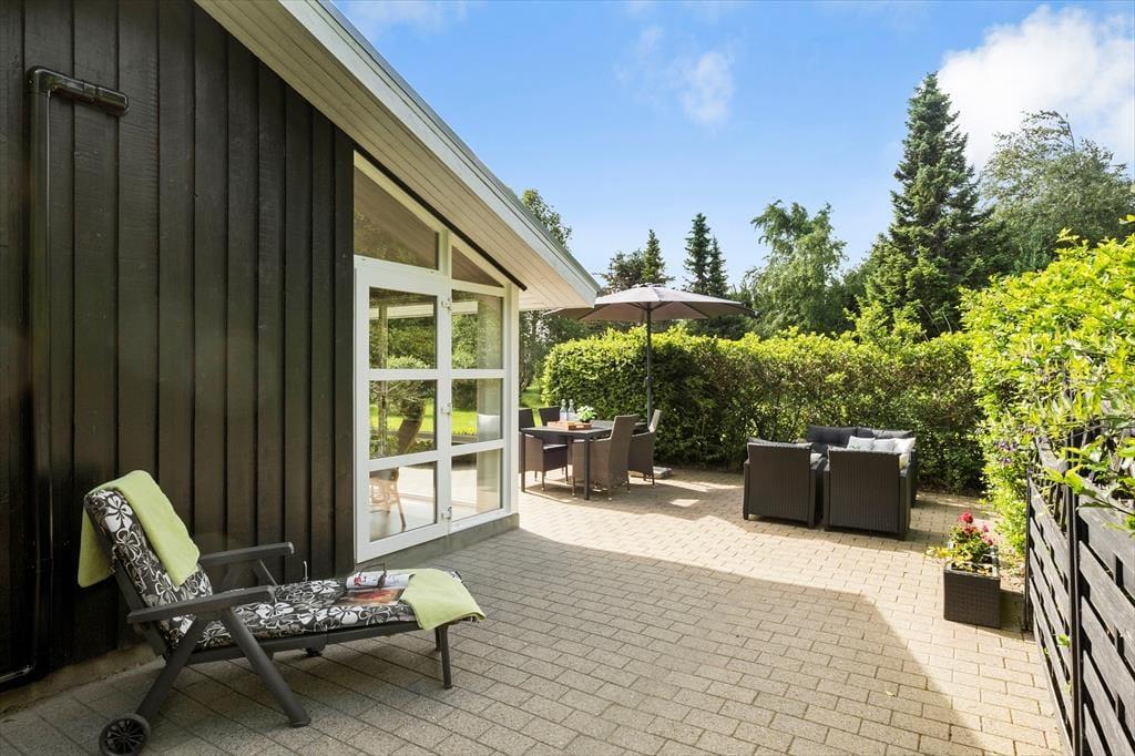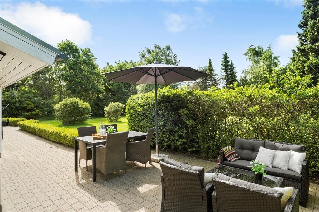 Fra stuen kan I træde direkte ud på en stor, flisebelagt terrasse, der smyger sig om tre sider af sommerhuset. Liggestole, havemøbler og parasol er til rådighed, så udelivet bliver særdeles komfortabelt, og der er også en grill, hvis I foretrækker at tilberede sommermåltiderne ude i det fri. Efter aftensmaden får I måske lyst til at røre jer lidt – og i så fald er det rart, at der er masser af plads til at lege og spille havespil på den grønne græsplæne. Da der er yderst gode muligheder for at udfordre MTB-evnerne i området, er der opført et aflåseligt skur på grunden, til opbevaring af cykler og andet udstyr.
