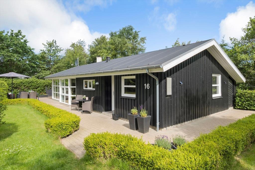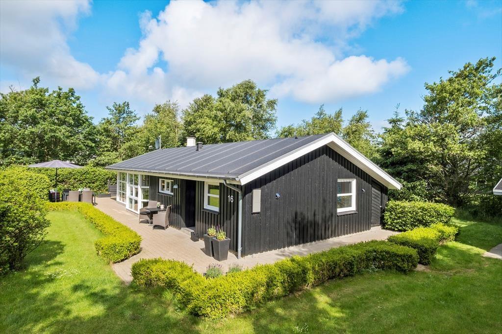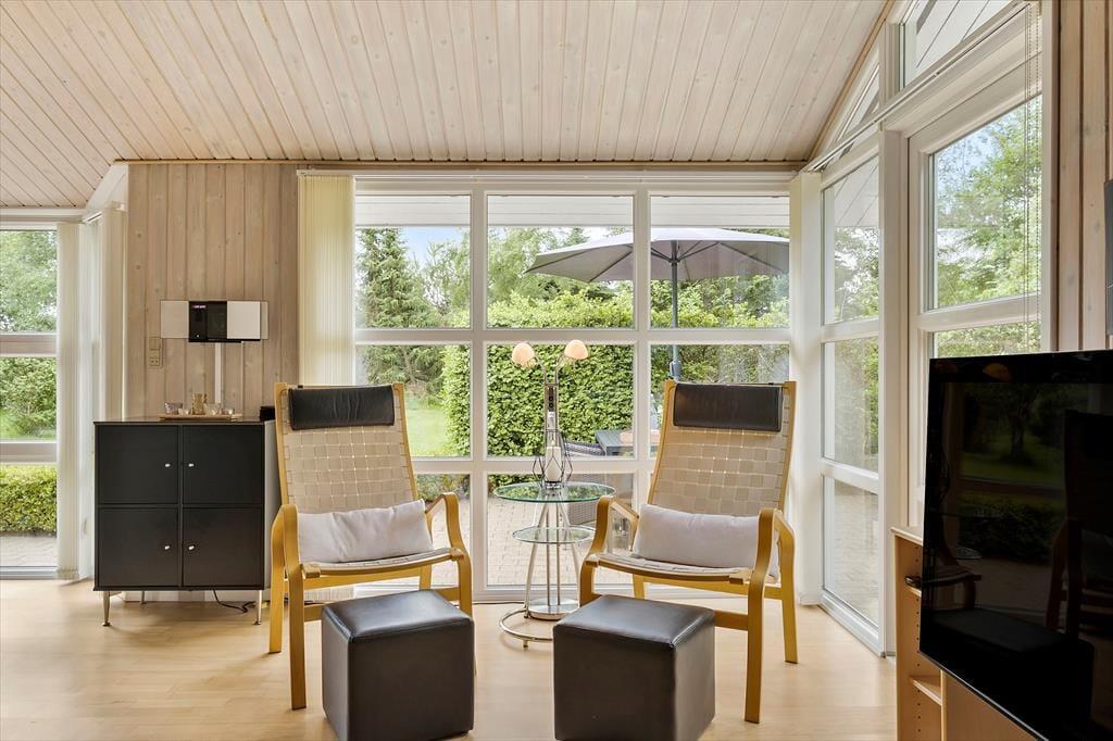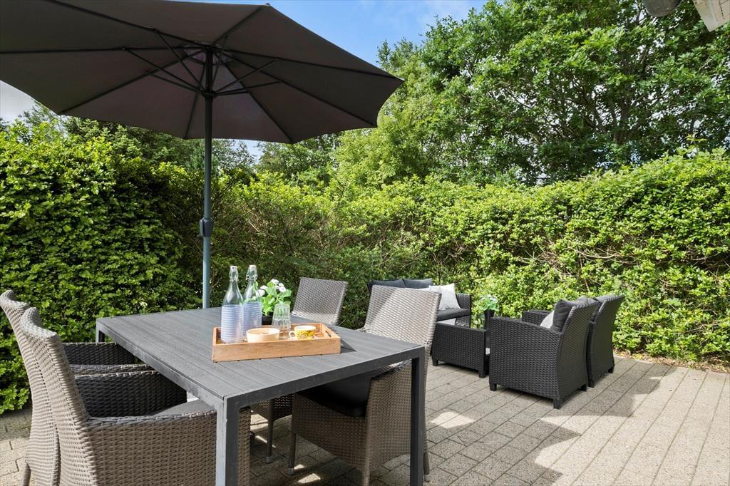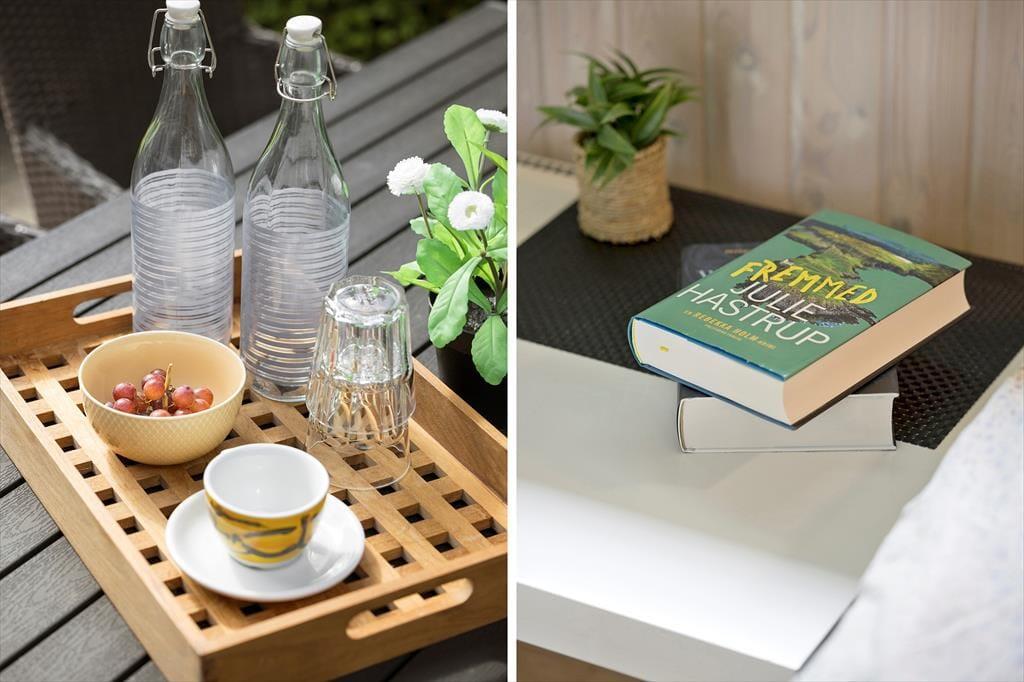 Fra stuen kan I træde direkte ud på en stor, flisebelagt terrasse, der smyger sig om tre sider af sommerhuset. Liggestole, havemøbler og parasol er til rådighed, så udelivet bliver særdeles komfortabelt, og der er også en grill, hvis I foretrækker at tilberede sommermåltiderne ude i det fri. Efter aftensmaden får I måske lyst til at røre jer lidt – og i så fald er det rart, at der er masser af plads til at lege og spille havespil på den grønne græsplæne. Da der er yderst gode muligheder for at udfordre MTB-evnerne i området, er der opført et aflåseligt skur på grunden, til opbevaring af cykler og andet udstyr.