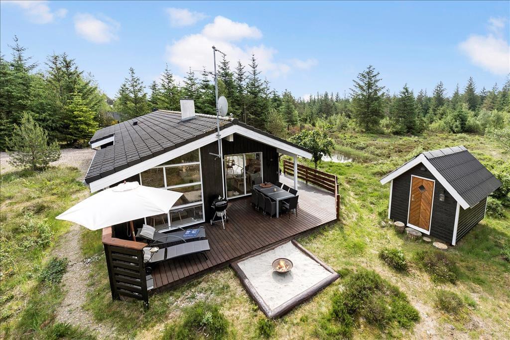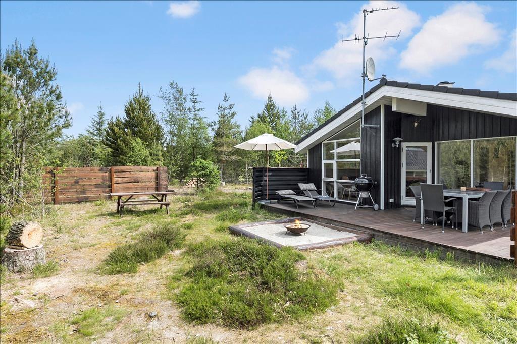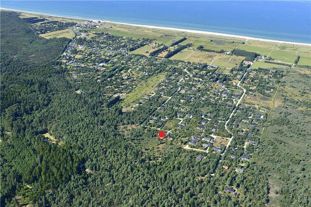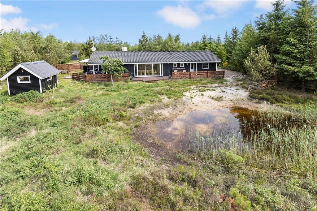 Sommerhuset ligger for enden af vejen på en utrolig flot naturgrund med frit udsyn til lyng og hede og andet kønt og spredt bevoksning. Det er rolige og smukke omgivelser og egner sig til alle, som sætter pris på fred, ro og smuk natur. Der er anlagt en flot sydvendt træterrasse, samt en delvist overdækket terrasse mod sydvest, hvor man kan nyde de lange, lune sommeraftener med grillmåltider og afslapning.