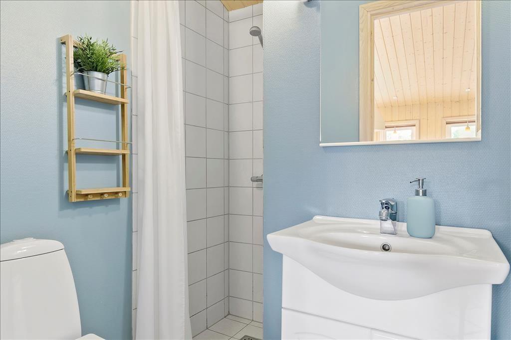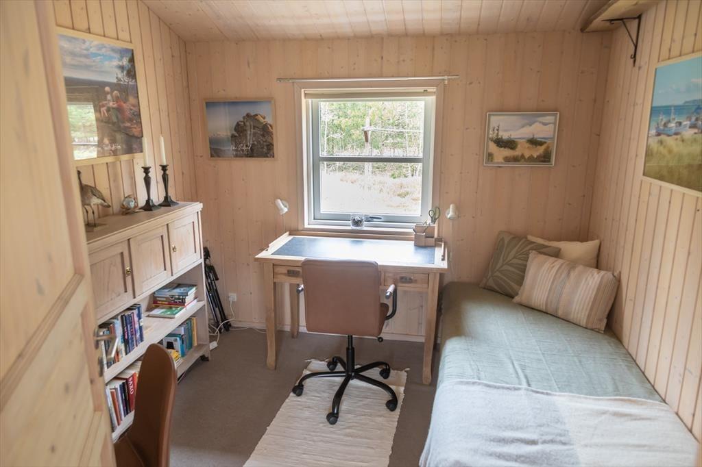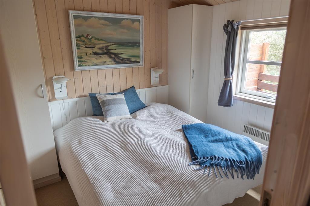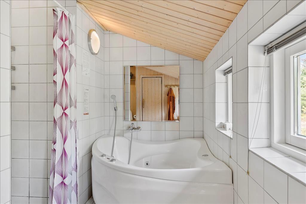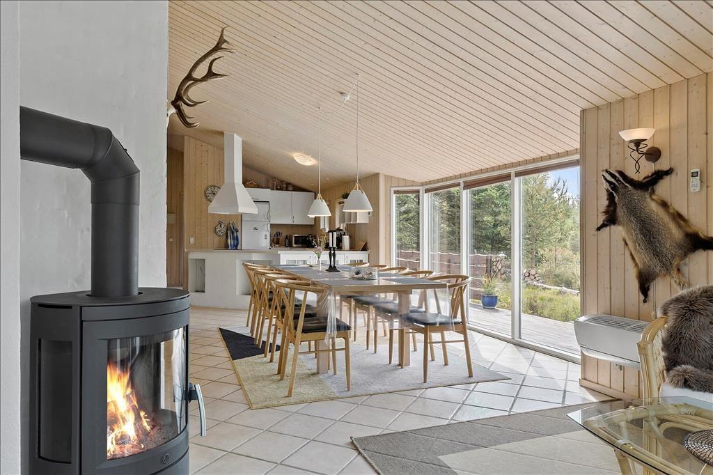 Dette sommerhus hører til i vores kategori for luksussommerhuse; her er nemlig alt indenfor hårde hvidevarer, gode møbler, moderne teknisk udstyr og oveni en fantastisk flot beliggenhed med god udsigt og store chancer for at se rådyr og andet vildt spadsere forbi udenfor vinduerne. Med syv sengepladser og to badeværelser er her god plads til en stor familie; det ene badeværelse er udstyret med spabad og sauna, og her kan man også vaske og tørre tøj. Køkken, spisestue og stue hænger sammen i ét stort, åbent rum med en flot brændeovn til at sprede varme og hygge på kølige morgener eller aftener. Et dejligt hus med en god kombination af hygge, komfort og luksus!