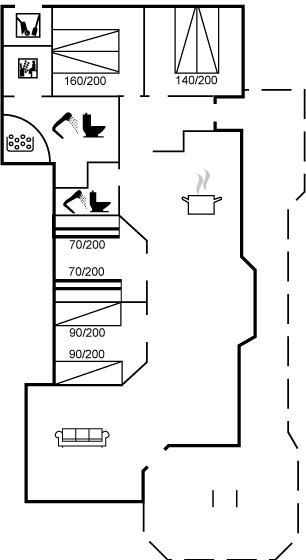 Der er i alt 4 soveværelser. Sovepladserne fordeler sig på: 4 sovepladser i dobbeltsenge. 2 sovepladser i enkeltsenge. 4 sovepladser i køjesenge. Derudover er der 1 stk. barneseng.