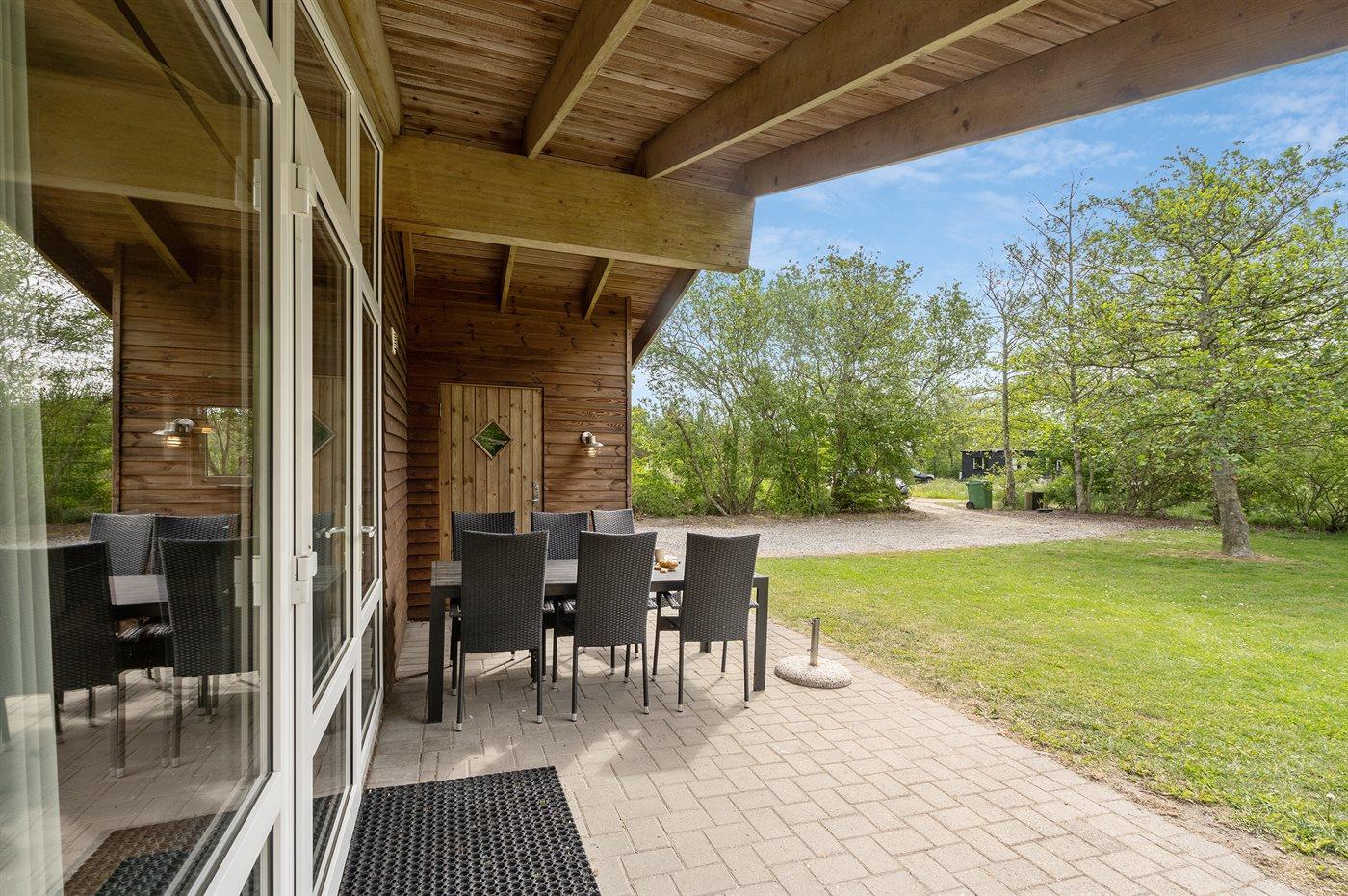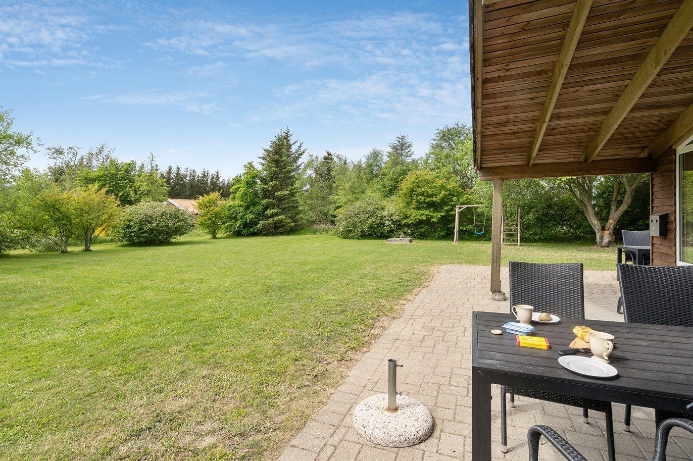 Ferieboligen er beliggende på en 1386 m² stor naturgrund. Grunden er indhegnet. Der er 900 m til havet. Nærmeste forretning er beliggende i en afstand af 5000 m. Der er en golfbane i en afstand af 8000 m. Til ferieboligen hører åbent terrasseareal. Desuden er der overdækket terrasse. Der er redskabsrum. Gynge. Sandkasse. Grill til rådighed. Der er installeret stik til opladning af elbil. Parkering ved ferieboligen.