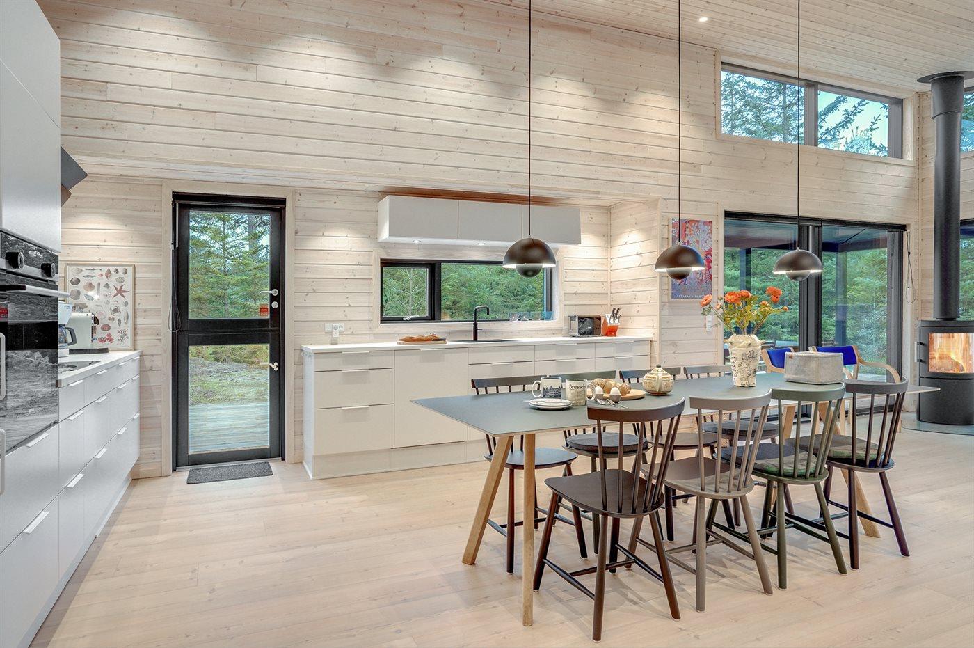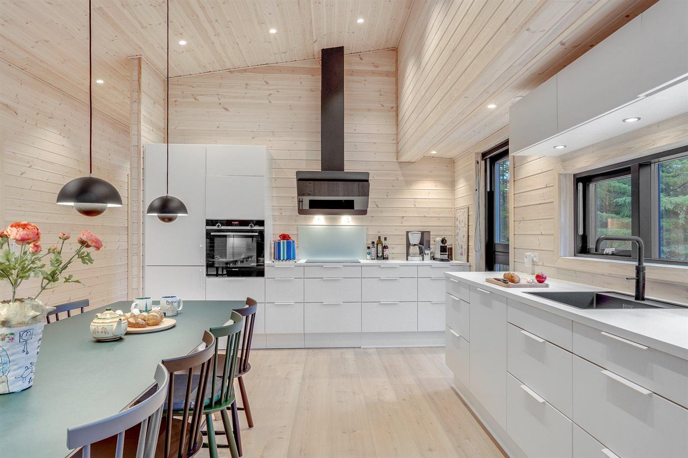 Køkkenet er udstyret med 1 køleskab. Der er 4 induktionskogeplader, varmluftovn, mikrobølgeovn samt opvaskemaskine.