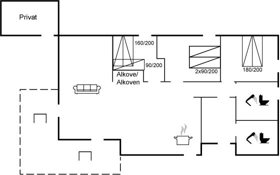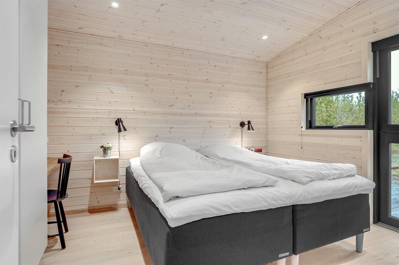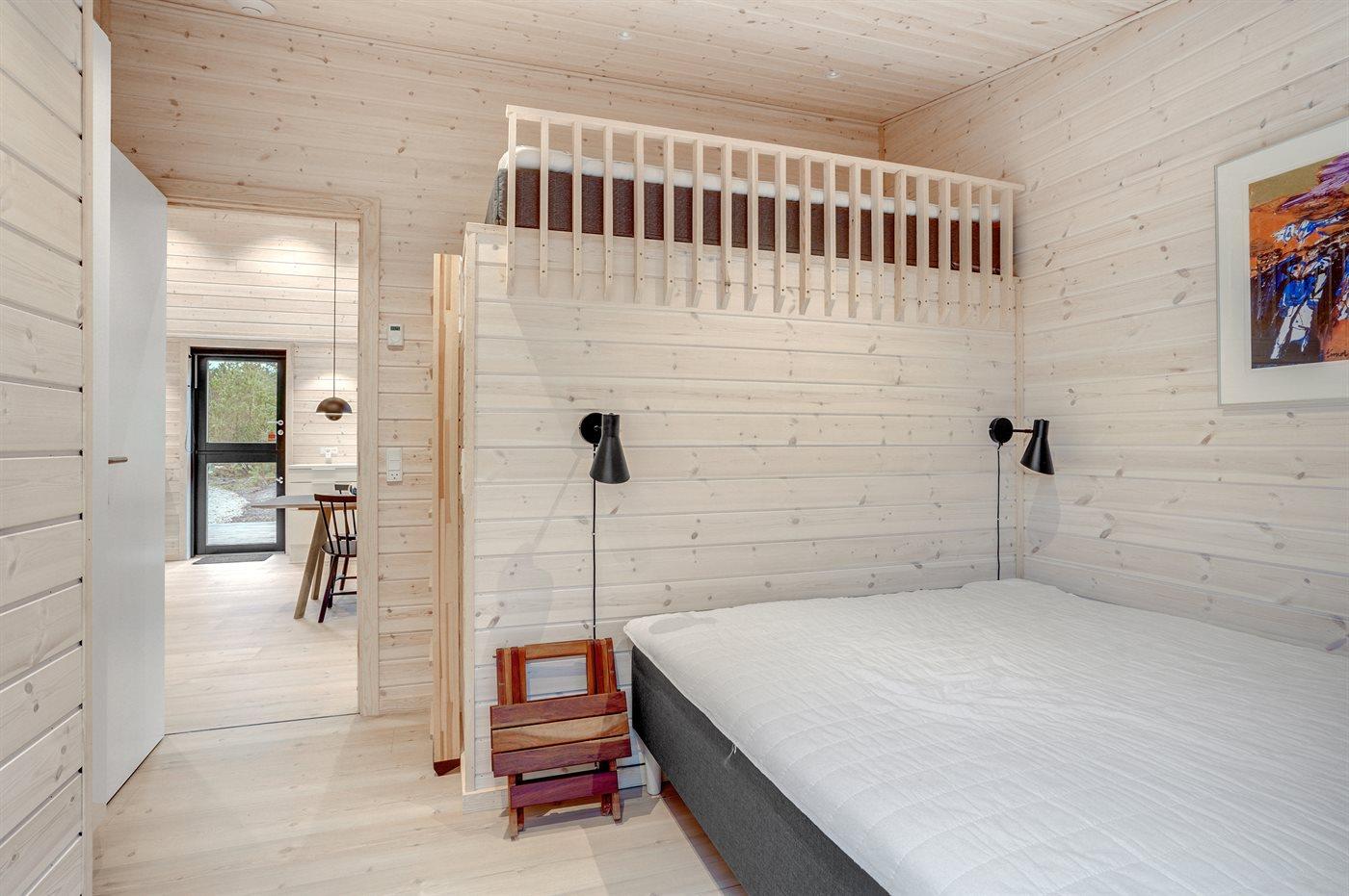 Der er i alt 3 soveværelser. Sovepladserne fordeler sig på: 4 sovepladser i dobbeltsenge. 2 sovepladser i enkeltsenge.1 soveplads i køjeseng. Derudover er der 1 stk. barneseng.