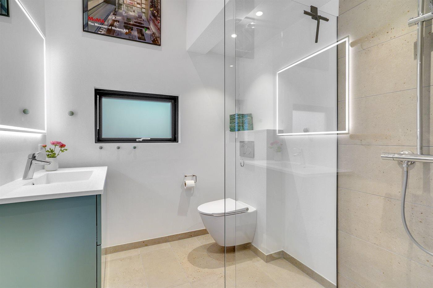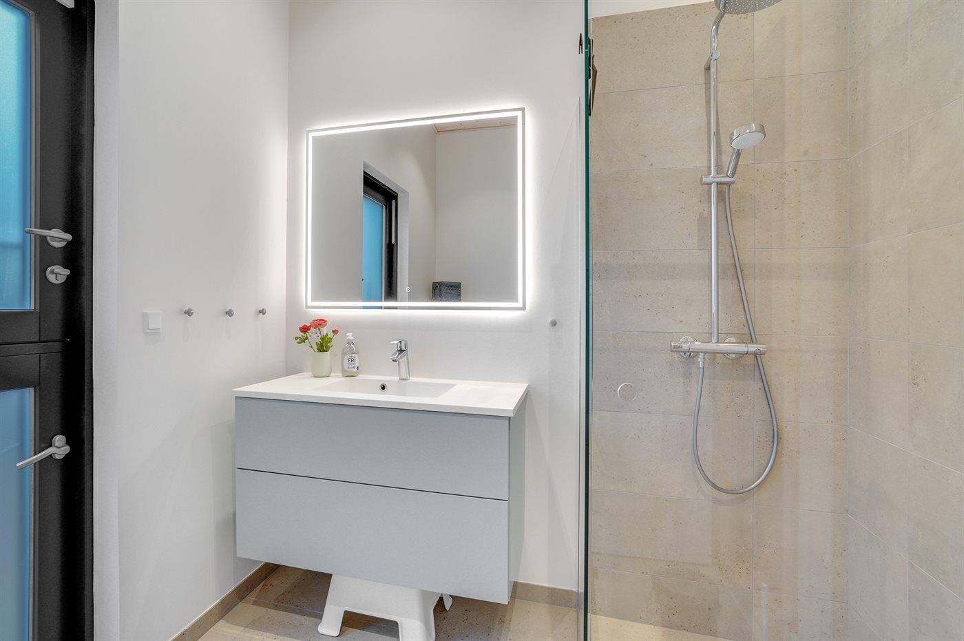 Der er 2 badeværelser med bruseniche og 2 toiletter. Der er gulvvarme på 2 badeværelser.
